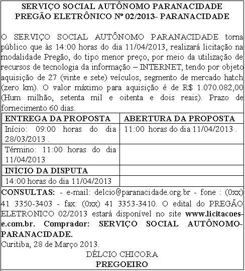 Autorizações para Licitações O SERVIÇO SOCIAL AUTÔNOMO PARANACIDADE torna público que às 14:00 horas do dia 11/04/2013, realizará licitação na modalidade Pregão, do tipo menor preço, por meio da utilização de recursos de tecnologia da informação - INTERNET. 01/01/1970 - 13:10 Compartilhe: Voltar Início Imprimir Baixar
