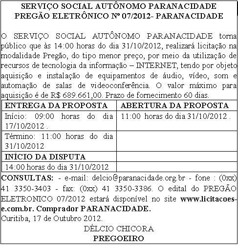 Autorizações para Licitações PREGÃO ELETRÔNICO Nº 07/2012 - Aquisição e instalação de equipamentos de áudio, vídeo, som e automação de salas de videoconferência. 19/10/2012 - 16:40 Compartilhe: Voltar Início Imprimir Baixar