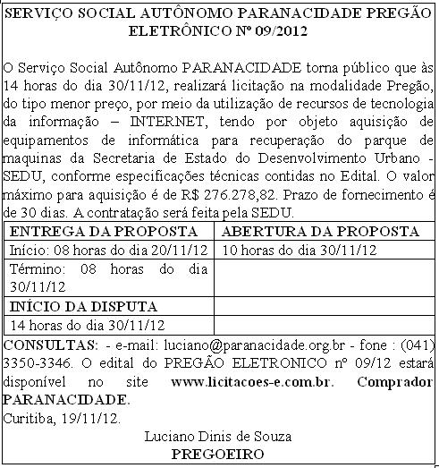 Autorizações para Licitações PREGÃO ELETRÔNICO Nº 09/2012 aquisição de equipamentos de informática para recuperação do parque de maquinas 28/11/2012 - 14:02 Compartilhe: Voltar Início Imprimir Baixar