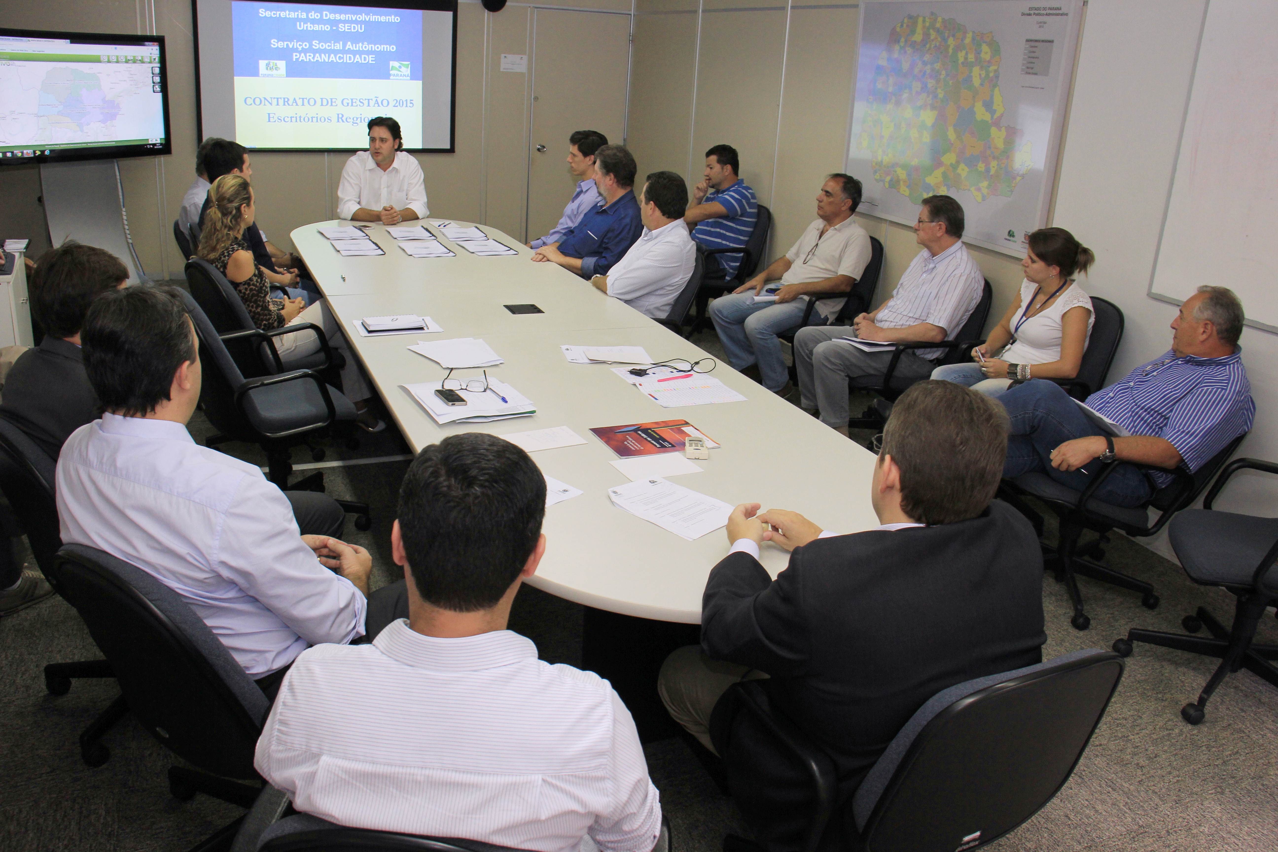 Na busca de uma gestão mais ágil, eficiente e eficaz, com políticas de metas e resultados de excelência, o secretário do Desenvolvimento Urbano (SEDU) e também superintendente do Serviço Social Autônomo (Paranacidade), Ratinho Junior, reuniu na Sala do Conselho, na tarde desta quarta-feira, 04, os coordenadores dos Escritórios Regionais para assinarem um Contrato de Gestão que atenda o Plano de Ação Estratégica para 2015.