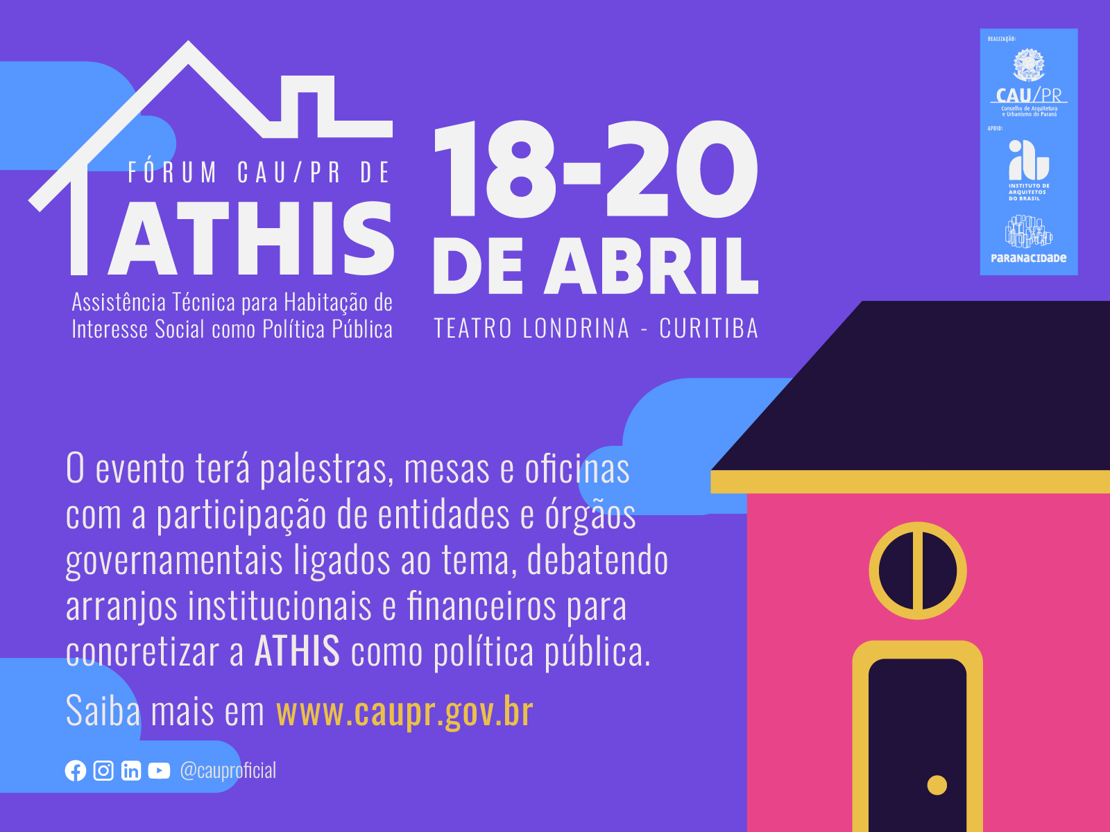 O Conselho de Arquitetura e Urbanismo do Paraná (CAU/PR), com apoio do Instituto de Arquitetos do Brasil (IAB) e do Serviço Social Autônomo Paranacidade, vinculado à Secretaria das Cidades (SECID), realiza nos dias 18, 19 e 20 de abril de 2023, em Curitiba (PR), o “Fórum de ATHIS – Assistência Técnica para Habitação de Interesse Social como Política Pública”. A superintendente executiva do Paranacidade, Camila Mileke Scucato, participa da mesa de abertura, ao lado de outras autoridades. A abertura do evento será às 19 horas, no Teatro Memorial de Curitiba, Rua Claudino dos Santos, 79, no Centro Histórico da Capital.