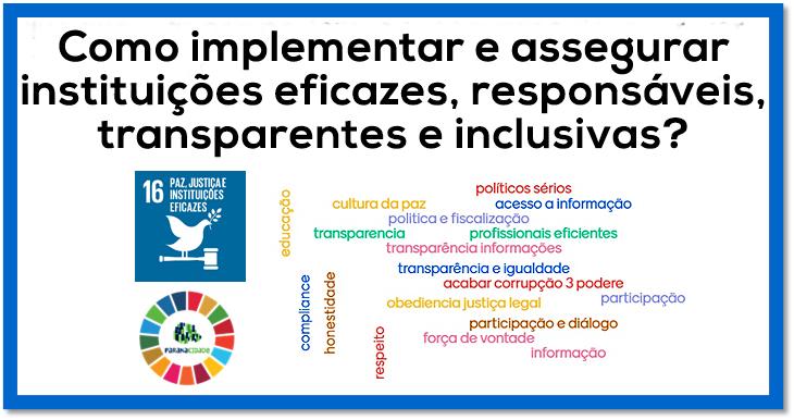 CAMINHOS POSSÍVEIS - Ao final, foram apontados como viabilizadores do ODS 16: a transparência, a promoção da igualdade, a cultura da paz, o acesso à informação, a educação, a legalidade, o combate à corrupção, maior participação nas decisões e melhor fiscalização.
