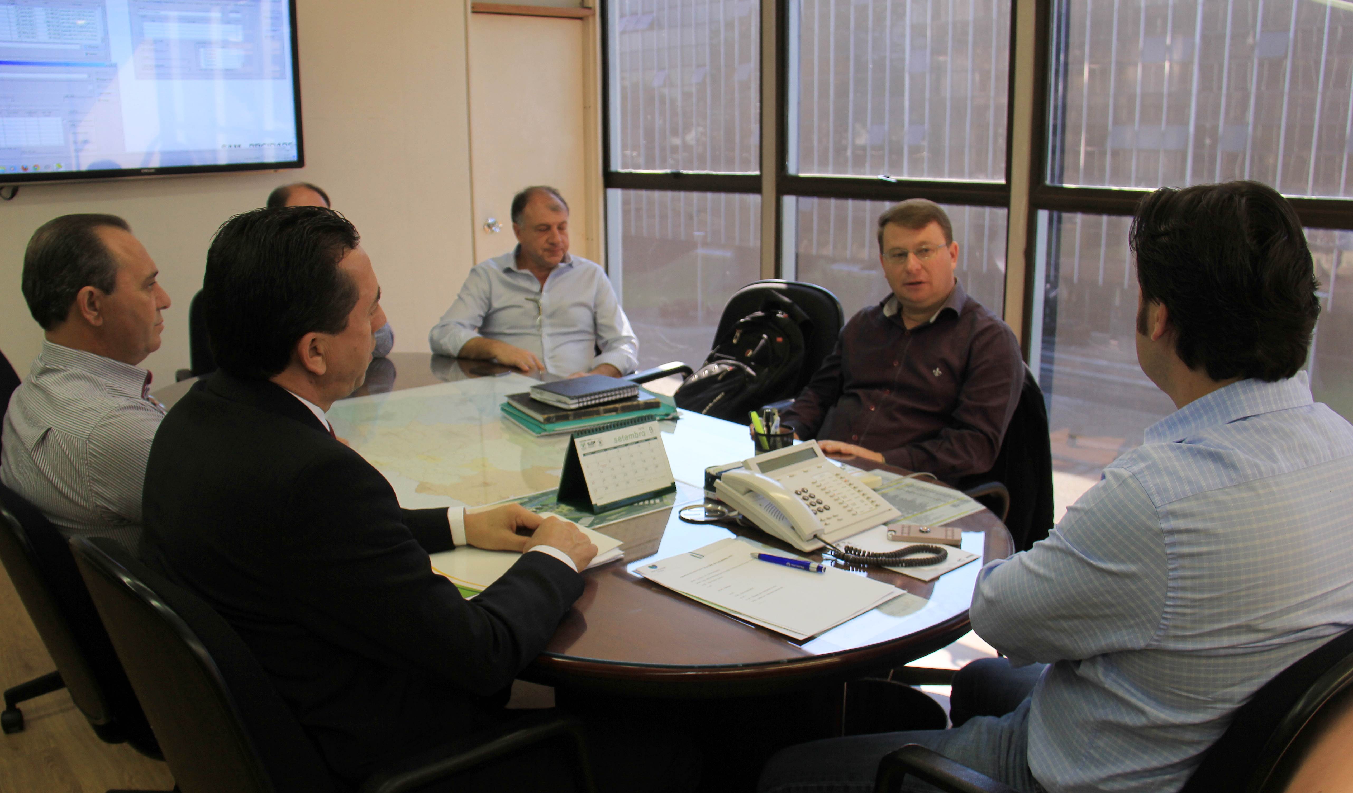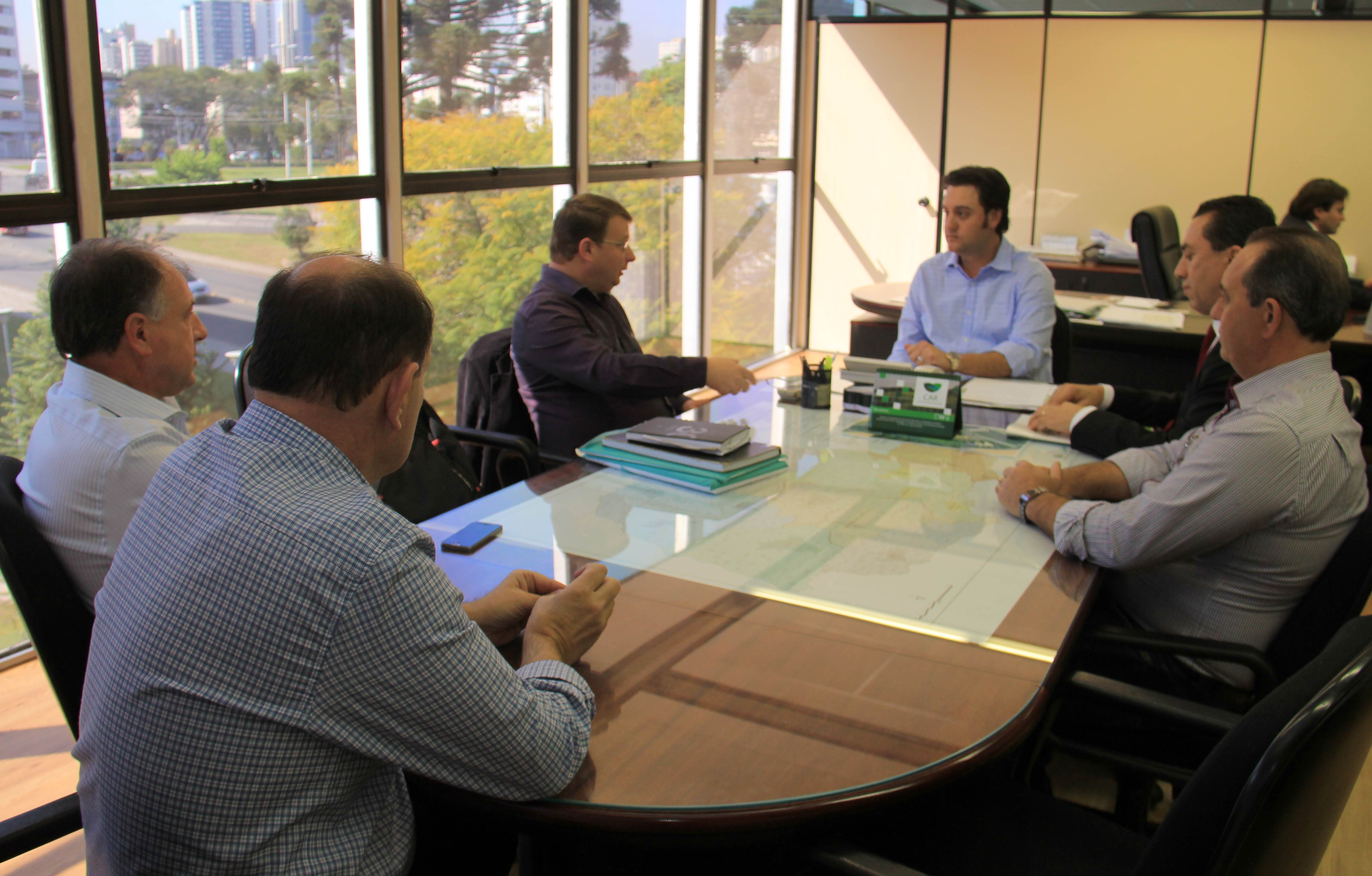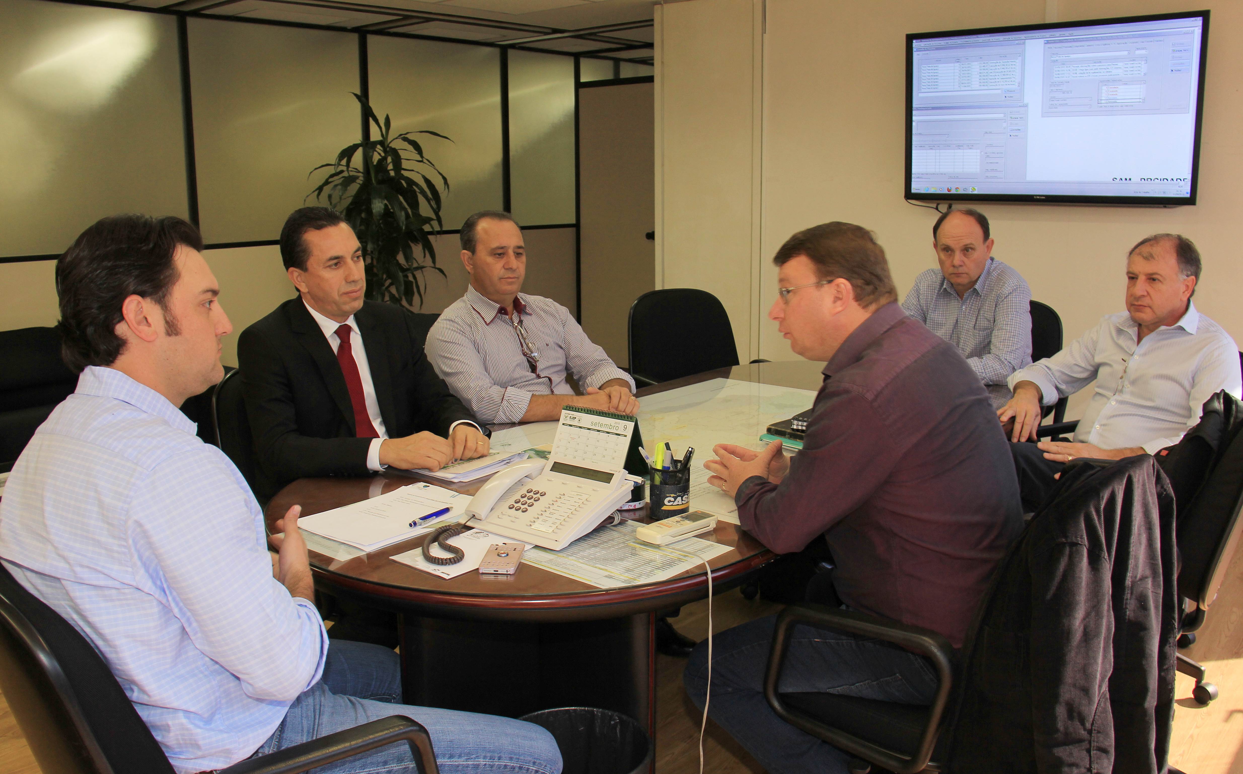 OUTRAS PRIORIDADES – Recebido pelo secretário da Pasta, Ratinho Junior, e pelo diretor geral João Carlos Ortega, o prefeito de Nova Prata do Iguaçu, Adroaldo Hoffelder - acompanhado do chefe de gabinete, Valmir Cristani, mais o deputado estadual Wilmar Reichembach com o seu chefe de gabinete, Valdecir Polettini - esteve na SEDU para verificar os trâmites de seu pedido de financiamento de R$ 2 milhões, pelo SFM. Hoffelder quer reformar a Prefeitura Municipal, executar pavimentação em alguns trechos de ruas, construir muros em torno da Escola Municipal Teotônio Villela e da Capela Mortuária – que também precisa de reparos. E, ainda, construir barracões para o Parque Rodoviário. “A maioria dos projetos já estão em análise”, garante. O secretário Ratinho Junior ainda recebeu o prefeito de São João do Ivaí, Fábio Miura. “Vim apenas dar um abraço no secretário e fazer uma foto com o meu edital ”, avisou.