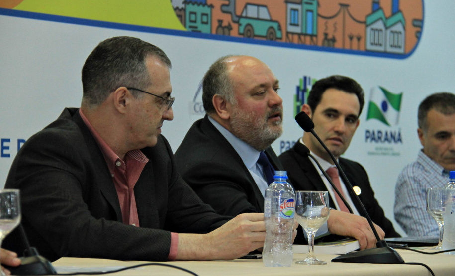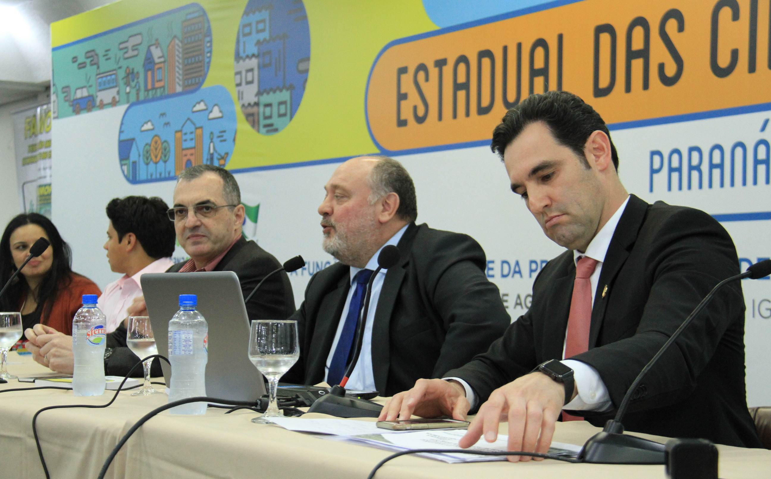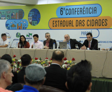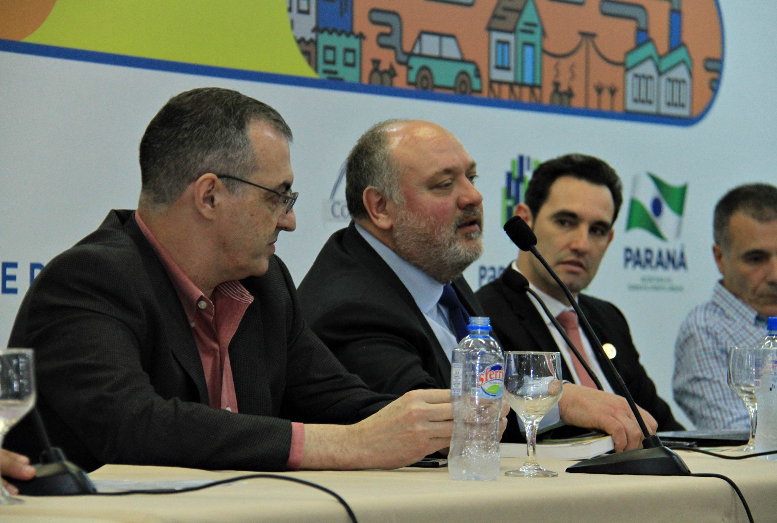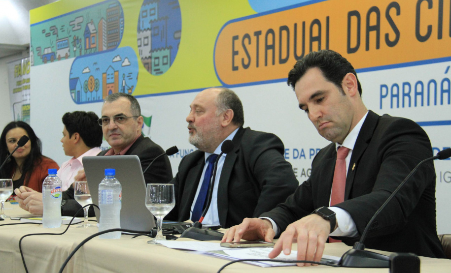 ESTATUTO DA METRÓPOLE - Fizeram parte da mesa de trabalhos o diretor de operações do Serviço Social Autônomo (Paranacidade), e coordenador do Grupo Técnico para o Estatuto da Metrópole pela SEDU e Paranacidade, o engenheiro agrônomo Alvaro Cabrini Junior; o coordenador do Centro de Apoio às Promotorias do Meio Ambiente, de Habitação e Urbanismo, o procurador Alberto Vellozo Machado; o presidente da Comissão de Assuntos Metropolitanos da Assembleia Legislativa do Paraná, o deputado estadual Alexandre Guimarães; o arquiteto e urbanista da SEDU, Clóvis Ultramari; o coordenador executivo desta Conferência, Antônio Weinhardt Junior; do segmento de profissionais, Academia e Pesquisas, a coordenadora Andrea Braga; e representante da ONG Apofilar, Ailton Lima.