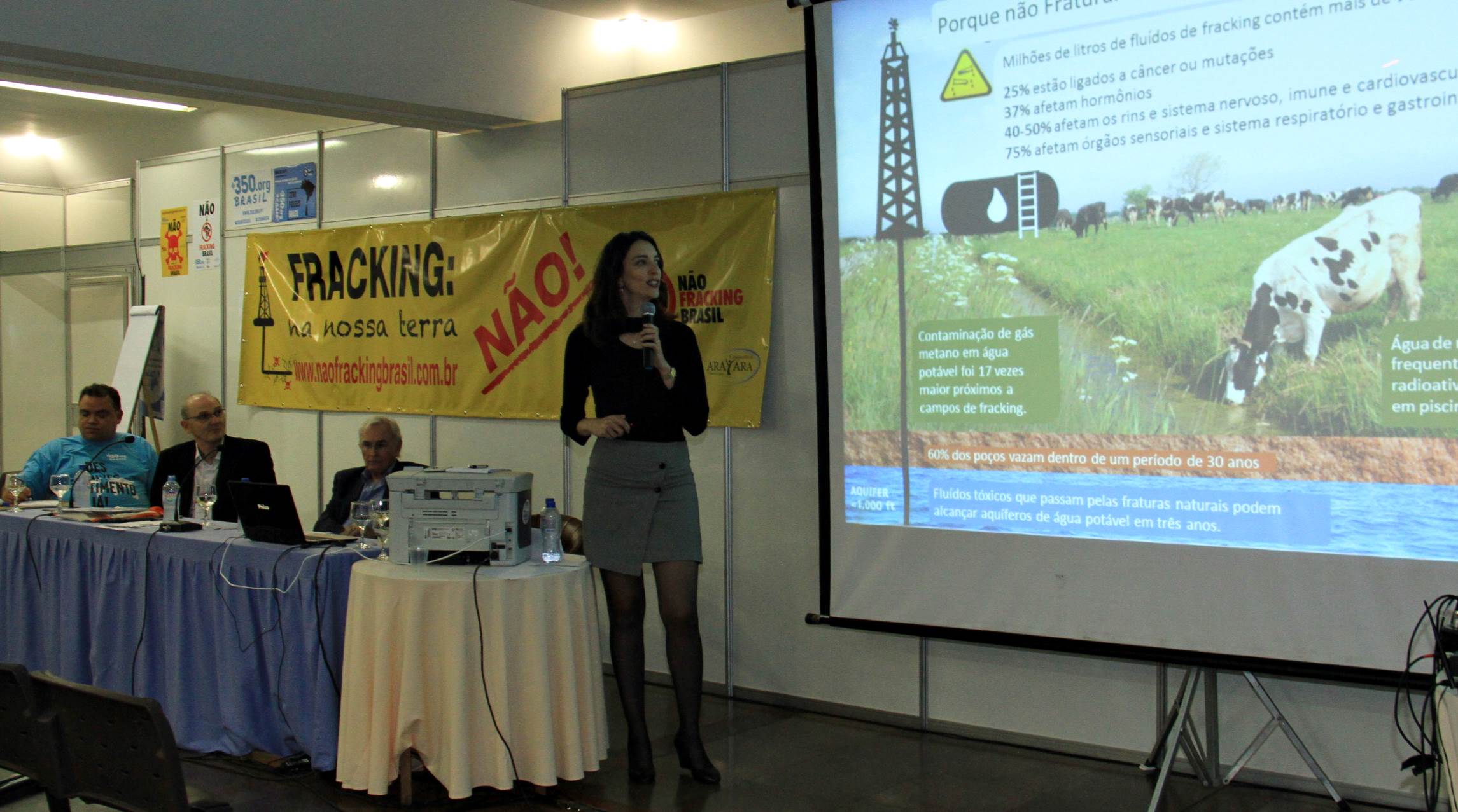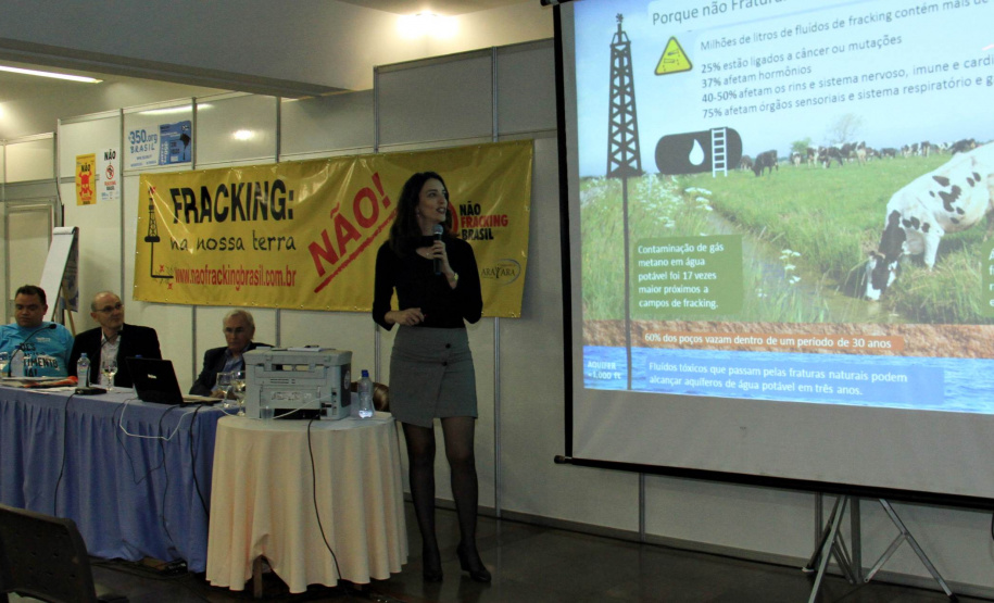 Em seguida, foi a vez da coordenadora nacional da Coalizão Não-Fracking Brasil - Fracking no Mundo, Estudos e Riscos e diretora da ONG 350.org na América Latina, Nicole Oliveira. Ela demonstrou todos os riscos para a saúde pública que a contaminação da água causa. “Eu peço para que todos os gestores, prefeitos dos municípios, guardem bem essas informações no momento de tomar uma decisão sobre o Fracking. Este método oferece 30% mais riscos de morte de recém-nascidos, entre 0-28 dias de vida. Além disso, se nós praticarmos o Fracking no Brasil, aumentaremos ainda mais a emissão de gases do efeito estufa e passaremos de 5º, para 3º País mais poluente do mundo”, adiantou.