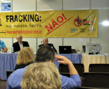 FRACKING – No Seminário sobre Fracking, participantes da 6ª Conferência Estadual das Cidades aprenderam e discutiram sobre a Lei Estadual nº 18.947/2016, que proíbe, por 10 anos em solo paranaense, a concessão de alvará ou de licença para utilização e pesquisa do solo com a finalidade de exploração do gás de xisto pelo método do Fracking - fraturamento hidráulico. Para que esta proibição seja ampliada por mais anos, ainda faltam 104 municípios paranaenses aderirem à este Projeto de Lei. Portanto, o Seminário visou a conscientização dos gestores públicos destes municípios para que lutem por esta causa.