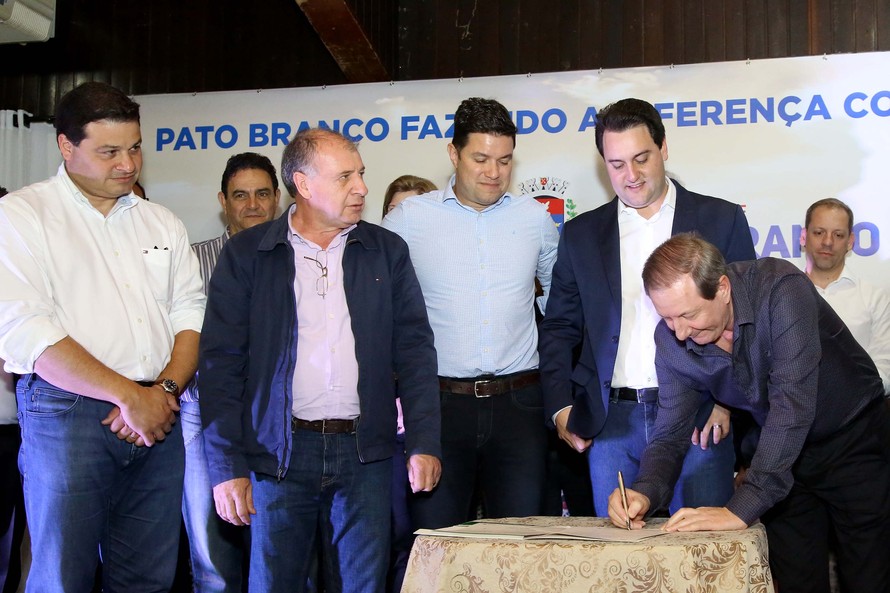 O governador Carlos Massa Ratinho Junior e o secretário do Desenvolvimento Urbano e de Obras Públicas, João Carlos Ortega, assinaram Termo de Adesão no valor de R$ 20 milhões, a fundo perdido, para a construção da nova Prefeitura de Pato Branco. Já, o prefeito Augustinho Zucchi entrará com uma contrapartida de R$ 6 milhões. “Pato Branco tem contribuído, junto com todo o Sudoeste, para o desenvolvimento do Estado. Nós estamos preparando essa Região para crescer ainda mais e melhorar a vida das pessoas. Conseguimos fazer investimentos, graças ao enxugamento da máquina pública. Quando se acaba com aquilo que não é prioridade, sobra dinheiro para aquilo que é”, enfatizou o governador.