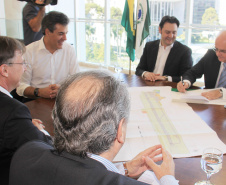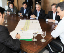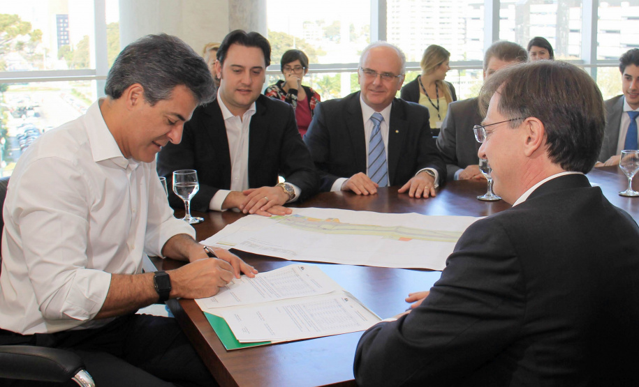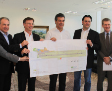 O governador Beto Richa liberou, nesta quarta-feira, 12, mais R$ 26 milhões para a última fase de desapropriações de imóveis que vão permitir a ampliação do aeroporto de Londrina, para uma pista maior, de 2.700 metros, e toda a infraestrutura necessária para receber até 3 milhões de passageiros ao ano. Desta vez, os recursos são liberados pelo Sistema de Financiamento aos Municípios (SFM), da Secretaria de Desenvolvimento Urbano, em parceria com a Fomento Paraná. “Mas na primeira fase, para a desapropriação de 51 imóveis, o Governo do Paraná liberou, à Prefeitura de Londrina, 16 milhões a fundo perdido”, lembrou o secretário da SEDU, Ratinho Junior. Os documentos foram assinados no Palácio Iguaçu, em Curitiba, pelo governador Beto Richa, Ratinho Junior, prefeito Alexandre Kireeff, presidente do Instituto de Desenvolvimento de Londrina (Codel), Bruno Veronesi, Ratinho Junior e pelo diretor de Operações do Setor Público da Fomento Paraná, Omar Sabbag Filho.