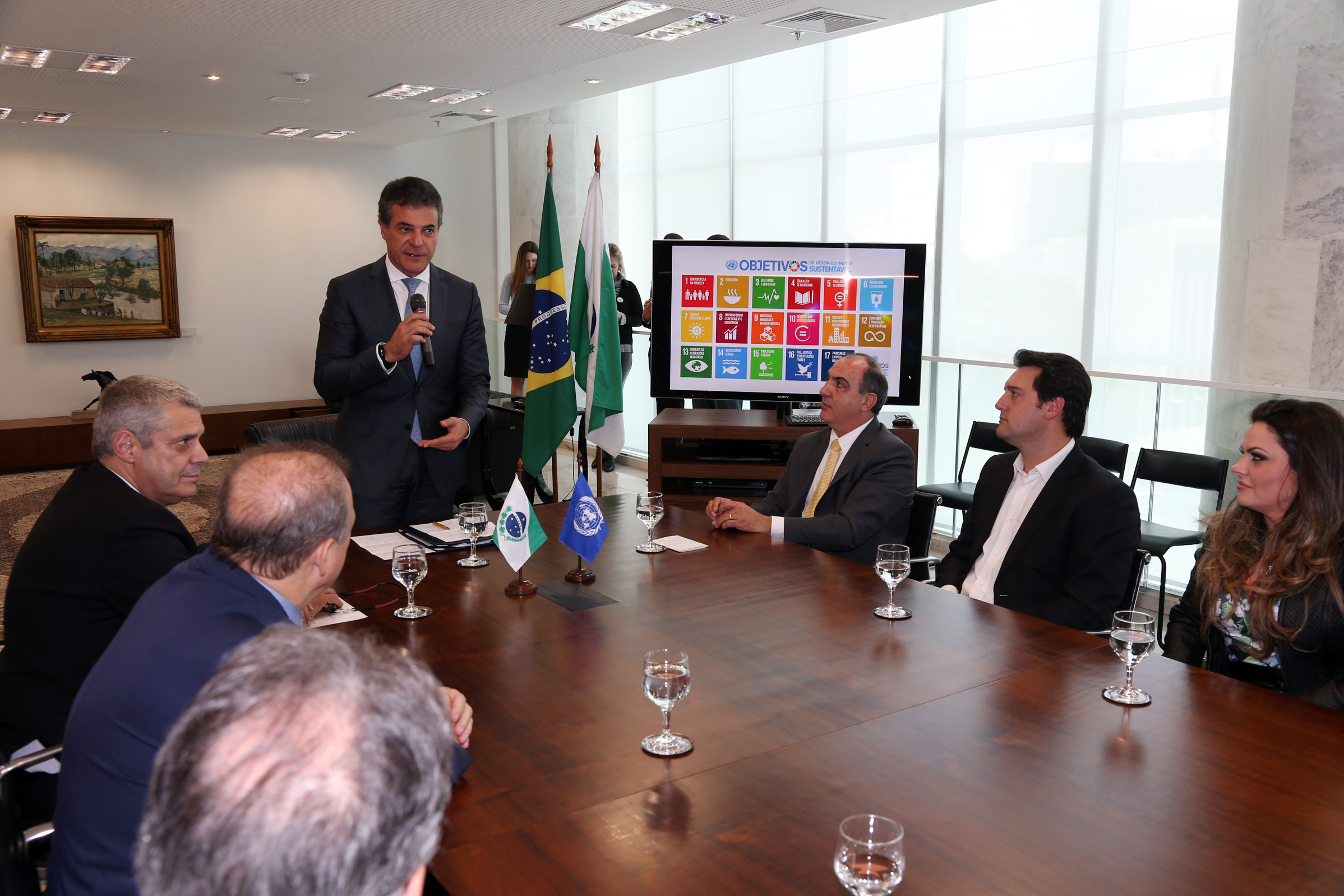 O governador Beto Richa reforçou nesta terça-feira, 08, o empenho do Paraná para o cumprimento dos Objetivos do Desenvolvimento Sustentável (ODS), a agenda global criada pela Organização das Nações Unidas (ONU), a ser atingida até 2030. O Paraná aderiu ao Movimento Nacional ODS, grupo formado para conscientizar e mobilizar a sociedade civil a respeito do tema, em agosto de 2016. E Secretarias de Estado, como a do Desenvolvimento Urbano (SEDU) e outros entes, como a Itaipu Binacional, também aderem e, muitos já fazem parte do compromisso com os ODS.