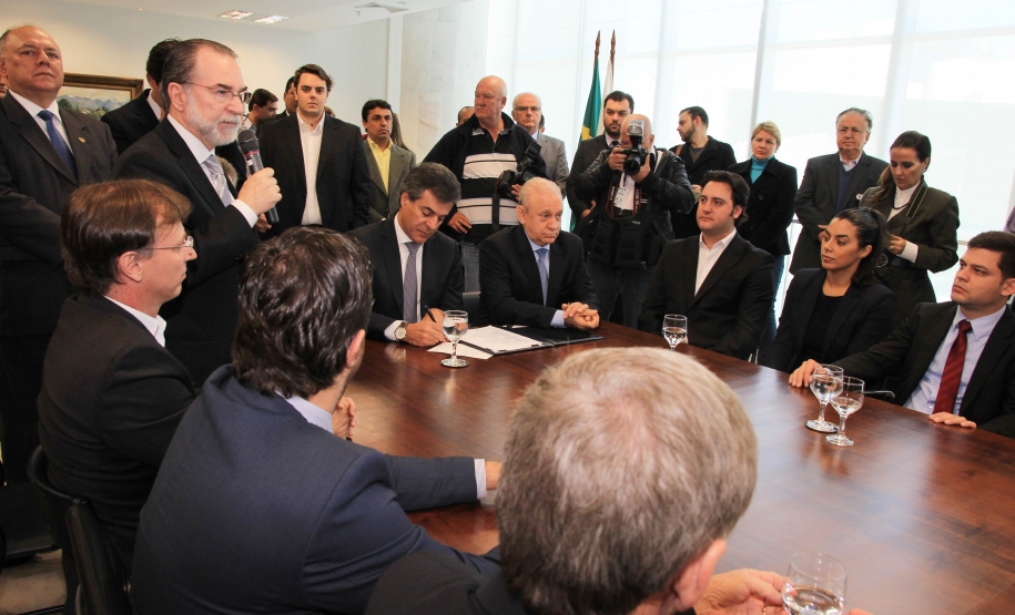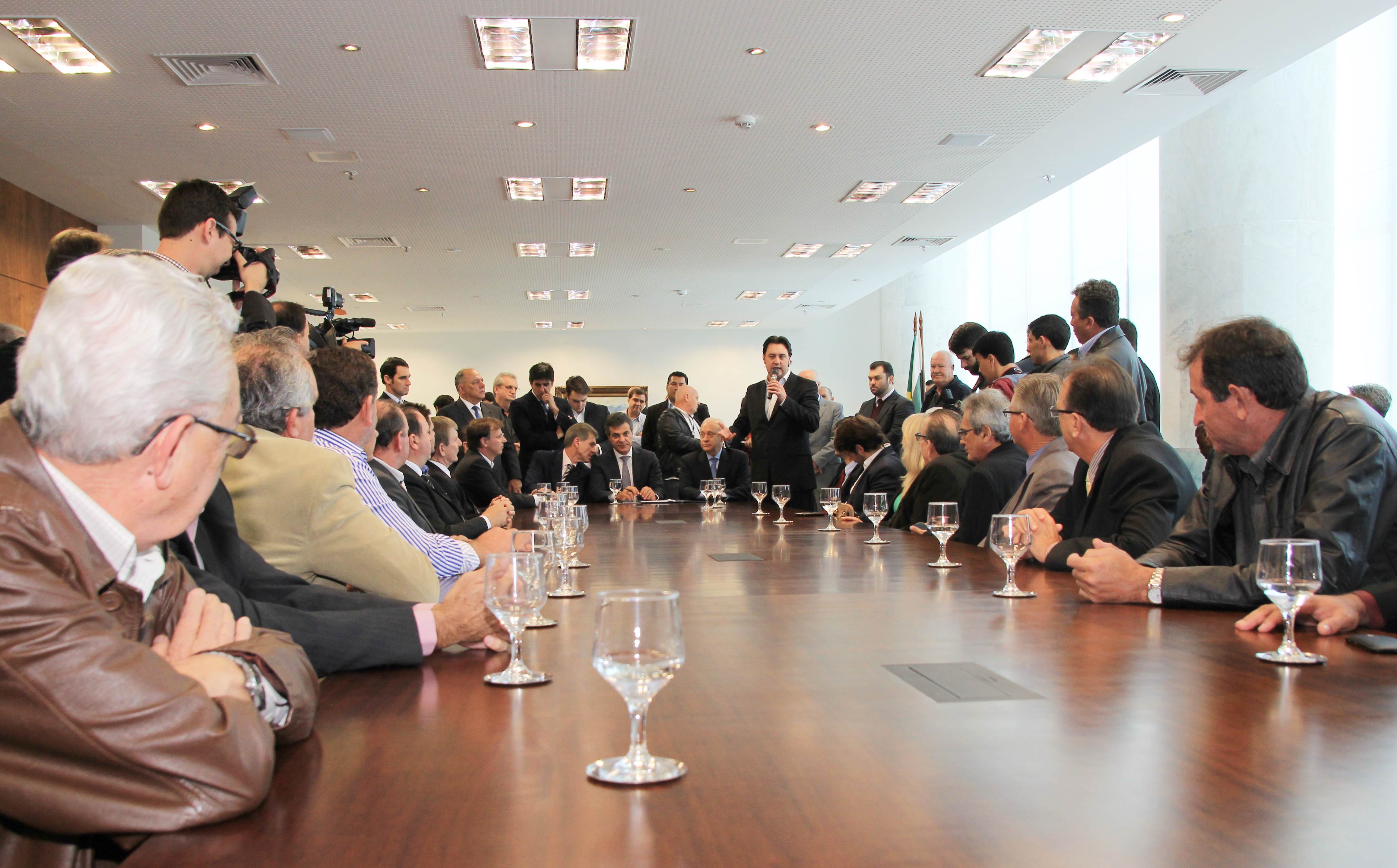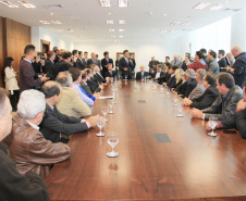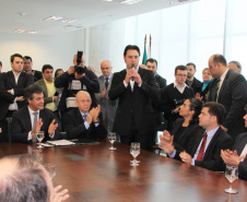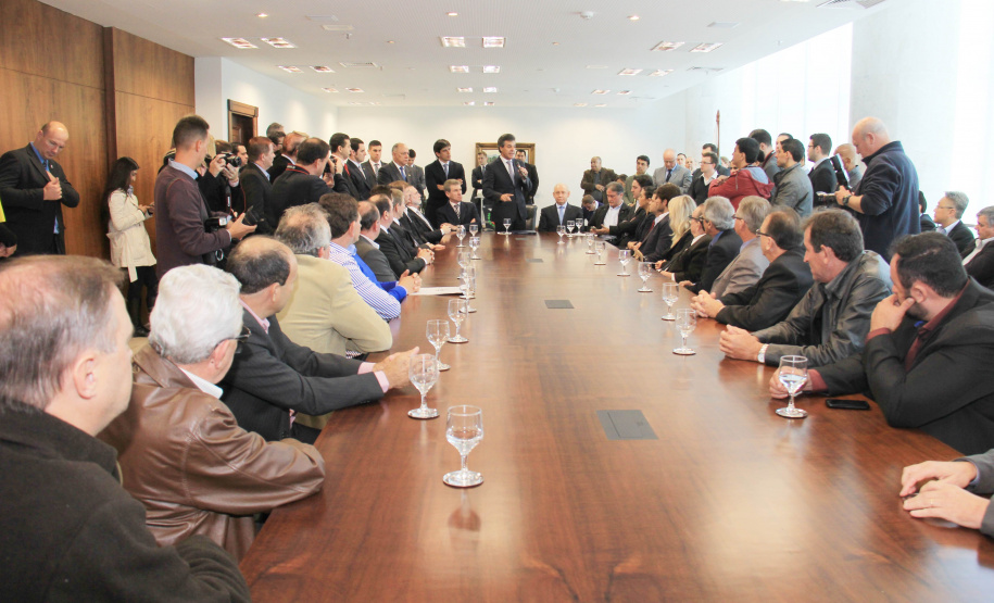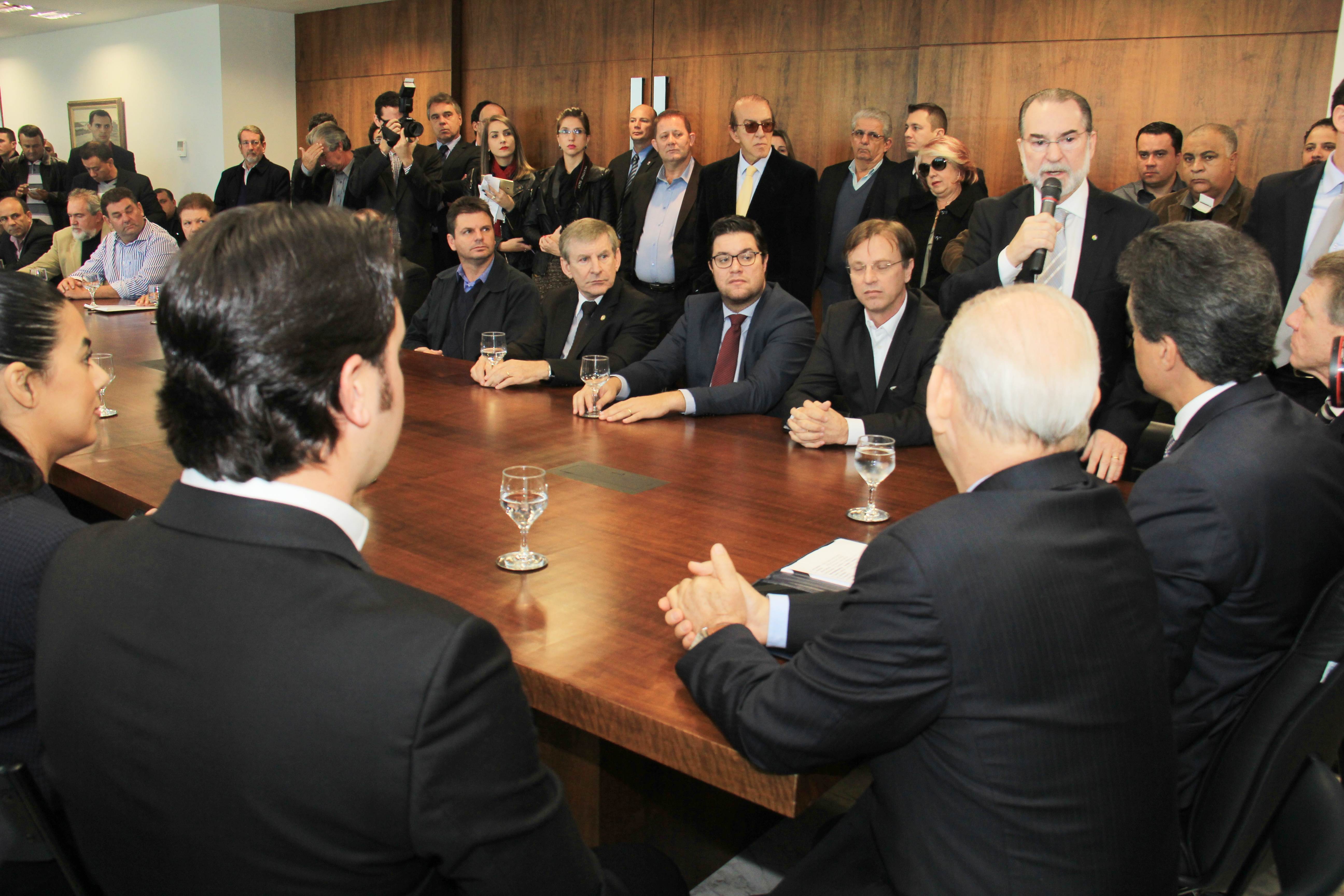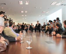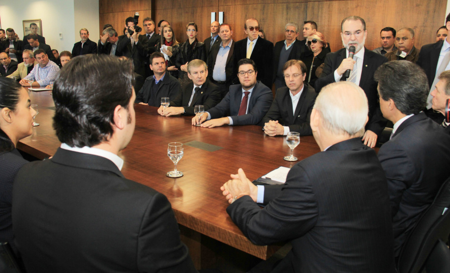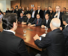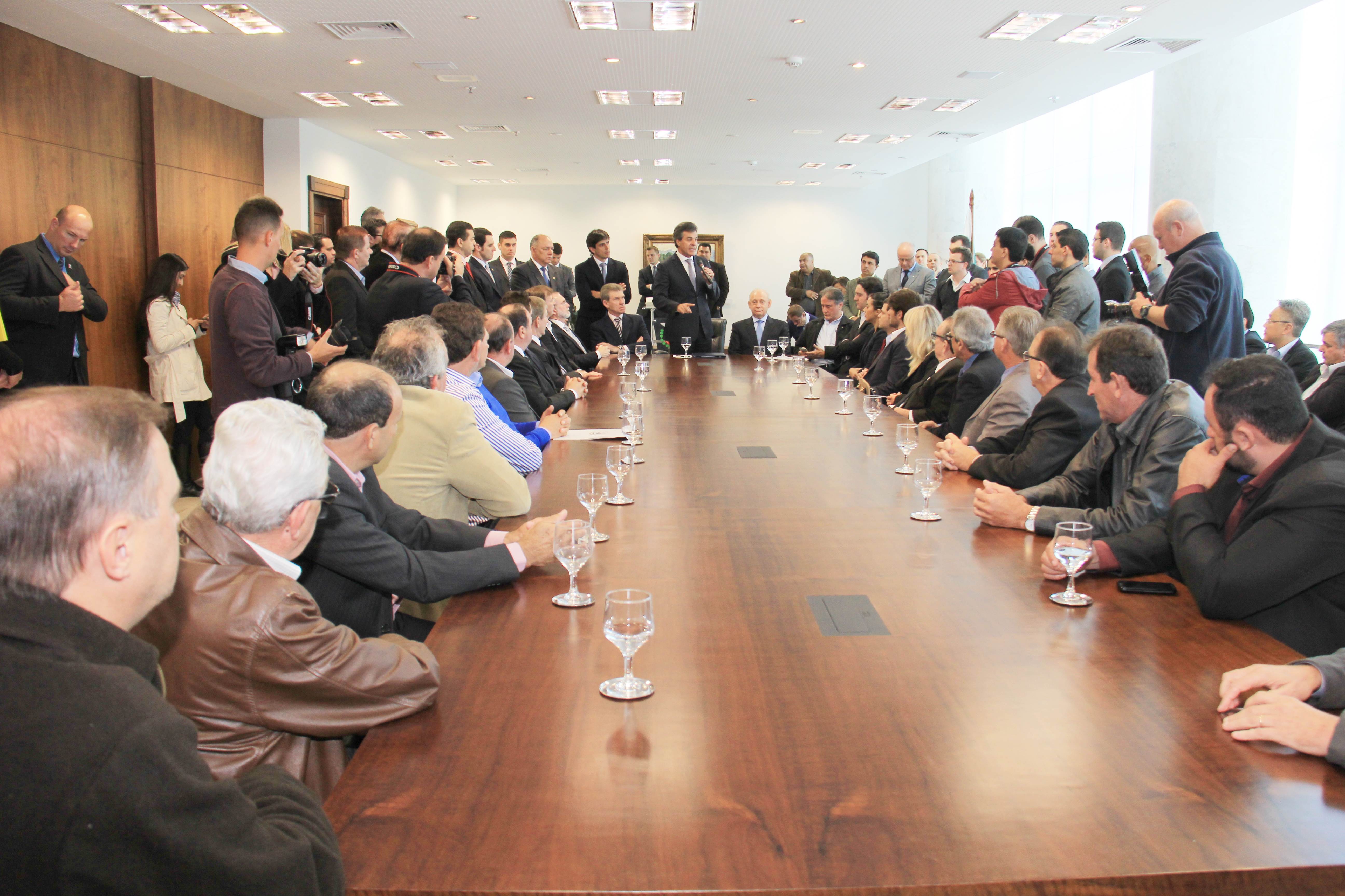 PRESENÇAS - Participaram do encontro, junto ao governador Beto Richa e prefeitos, o secretário-chefe da Casa Civil, Eduardo Sciarra; o presidente da Assembleia Legislativa do Paraná, deputado Ademar Traiano; o secretário-chefe da Casa Militar, Adilson Castilho Casitas; o ex-governador Orlando Pessuti, e os deputados estaduais Luiz Claudio Romanelli, Thiago Amaral, Bernardo Carli, Felipe Francischini, Alexandre Curi, Alexandre Guimarães, Elio Rusch, Tião Medeiros, Francisco Bürher, Guto Silva, Hussein Bakri, Fernando Scanavaca, Jonas Guimarães, José Carlos Schiavinato, Cobra Repórter, Cláudia Pereira e André Bueno.