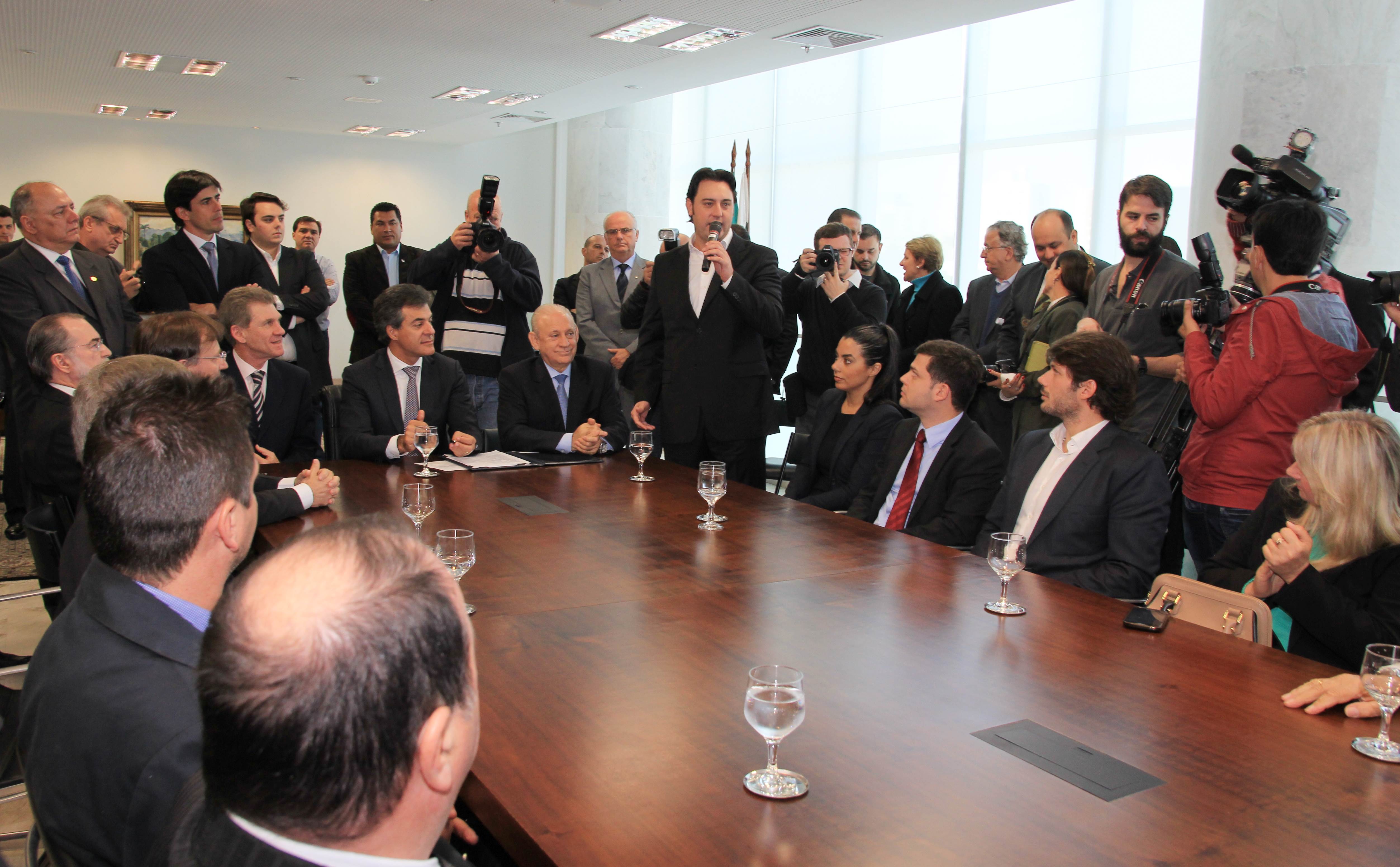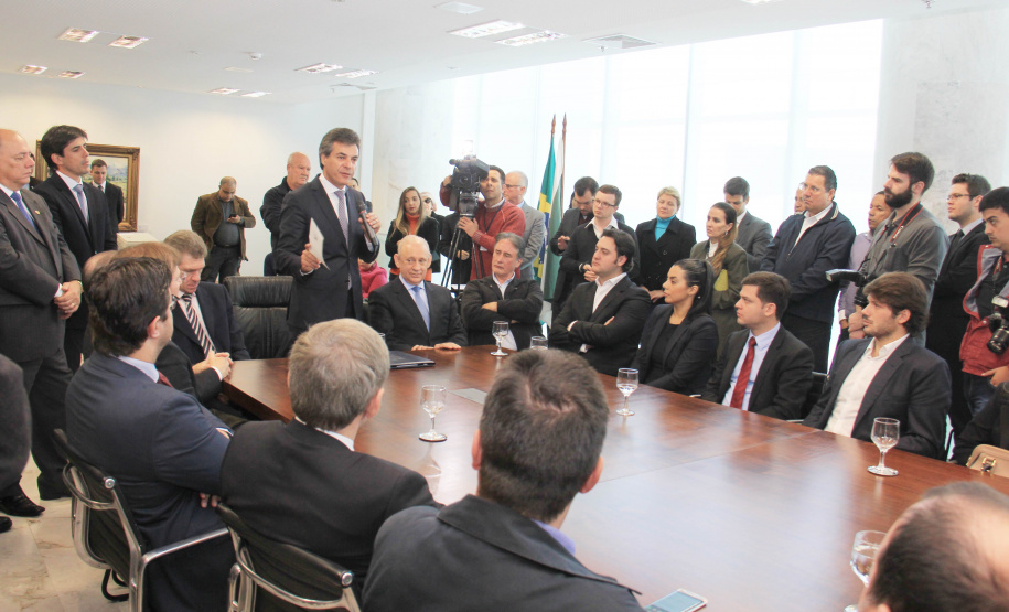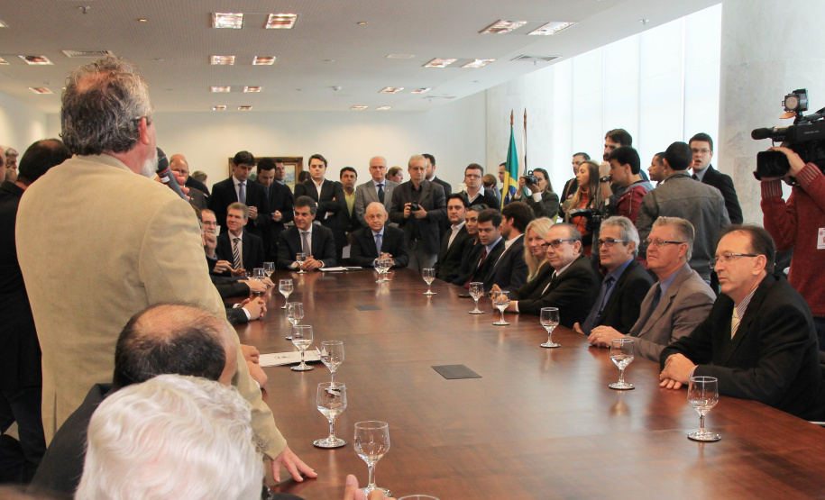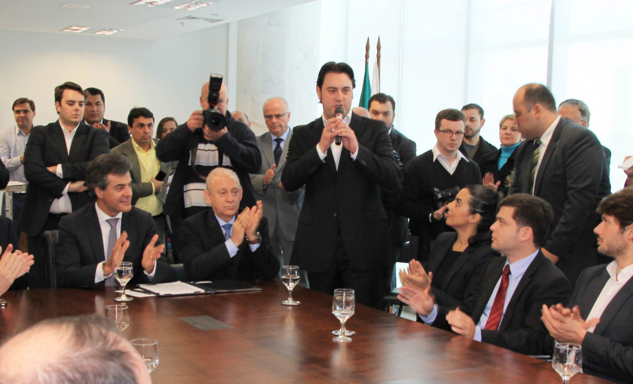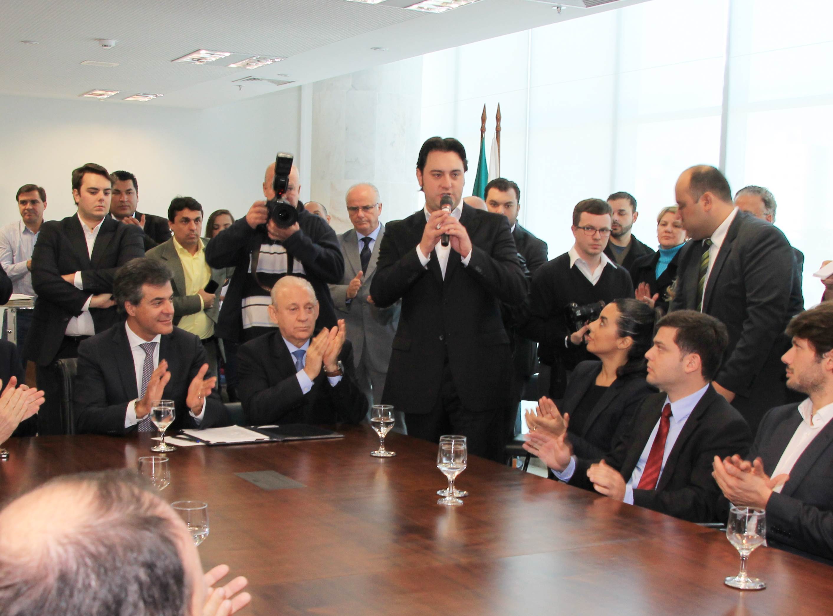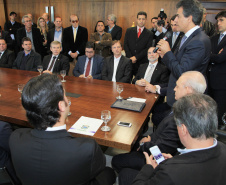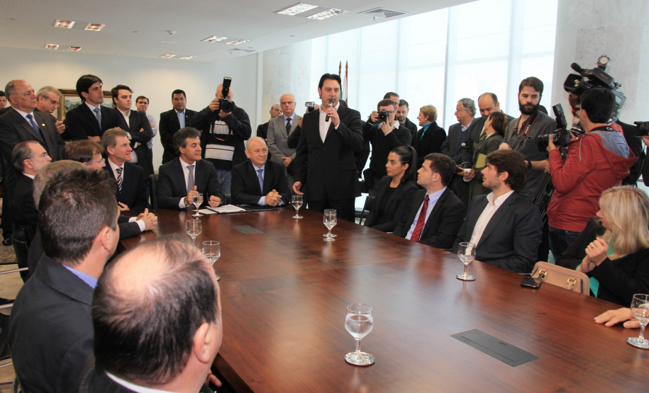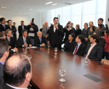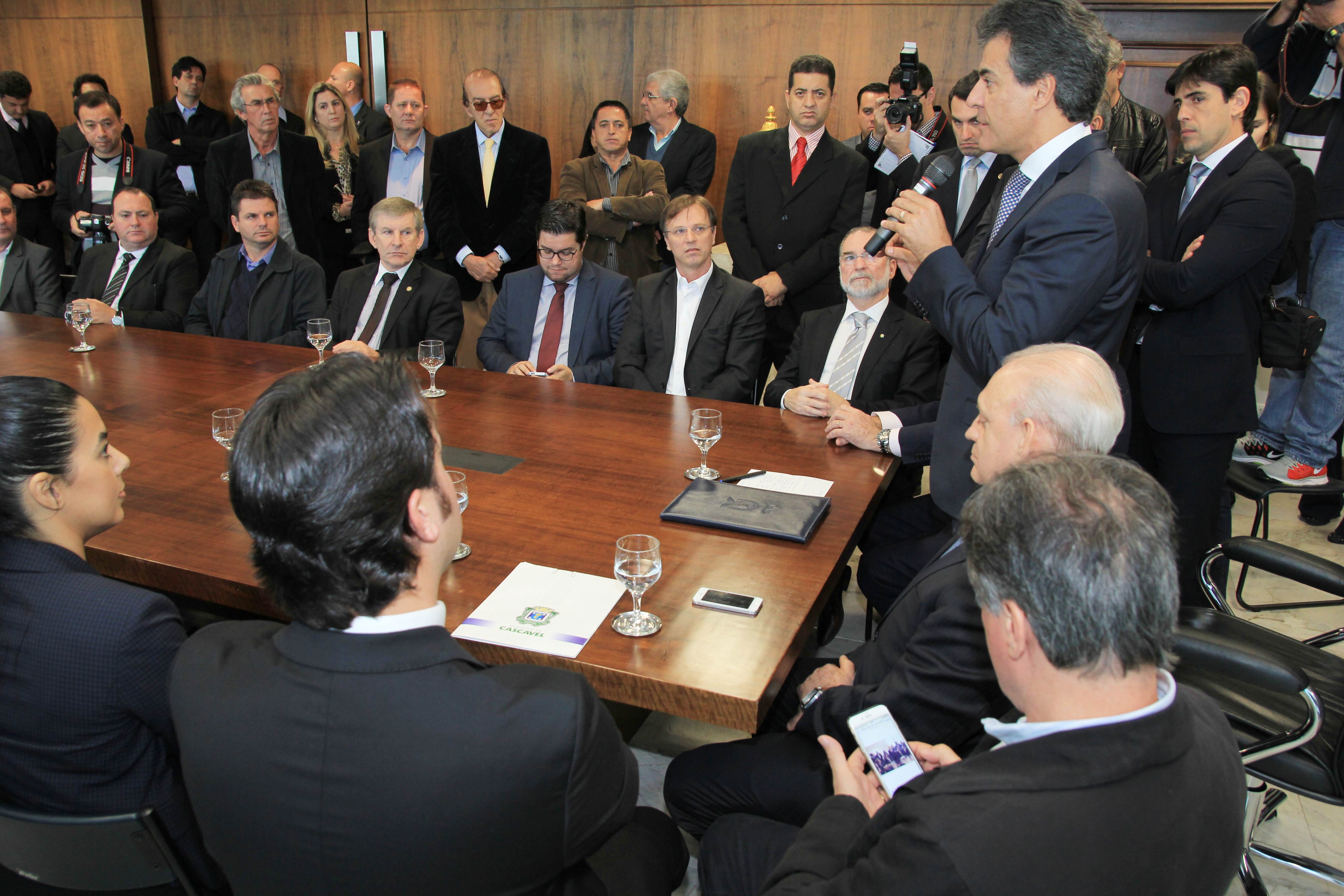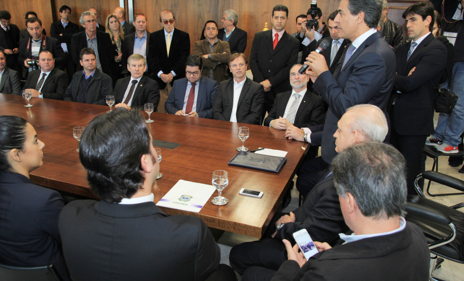 PRESENÇAS - Participaram do encontro, junto ao governador Beto Richa e prefeitos, o secretário-chefe da Casa Civil, Eduardo Sciarra; o presidente da Assembleia Legislativa do Paraná, deputado Ademar Traiano; o secretário-chefe da Casa Militar, Adilson Castilho Casitas; o ex-governador Orlando Pessuti, e os deputados estaduais Luiz Claudio Romanelli, Thiago Amaral, Bernardo Carli, Felipe Francischini, Alexandre Curi, Alexandre Guimarães, Elio Rusch, Tião Medeiros, Francisco Bürher, Guto Silva, Hussein Bakri, Fernando Scanavaca, Jonas Guimarães, José Carlos Schiavinato, Cobra Repórter, Cláudia Pereira e André Bueno.