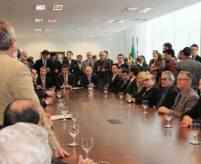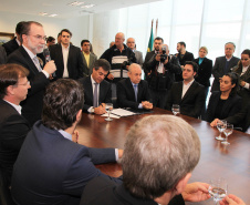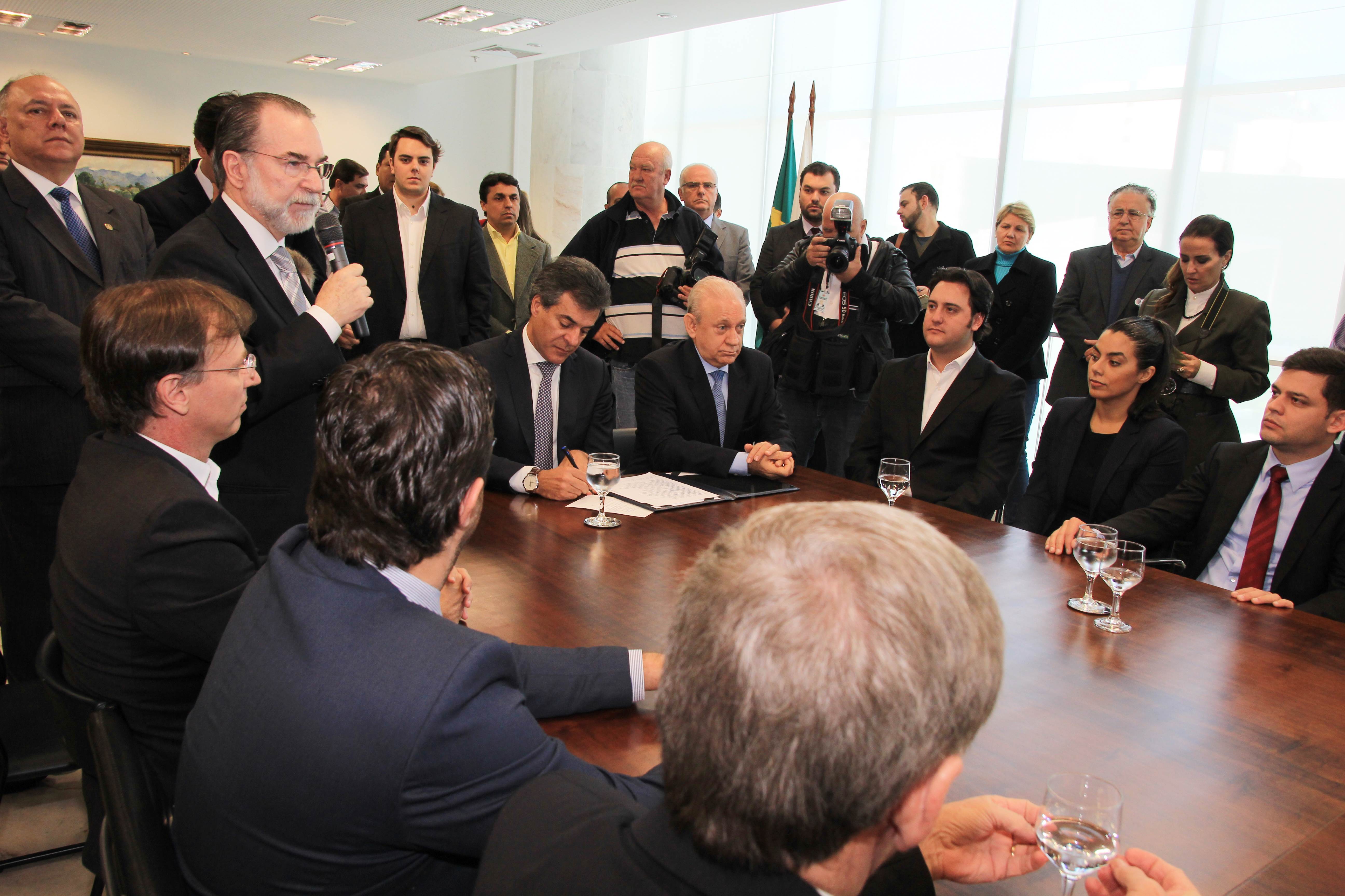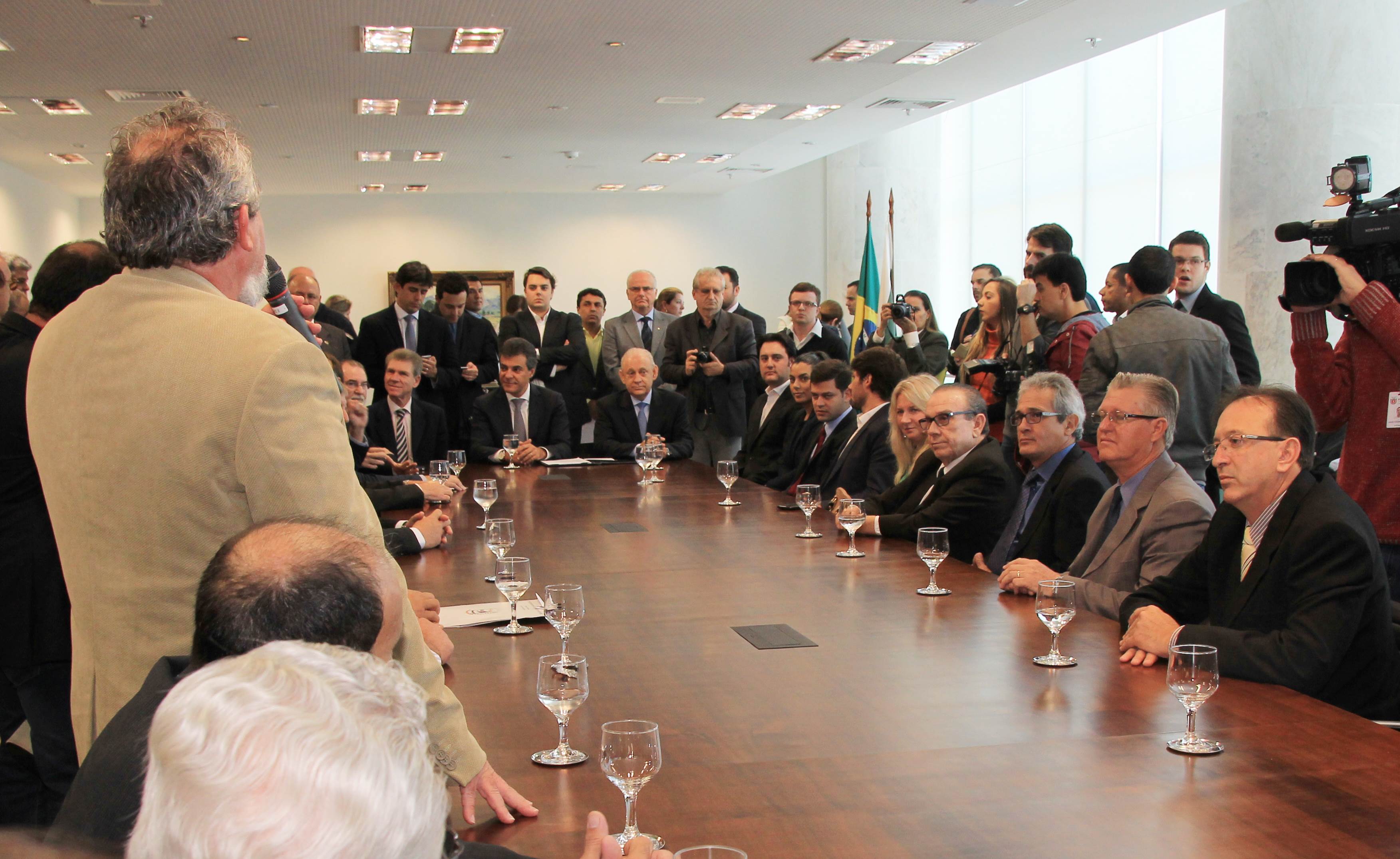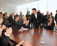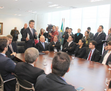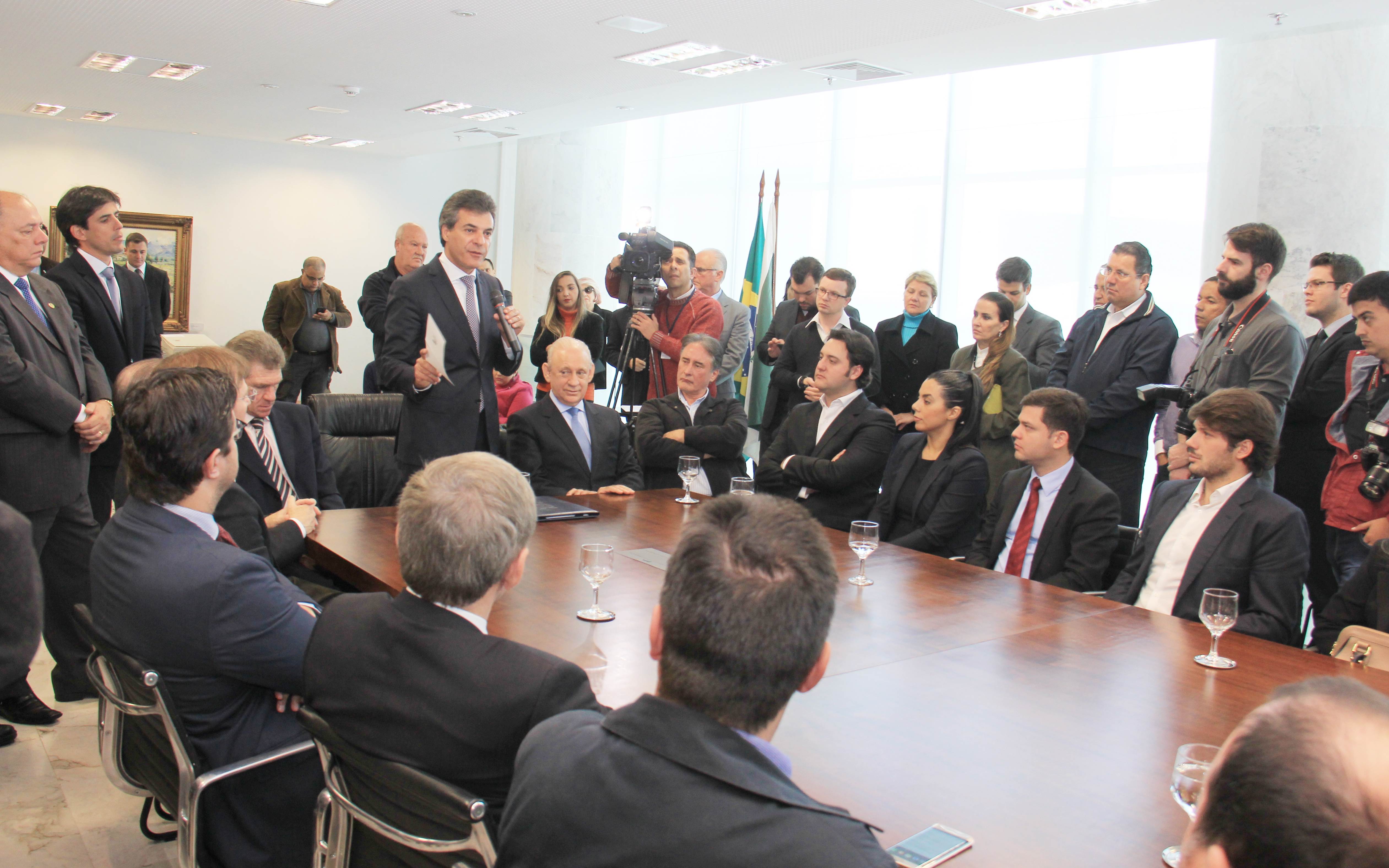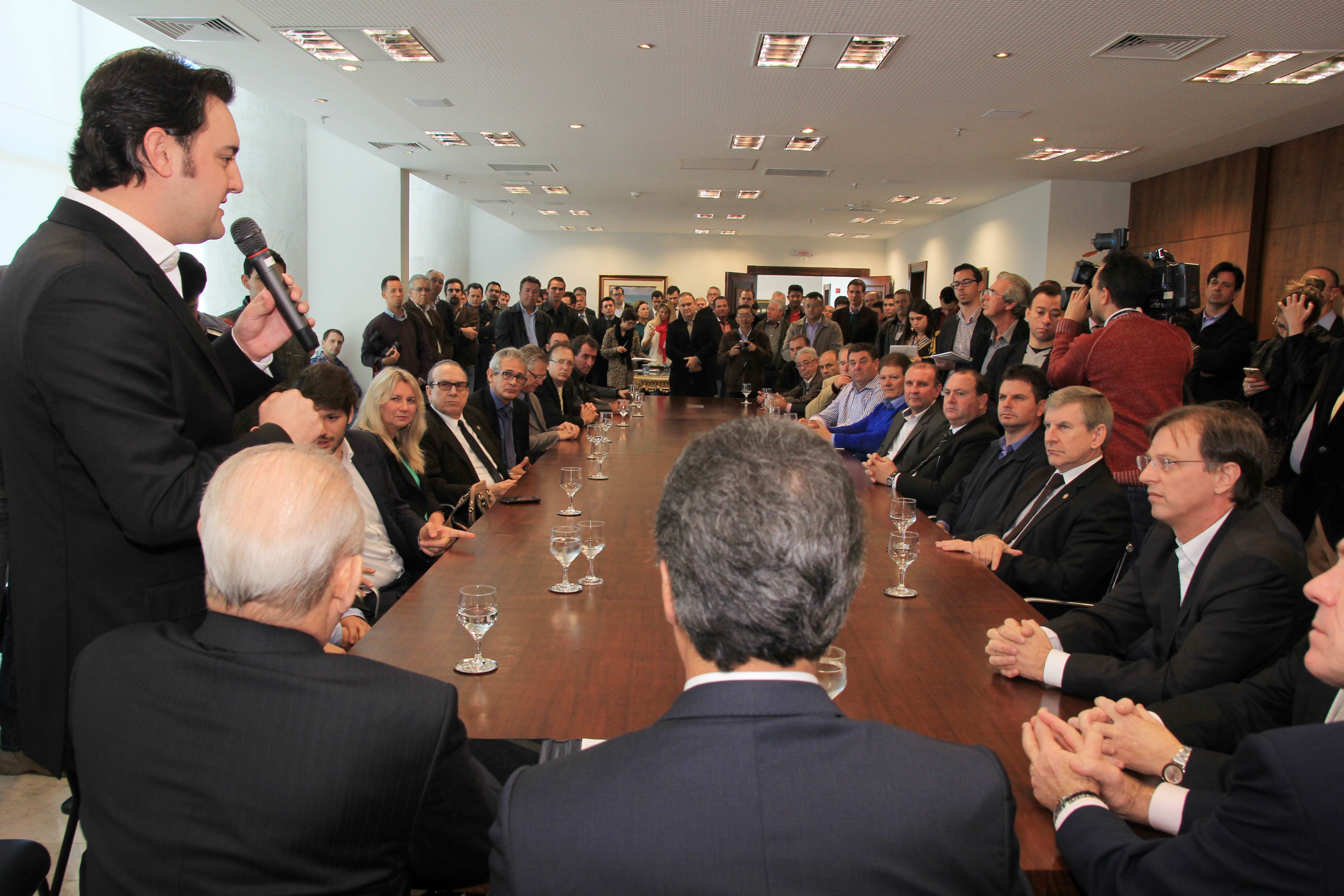 PRESENÇAS - Participaram do encontro, junto ao governador Beto Richa e prefeitos, o secretário-chefe da Casa Civil, Eduardo Sciarra; o presidente da Assembleia Legislativa do Paraná, deputado Ademar Traiano; o secretário-chefe da Casa Militar, Adilson Castilho Casitas; o ex-governador Orlando Pessuti, e os deputados estaduais Luiz Claudio Romanelli, Thiago Amaral, Bernardo Carli, Felipe Francischini, Alexandre Curi, Alexandre Guimarães, Elio Rusch, Tião Medeiros, Francisco Bürher, Guto Silva, Hussein Bakri, Fernando Scanavaca, Jonas Guimarães, José Carlos Schiavinato, Cobra Repórter, Cláudia Pereira e André Bueno.