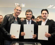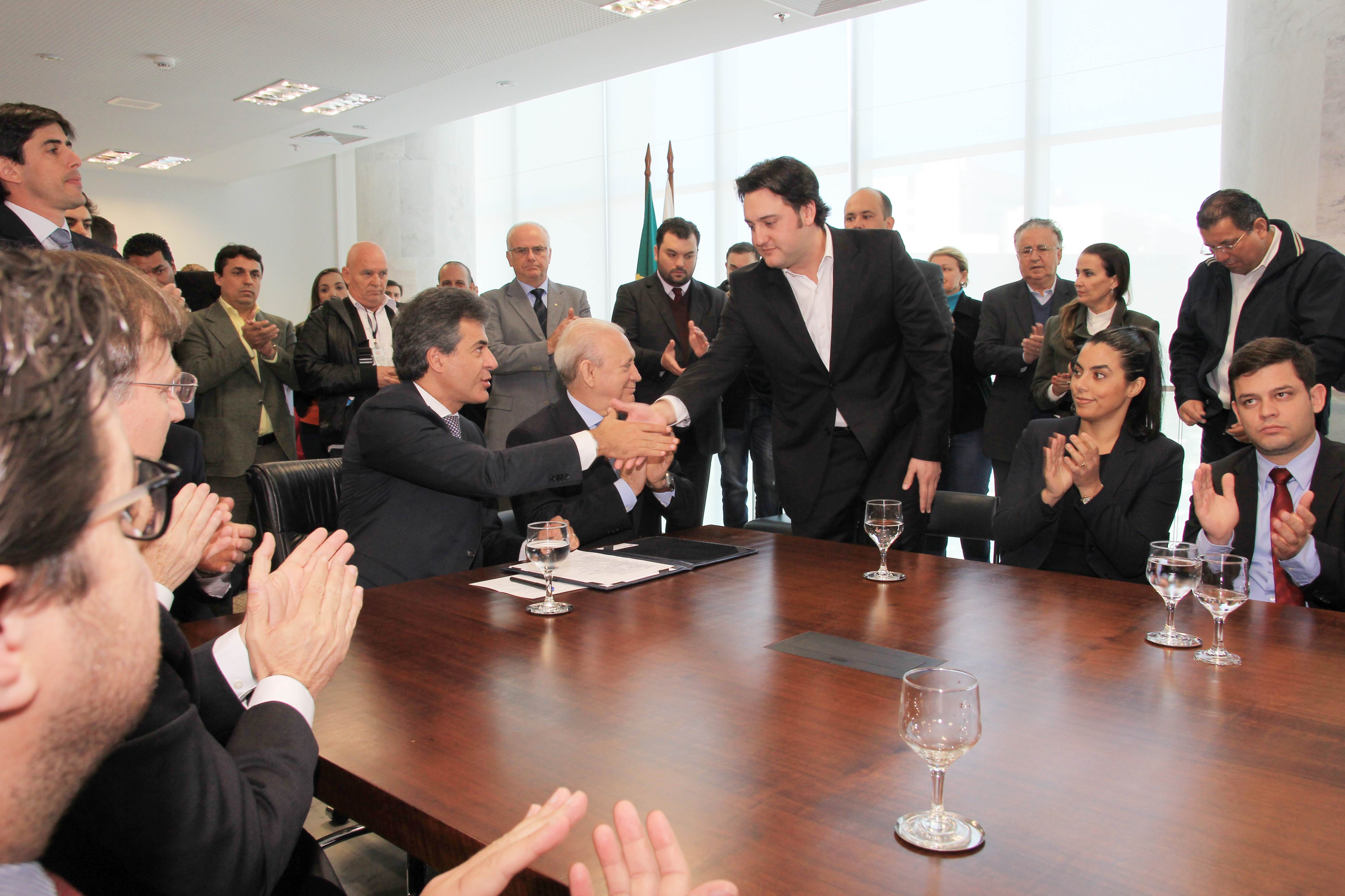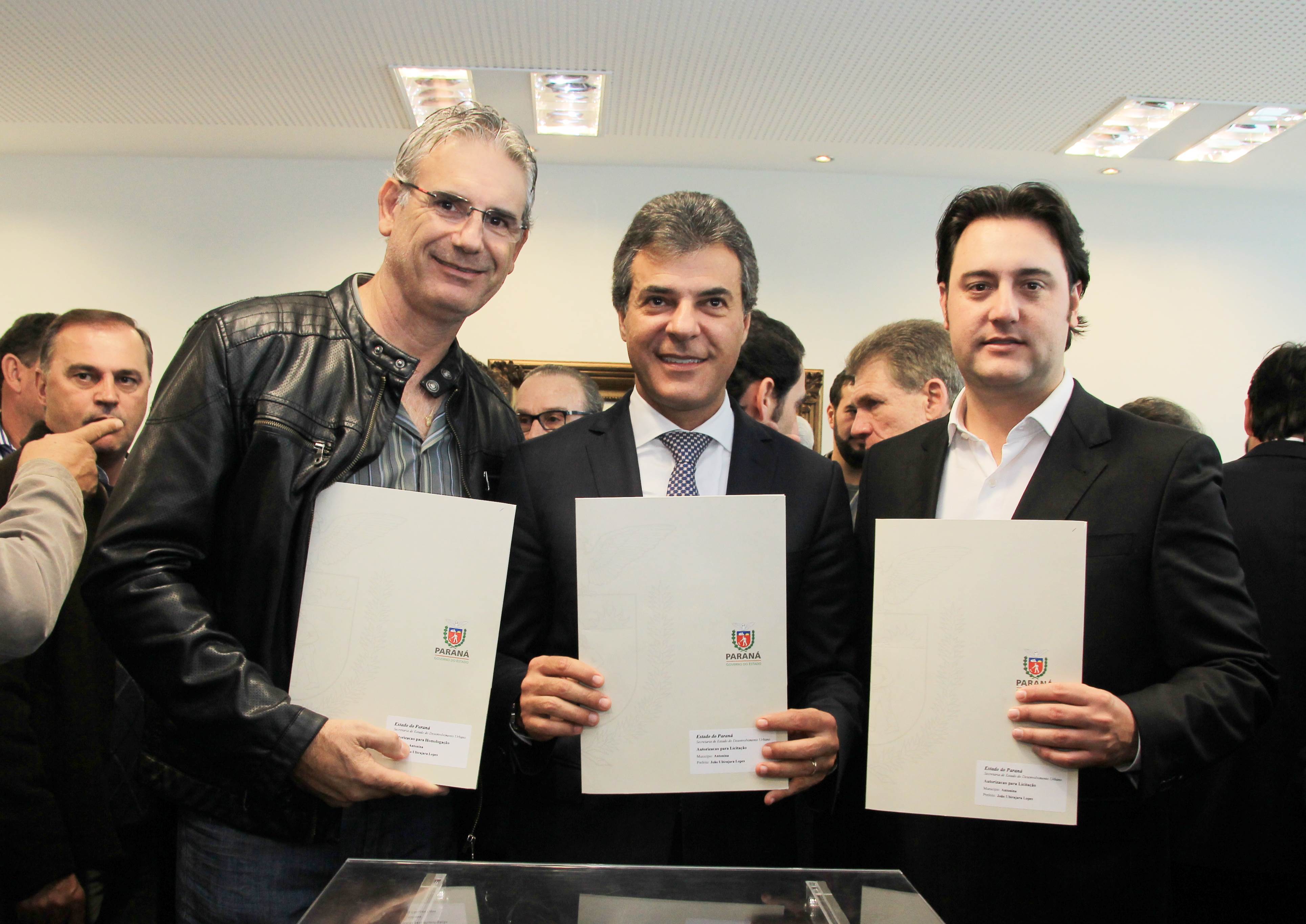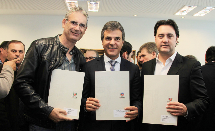 Na manhã desta quarta-feira, 13, o governador Beto Richa e o secretário do Desenvolvimento Urbano (SEDU), Ratinho Junior, receberam prefeitos de diversas Regiões do Paraná para a assinatura de 36 editais, no valor total de mais de R$ 51,7 milhões para investimentos em asfalto, recape, revitalização urbana, iluminação pública, construção de Capela Mortuária, de edifícios para a criação de um Complexo Industrial e para a compra de maquinários, caminhões e móveis a uma Unidade de Saúde. “Estamos fechando um volume de R$ 120 milhões nos primeiros cinco meses do ano. Esta relação com os municípios tem dado bons resultados. Nós conseguimos diminuir o prazo, de oito meses de aprovação dos projetos, para 35 dias. Estamos batendo o recorde de repasses neste ano e, possivelmente, chegaremos em dezembro com o maior volume de recursos repassados para os municípios do Paraná”, afirmou Ratinho Junior.