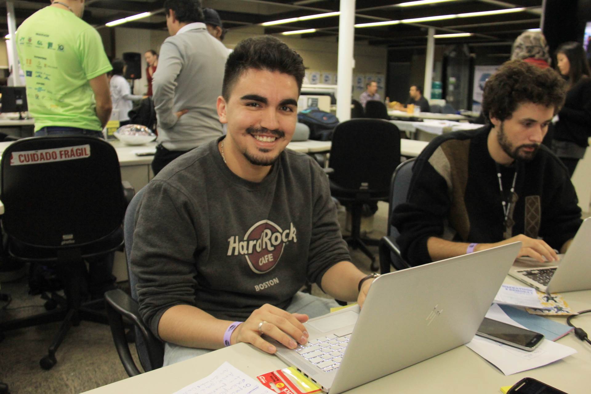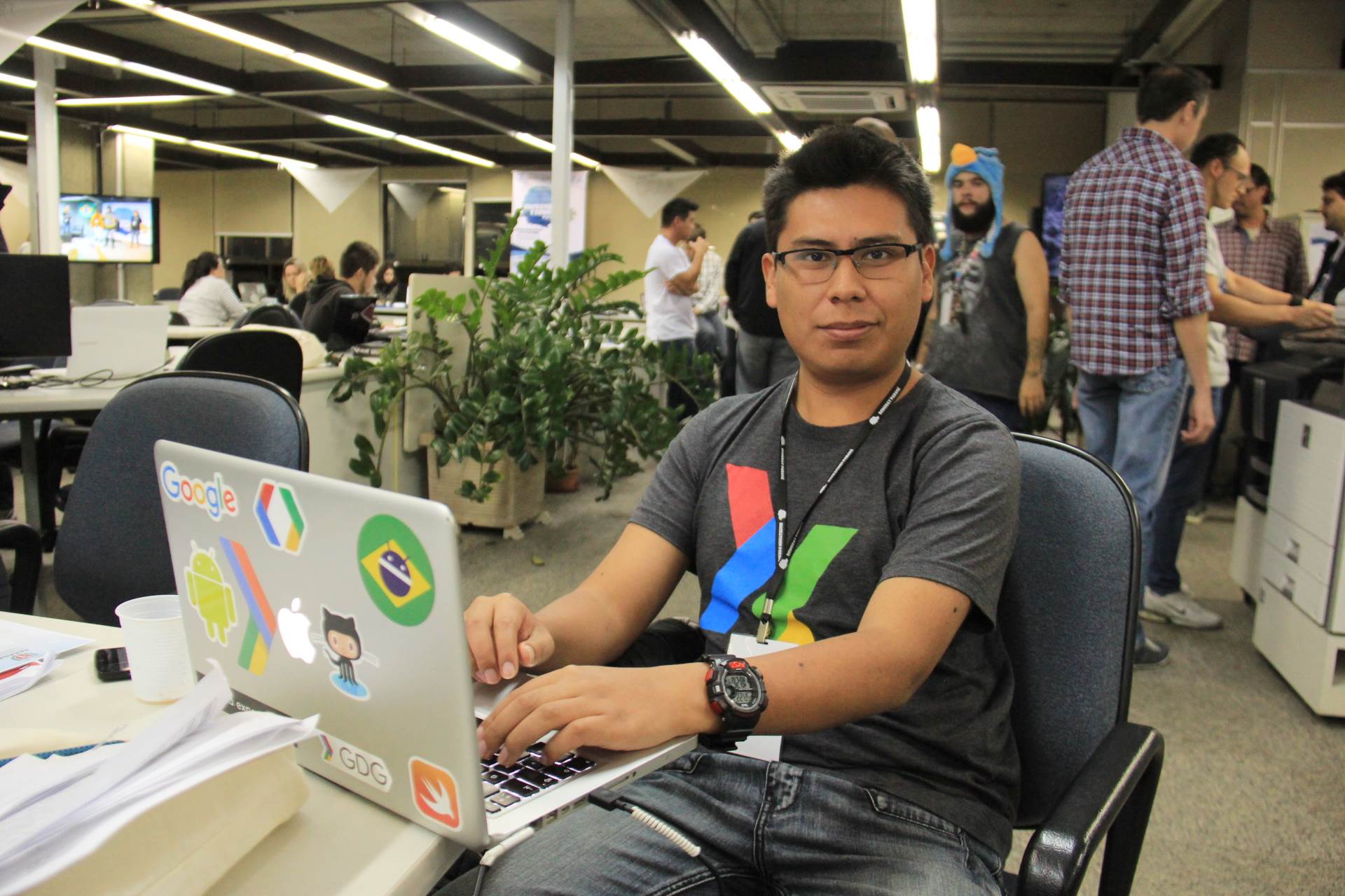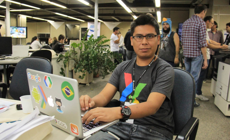 GENTE FELIZ - Além do Diego, o Alvaro Huanca também é estrangeiro, do Peru, mas participa como mentor de desenvolvimento. Ele faz parte do Google Developers Group (GDG) no Peru e há um ano no GDG Curitiba. Huanca disse que já participou de diversos Hackathons no Peru, mas este é o segundo no Brasil. “Eu sempre adorei participar para ensinar e compartilhar informações sobre desenvolvimento. Mas achei muito diferentes os Hackathons no Brasil, porque as pessoas aqui são mais descontraídas e parecem se divertir mais. No Peru os participantes são mais sérios, parece que não se divertem. Estou gostando muito daqui”, afirmou Huanca.