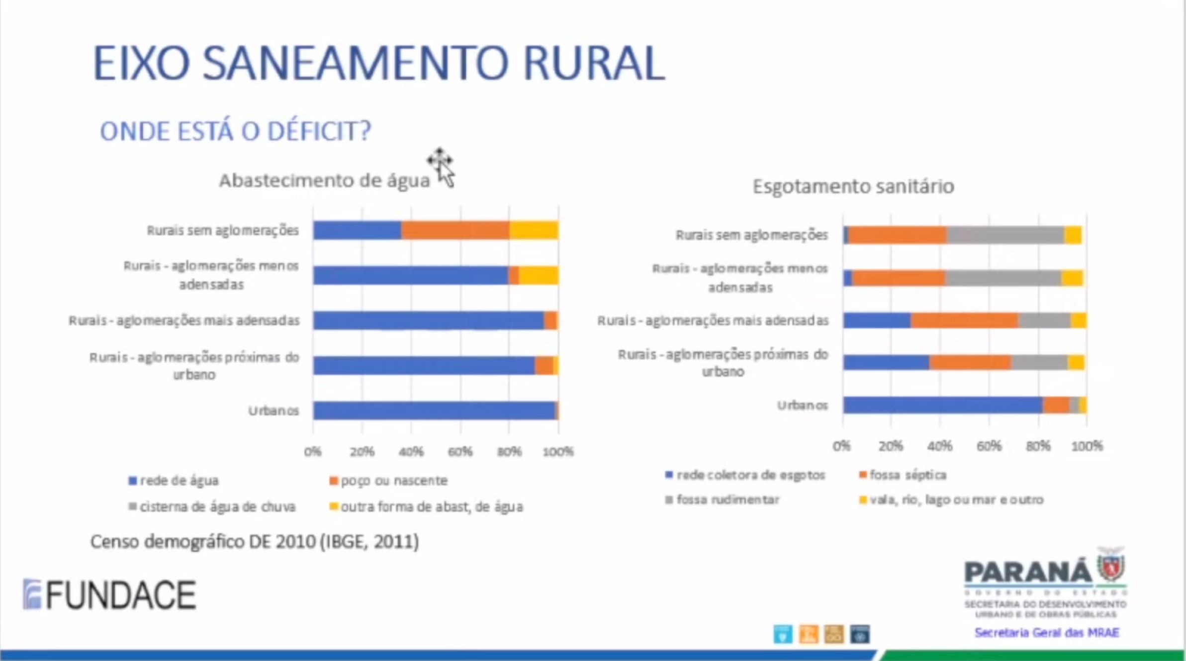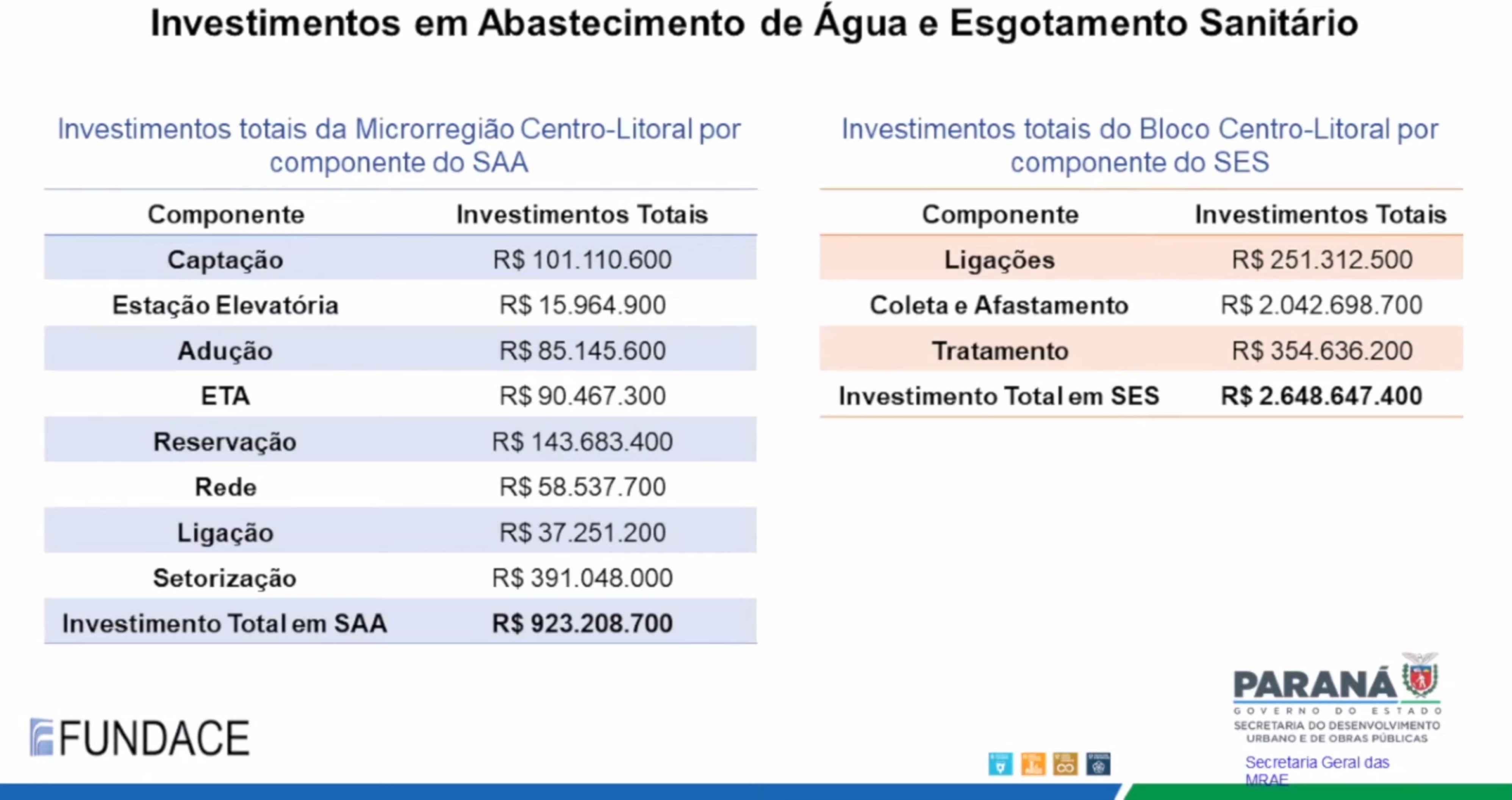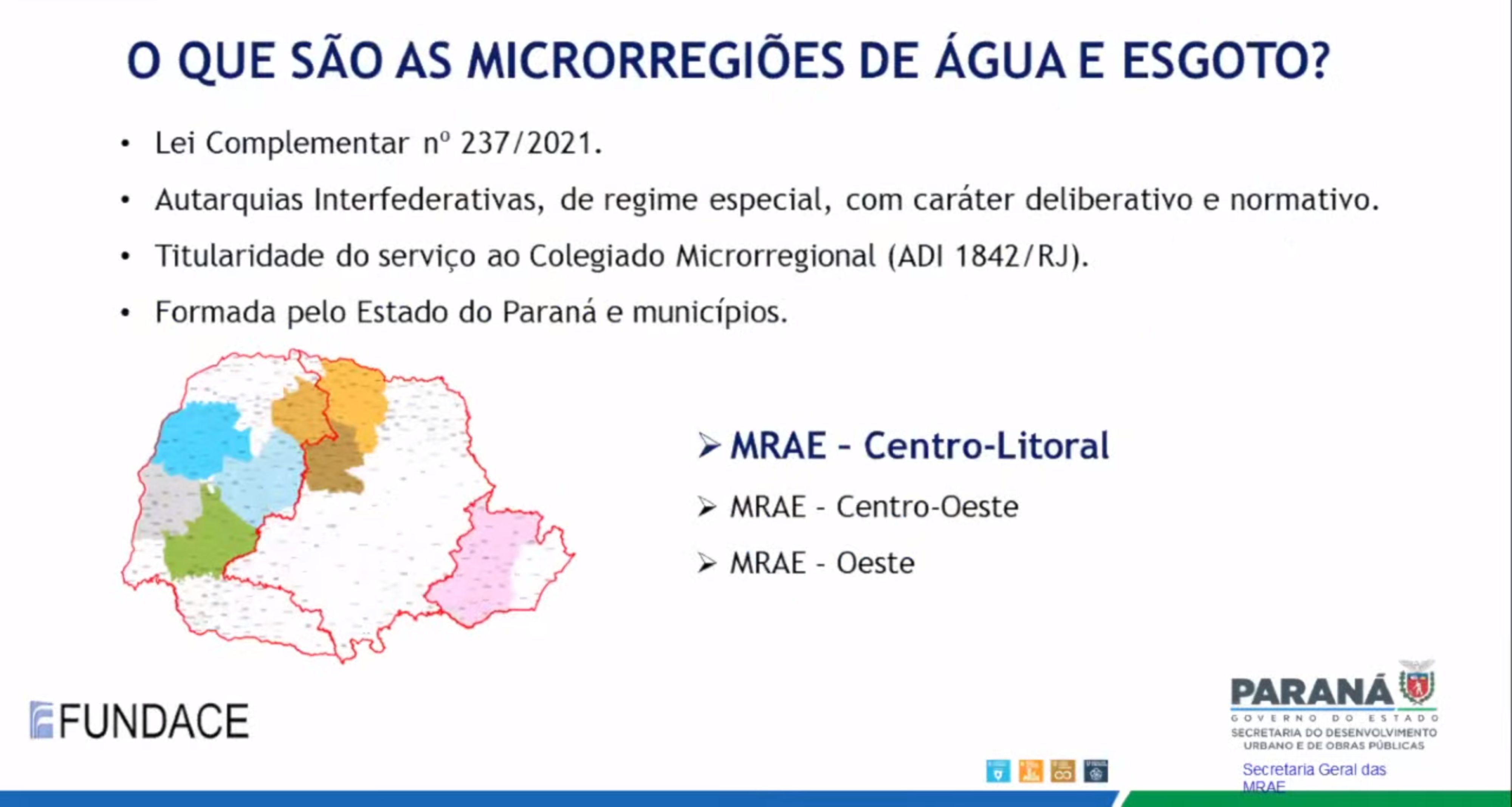 O Governo do Paraná realizou nesta quinta-feira, 22 de dezembro de 2022, às 9 horas, 13h30 e às 16 horas, audiências públicas relativas à implantação das políticas voltadas para a obtenção da universalização dos serviços de tratamento e fornecimento de água e de captação e tratamento de esgoto. Foram realizadas três sessões ao longo do dia, transmitidas pela Internet, a partir do Palácio Iguaçu, em Curitiba, e destinadas dar publicidade aos relatórios, relativos às microrregiões Centro-Litoral, Centro-Lesle e Oeste, elaborados pela Fundação para a Pesquisa, Desenvolvimento da Administração, Contabilidade e Economia (FUNDACE). O processo é conduzido pela Secretaria do Desenvolvimento Urbano e de Obras Públicas (SEDU), com apoio do Serviço Social Autônomo Paranacidade.