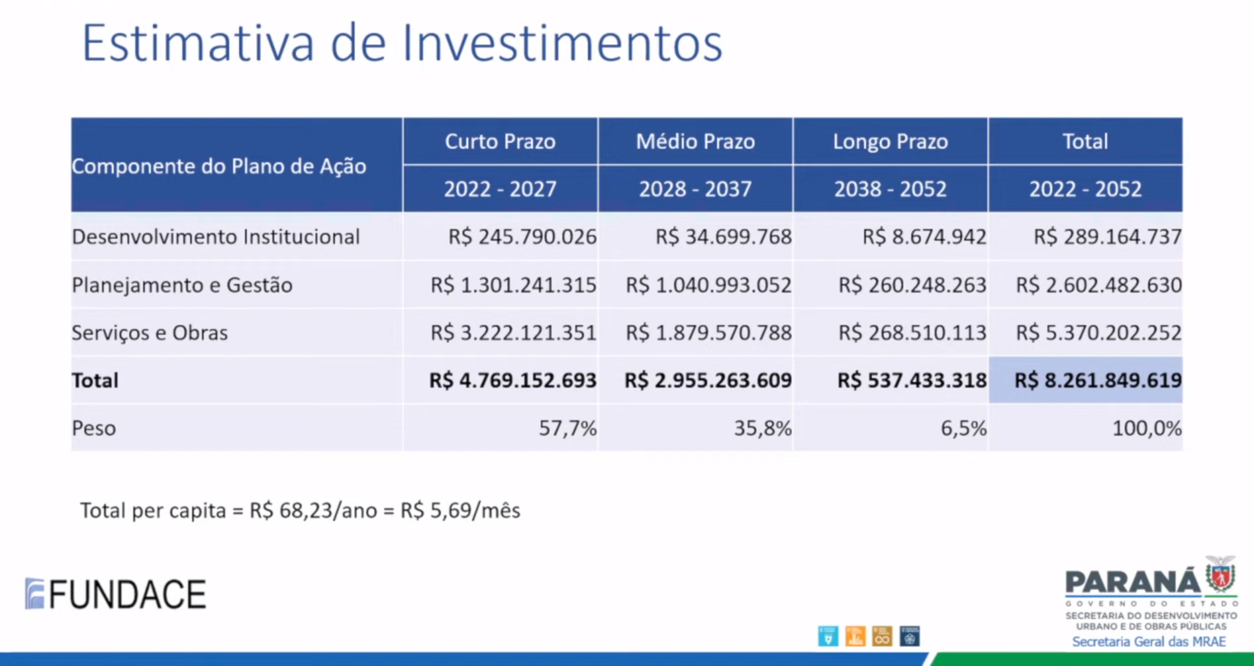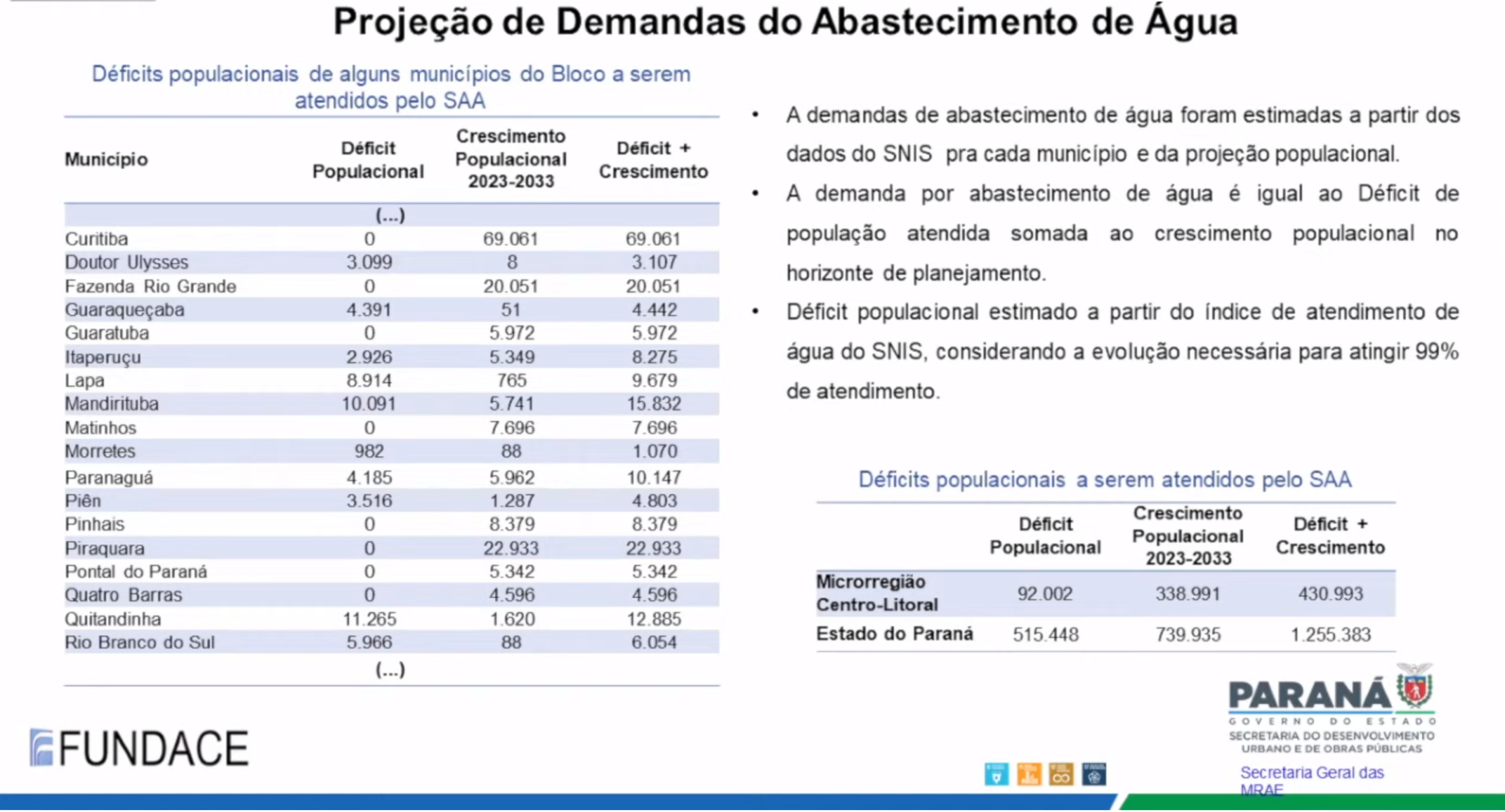 Os documentos apresentados trazem informações sobre os percentuais da população já atendidos, em todos os segmentos apreciados, estimativas de perdas e projeções a respeito dos investimentos necessários para o cumprimento das metas de universalização dos serviços, incluindo as previsões de crescimento populacional. Mereceu destaque, na apresentação dos técnicos da FUNDACE, a necessidade de elaborar o planejamento para a drenagem das águas pluviais obedecendo as bacias hidrográficas, o que poderá gerar a redefinição dos atuais territórios microrregionais. Atualmente, as microrregiões seguem os limites dos Municípios.