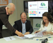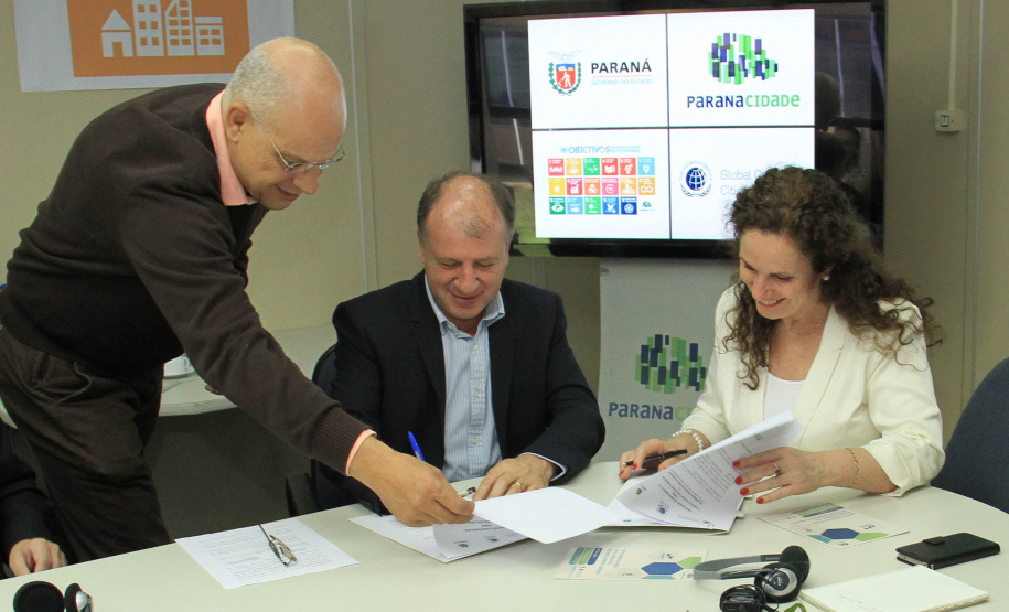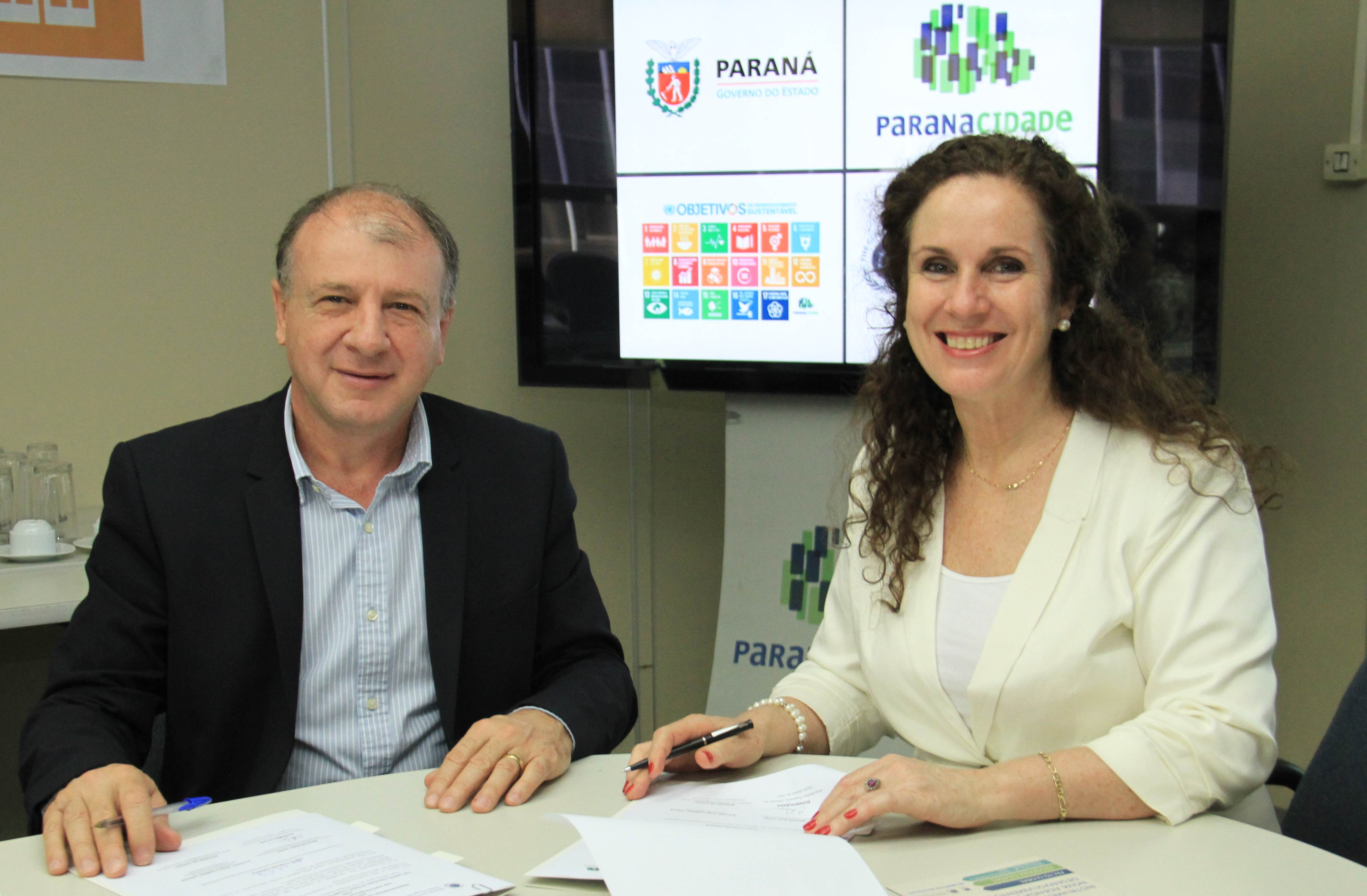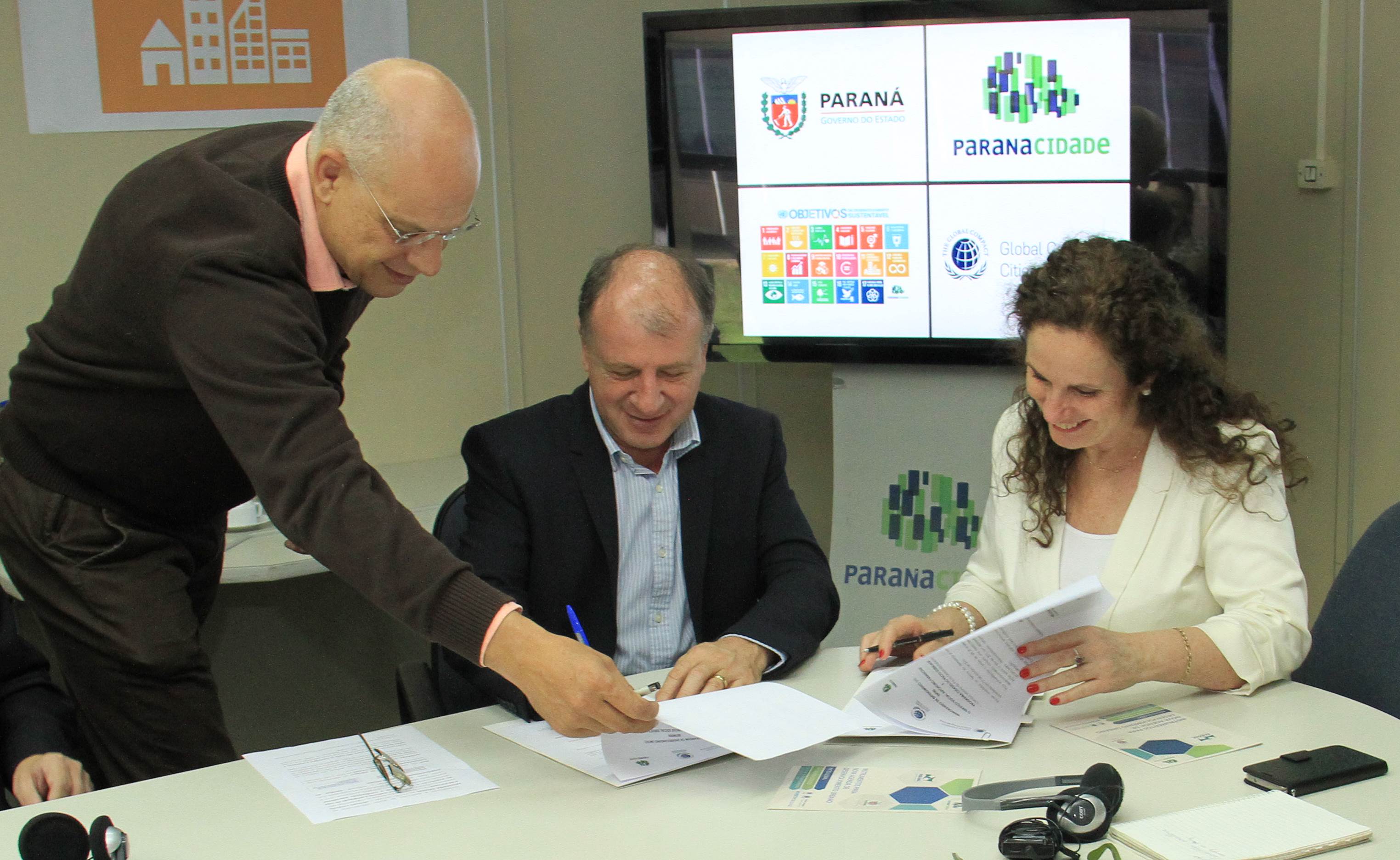 Há exatamente um ano, a representante do Programa Cidades do Pacto Global das Nações Unidas, a australiana Elizabeth Ryan, esteve na Secretaria do Desenvolvimento Urbano (SEDU) e Serviço Social Autônomo (Paranacidade) para assinar o Memorando que descreve as intenções do Programa Cidades do Pacto Global da ONU e do Paranacidade, de trabalhar em parceria para promover o desenvolvimento urbano sustentável. Elizabeth esteve novamente no Paranacidade, na manhã desta sexta-feira, 27, para assinar, acompanhada do secretário do Desenvolvimento Urbano, João Carlos Ortega, do superintendente executivo do Paranacidade, Wilson Bley Lipski e do articulador dos Objetivos de Desenvolvimento Sustentável (ODS) no Paranacidade, o engenheiro florestal Geraldo Farias, o Termo de Continuidade do Memorando de Entendimento, ratificando-o e reforçando os laços de cooperação.