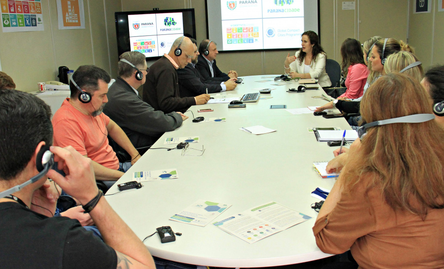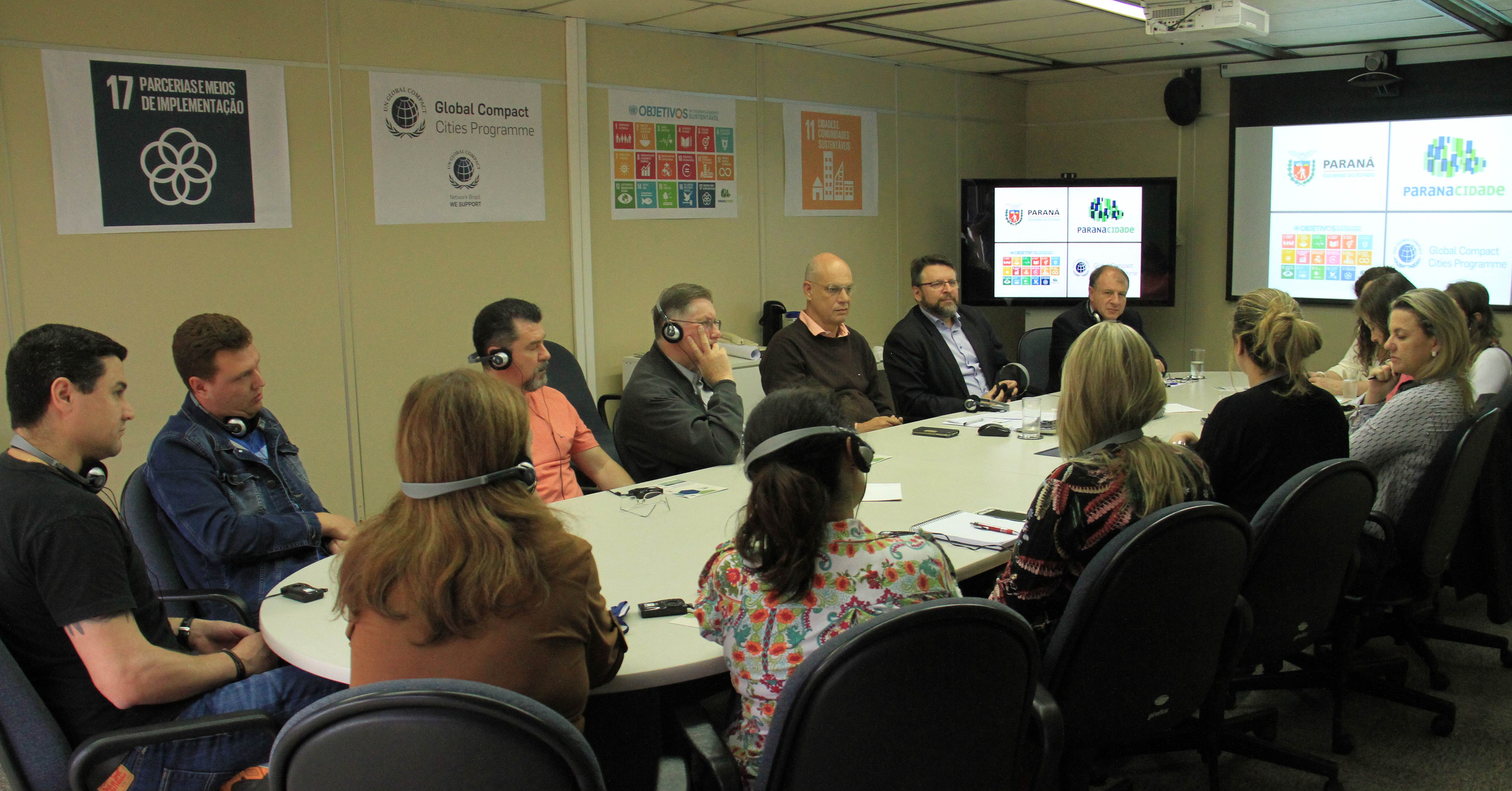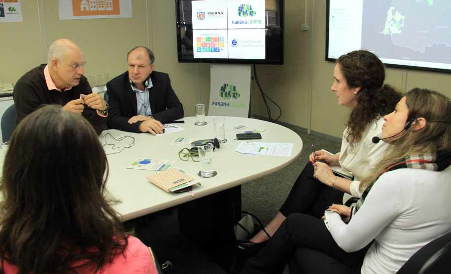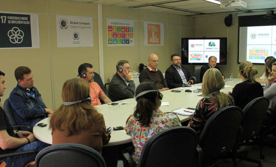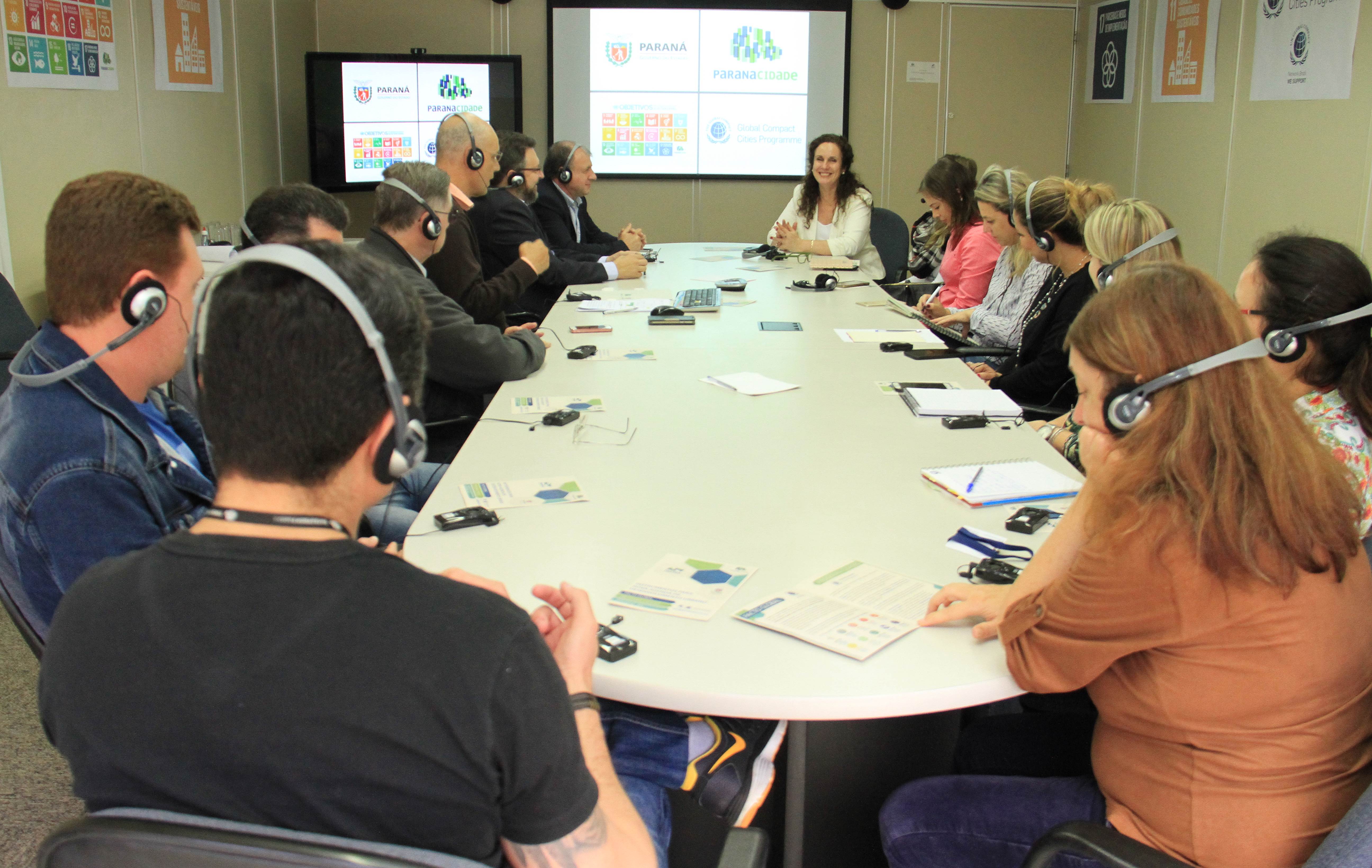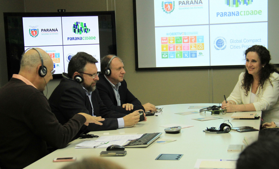 Durante a reunião, que teve tradução simultânea, uma parte da equipe de colaboradores que compõe o grupo responsável pelo encaminhamento de ações internas e externas referentes ao Pacto Global, Programa Cidades e ODS, discutiu sobre quais trabalhos estão sendo realizados para que sejam adequados os 17 ODS; sobre a Plataforma de Mecanismo de Implementação para o Desenvolvimento Urbano Sustentável (IFSU) – Nova Agenda Urbana, sobre o City Scan e, ainda, apresentaram à Elizabeth as funcionalidades da ferramenta SEDU/Paranacidade Interativo.