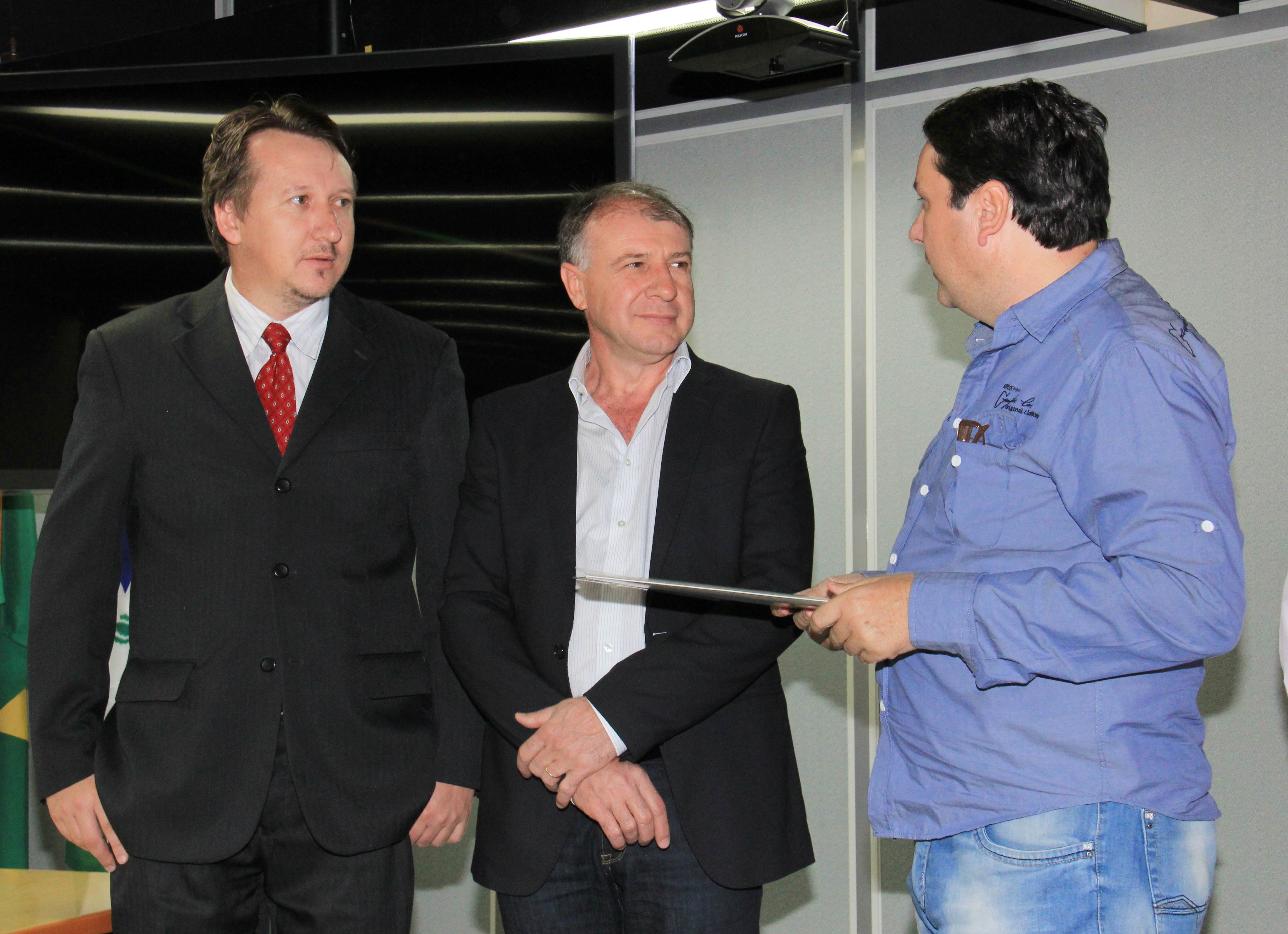 MAIS PROMAP - Em uma agenda lotada, o secretário do Desenvolvimento Urbano esteve, às 9h30, na Assembleia Legislativa do Paraná, onde, junto com o presidente da Casa, deputado Valdir Rossoni, entregou ao prefeito de Palmital, Darci José Zolandek, documento de autorização para licitação de R$ 727.134,90, pelo Programa de Apoio à Aquisição de Máquinas e Equipamentos Rodoviários às Prefeituras (PROMAP).