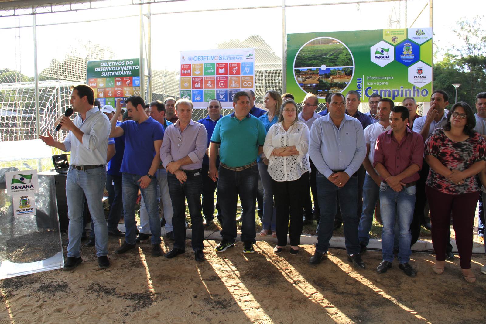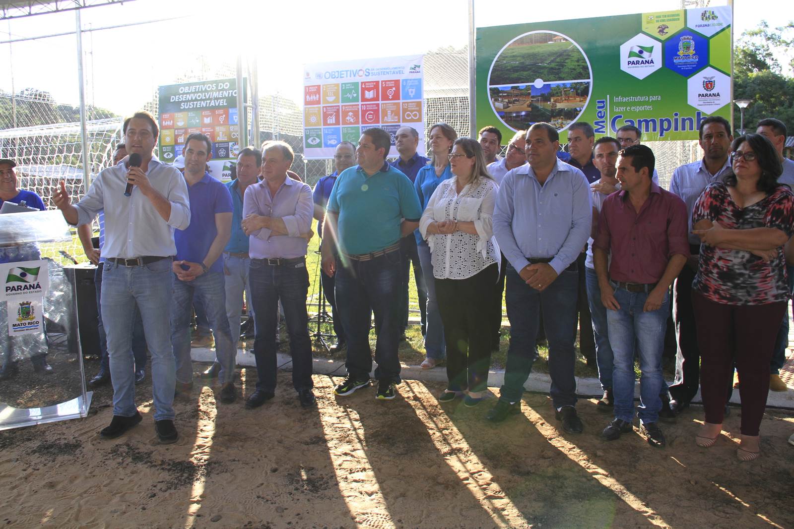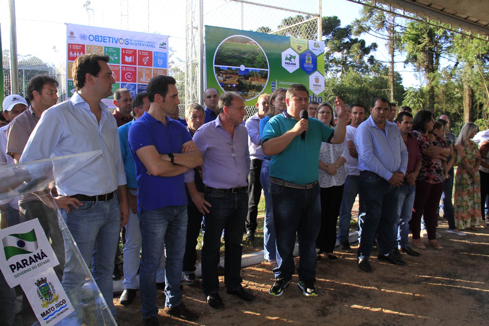 O município de Mato Rico, na Região Centro Sul do Paraná, ganhou nesta semana um espaço de lazer e esportes para abrigar toda a família, de crianças pequenas até idosos. Com festa, muitos fogos e a presença do secretário de Estado do Desenvolvimento Urbano (SEDU), João Carlos Ortega, e do ex-secretário estadual da Pasta e mentor do Programa na administração pública, deputado estadual Ratinho Junior, deputados daquela Região, assim como prefeitos, vereadores e dezenas de famílias, foi inaugurado o primeiro “Meu Campinho” de Mato Rico. “Hoje é um dia histórico para o Governo do Paraná”, disse Ortega.
