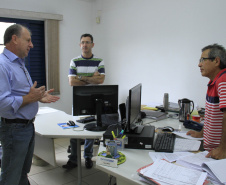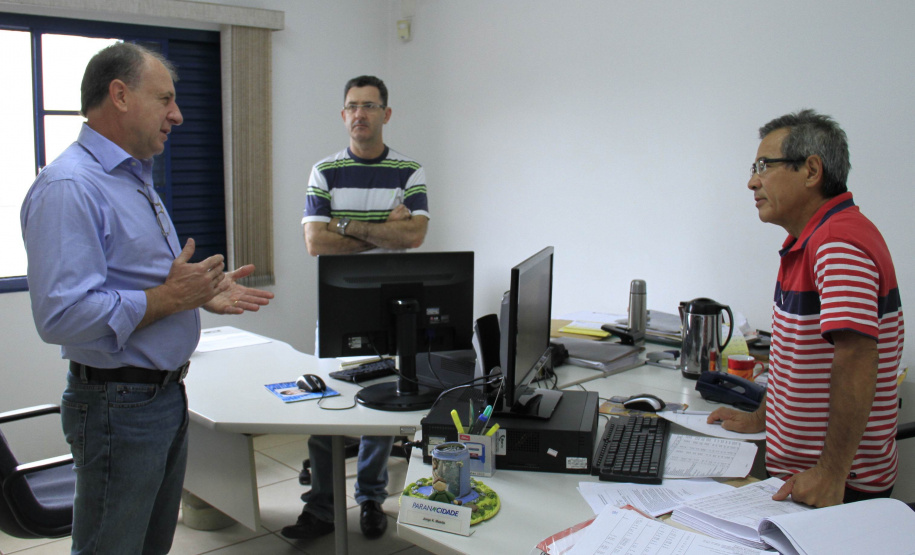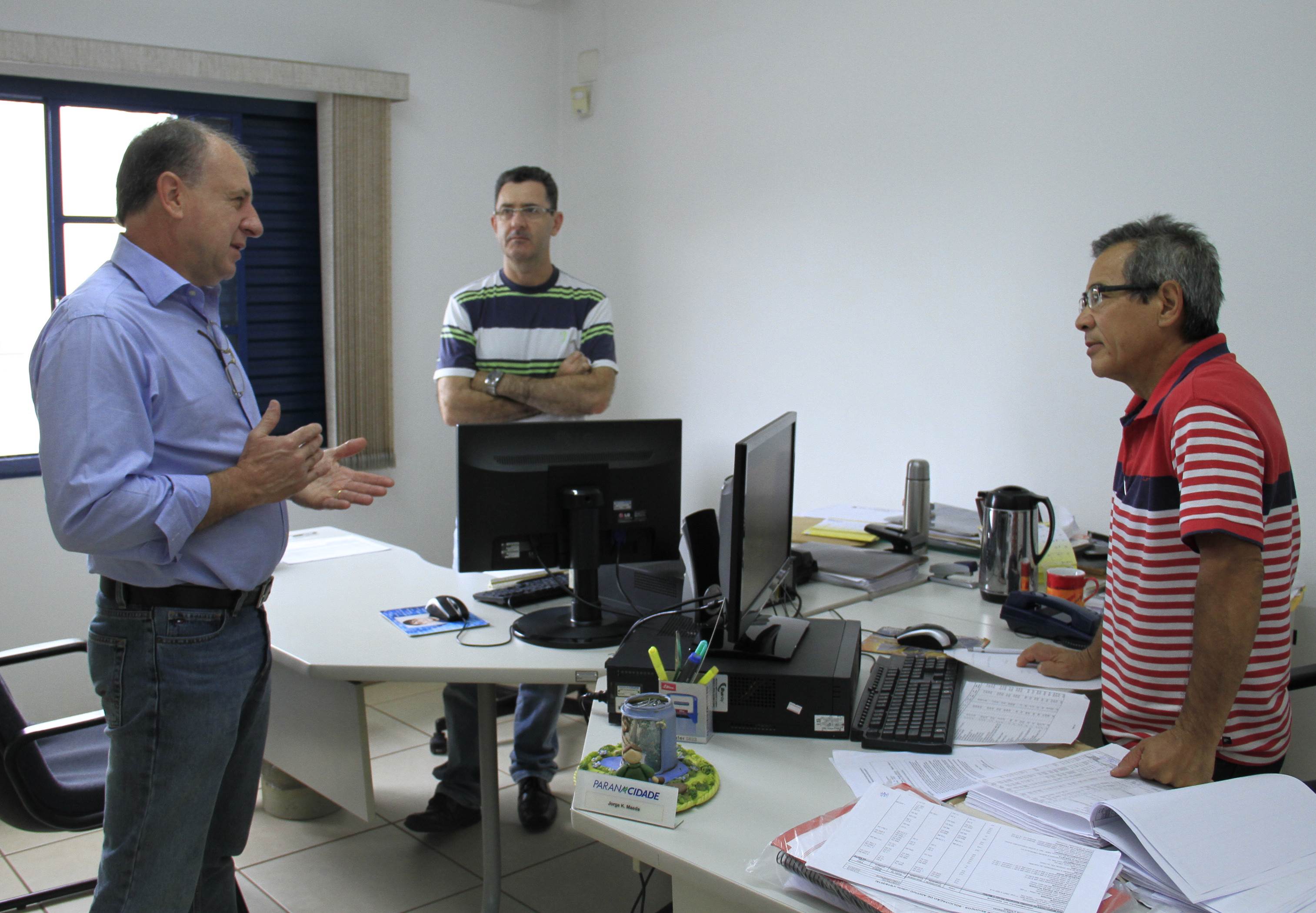 NO ESCRITÓRIO REGIONAL – Junto com Miro, o secretário da SEDU, falou sobre a necessidade de empenho de todos os oito funcionários para atender a grande demanda de projetos. Para fazer o acompanhamento em todas as etapas de cada um delas há quatro engenheiros civis, três homens e uma mulher. Mas eles contam também com o apoio dos técnicos do Serviço Social Autônomo – Paranacidade.