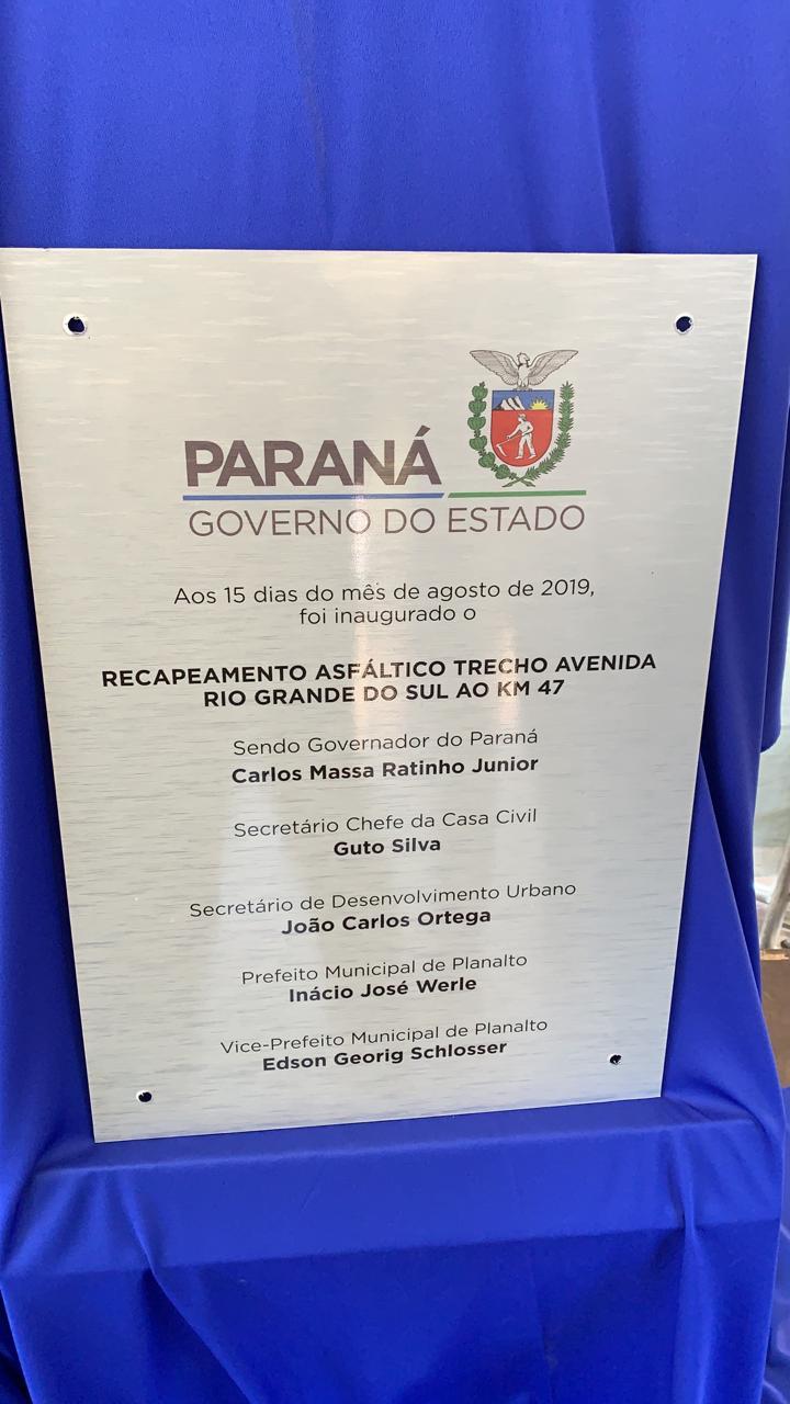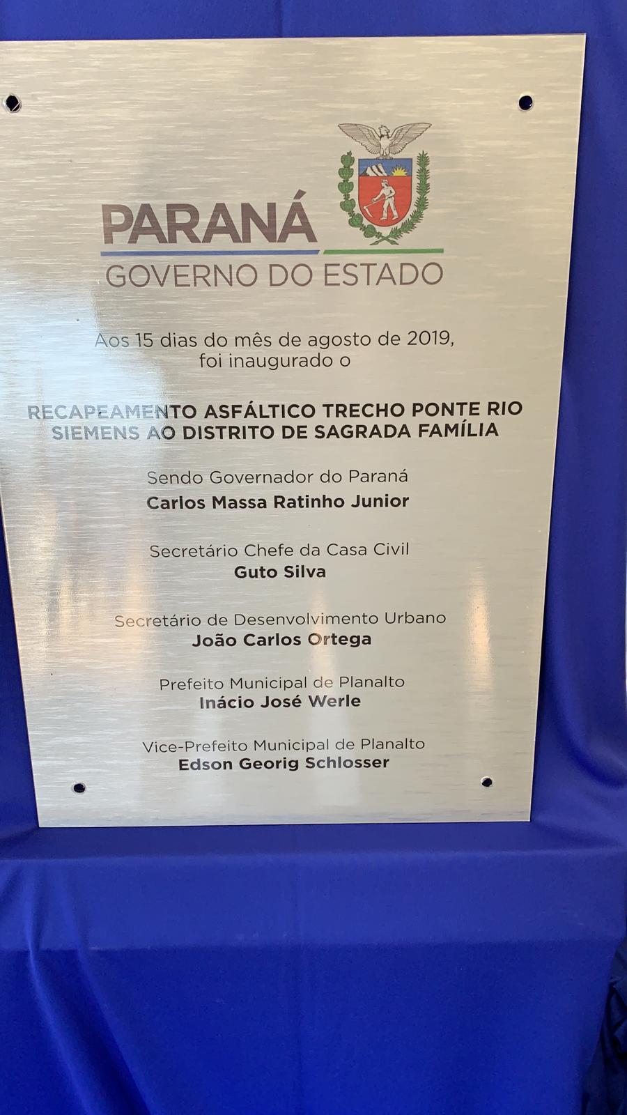 O secretário do Desenvolvimento Urbano e de Obras Públicas (SEDU), João Carlos Ortega, esteve nesta quinta-feira, 15, em Planalto, na Região Sudoeste do Paraná. Acompanhado do prefeito Inácio José Werle, Ortega descerrou placas na entrega de pavimentação em duas Estradas Vicinais daquele Município: uma, entre a Ponte do Rio Siemens e o Distrito Sagrada Família, e a outra, entre a Avenida Rio Grande do Sul e a Comunidade km 47.