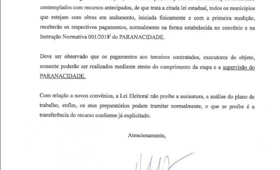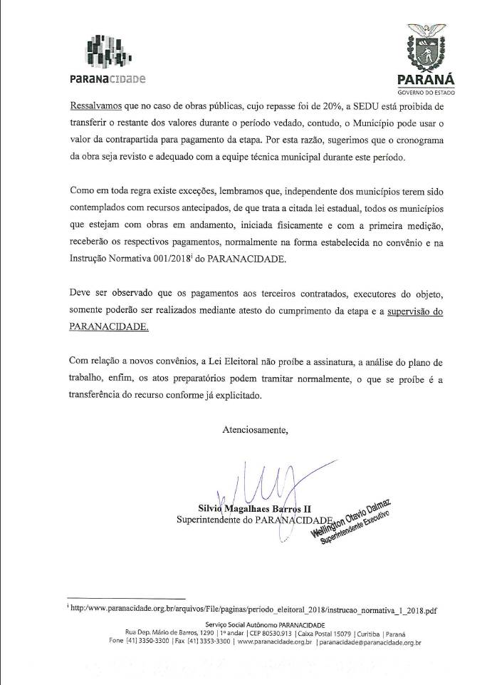 O PARANACIDADE enviou uma carta circular às prefeituras com orientações em atenção à Lei Estadual 19.554/2018 que alterou a forma de transferência de recursos de convênios, no âmbito da Secretaria de Desenvolvimento Urbano – SEDU.