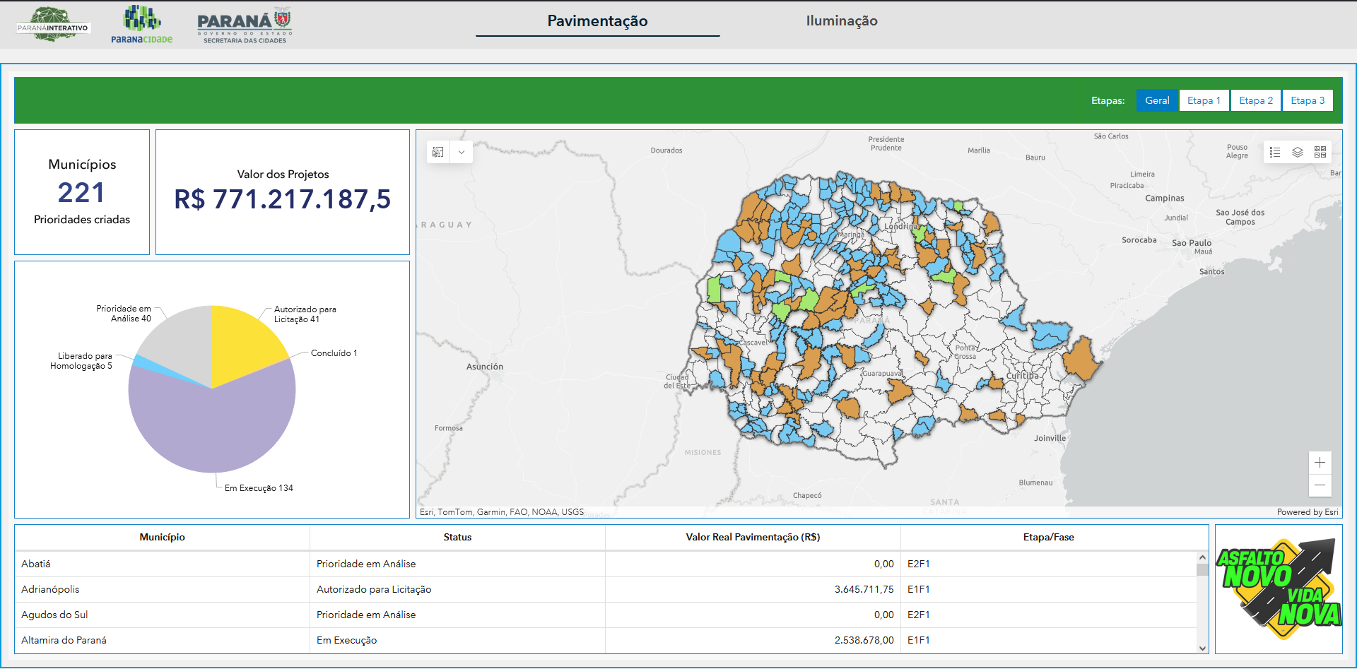 O Programa Asfalto Novo, Vida Nova, que leva pavimentação asfáltica e promove a troca da iluminação convencional por lâmpadas de LED nos menores Municípios do Paraná agora pode ser acompanhado, no dia a dia, por qualquer cidadão interessado na aplicação correta de recursos públicos para promover o desenvolvimento. As informações estão em um novo painel incluído no Portal Paraná Interativo, que pode ser acessado pelo endereço https://paranainterativo.pr.gov.br/.