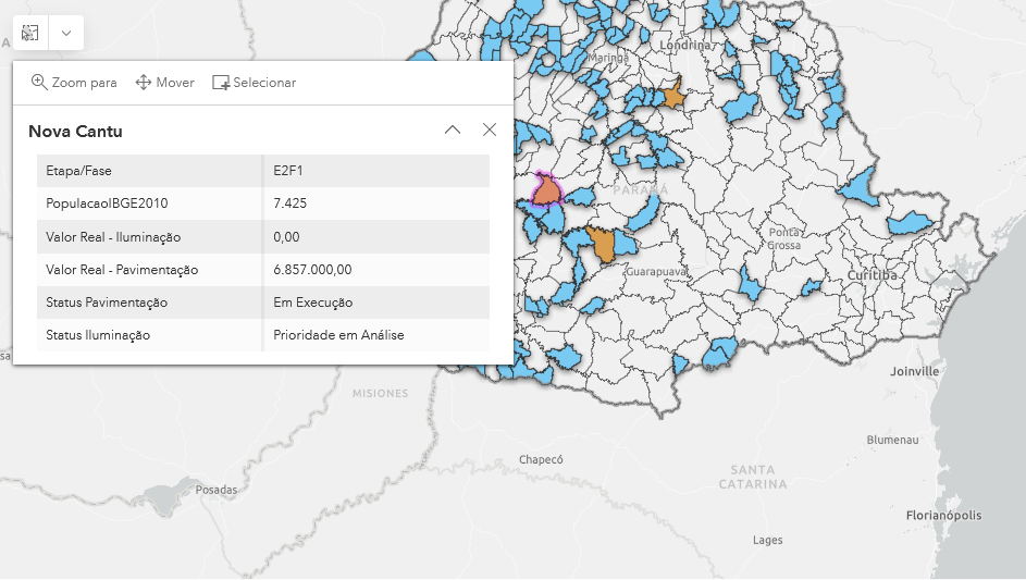 Quem for navegar pela nova ferramenta terá um mapa do Paraná com todos os Municípios participantes das três etapas já lançadas. A amostragem pode ser feita, ainda, indicando apenas aqueles que encaminharam projetos em uma das etapas. Os Municípios aparecem com cores diferentes, de acordo com a fase a que pertencem. Ao clicar sobre um dos mapas coloridos é aberta uma tabela flutuante com a população do Município, os valores destinados para pavimentação e iluminação e o status de cada projeto.