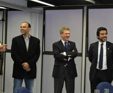 CARTÃO DE VISITAS - Ao lado dos secretários da Casa Civil, Eduardo Sciarra; da Cohapar, Abelardo Lupion; e dos representantes das diretorias do Paranacidade, da COMEC e da Fomento Paraná, Ratinho Junior avaliou o resultado como proveitoso. “Queremos retirar do papel alguns sonhos, como o do VLP, do Corredor Metropolitano e outros que vão facilitar e dar melhor qualidade de vida às pessoas. E o Estatuto das Metrópoles ainda é um desafio a todos os Estados do País. Foi por esta razão que nos adiantamos e nos preparamos para mostrar que o Paraná poderá ser o cartão de visitas, do Ministério das Cidades, na questão do Estatuto das Metrópoles para o Brasil. Já estamos organizando, para o próximo semestre, o Fórum de Debates sobre o Estatuto das Metrópoles. O Paraná conta com infraestrutura, mobilidade urbana e com excelentes programas. Estamos em busca de novos parceiros que possibilitem recursos para viabilizar nossos projetos”, explicou Ratinho Junior.