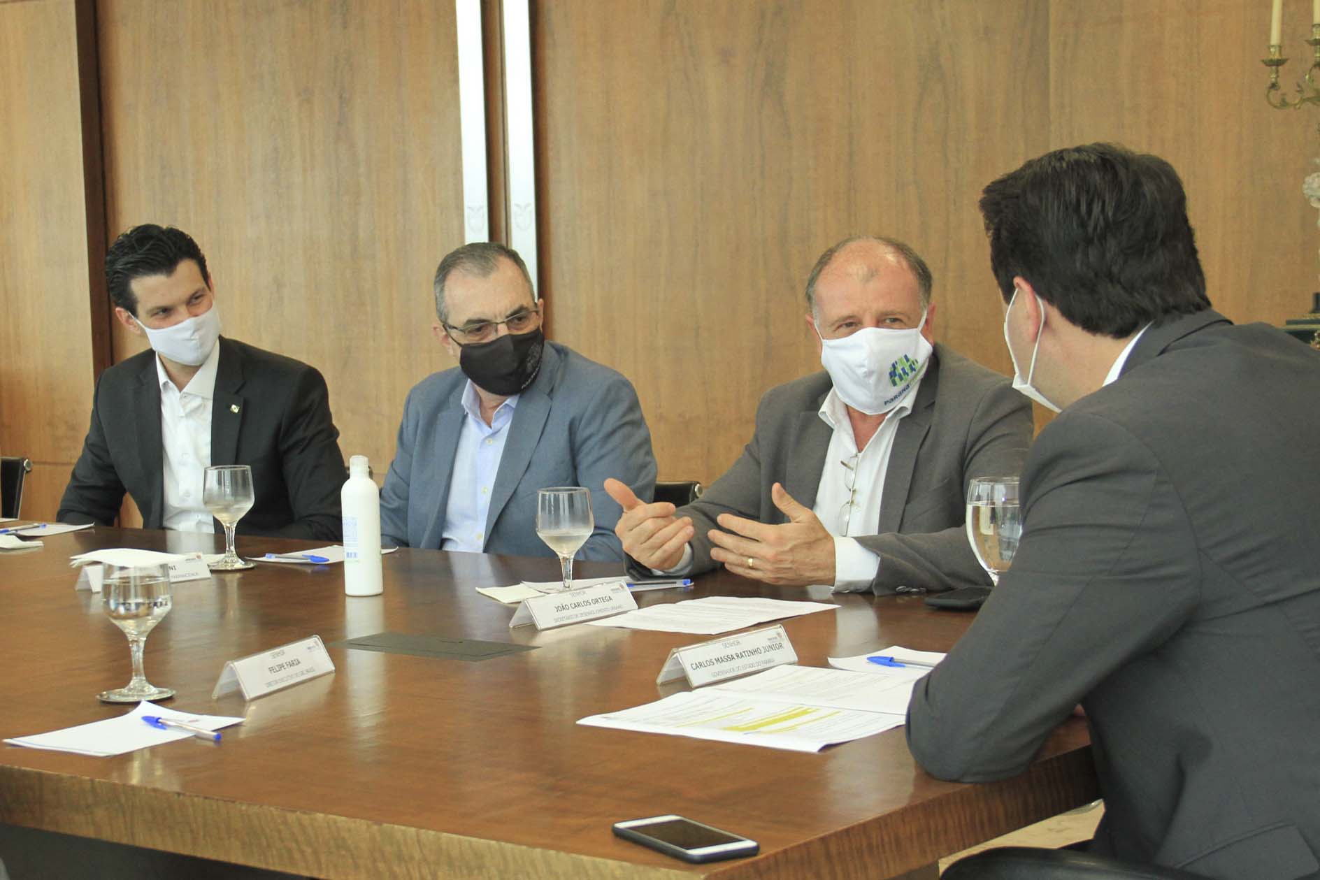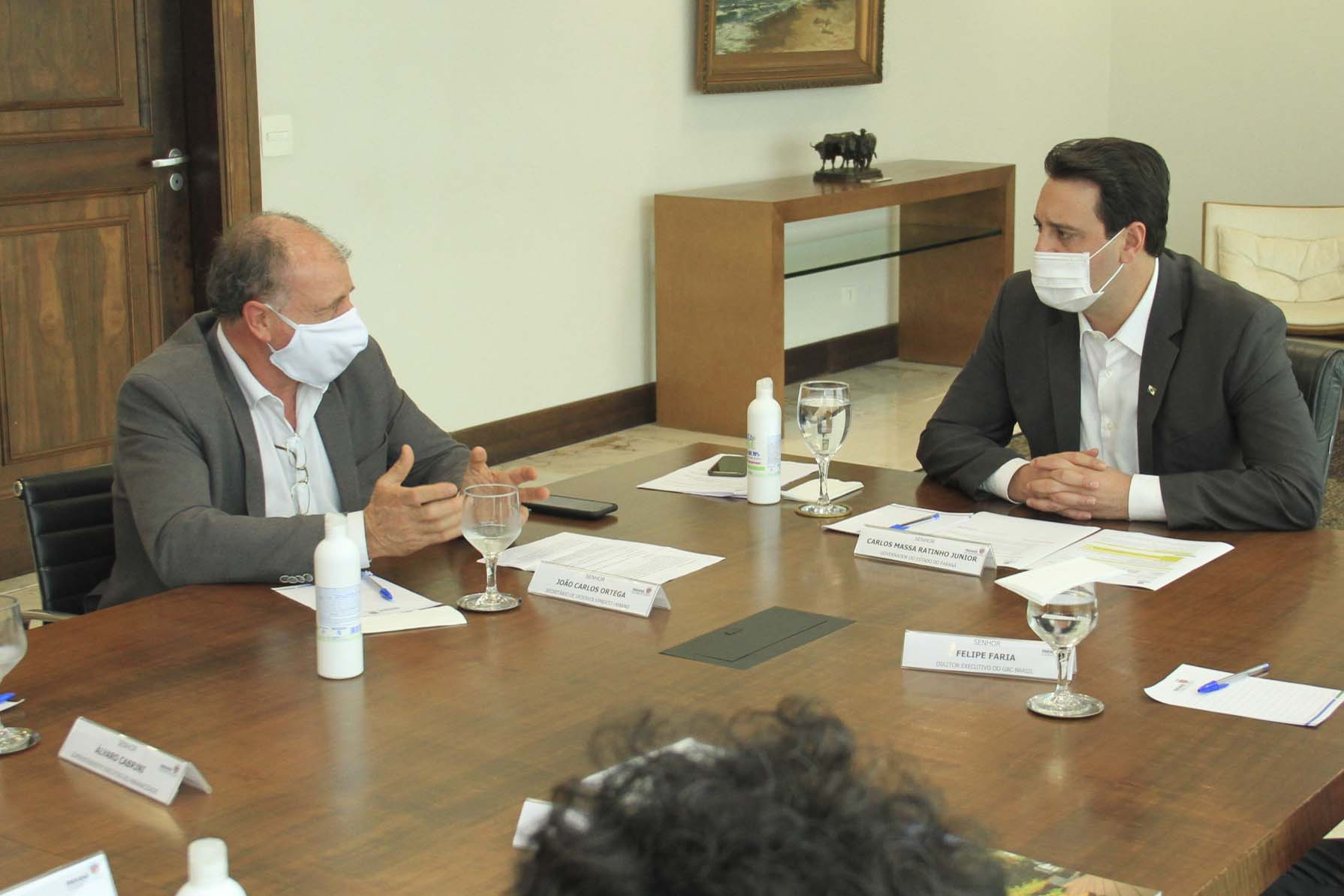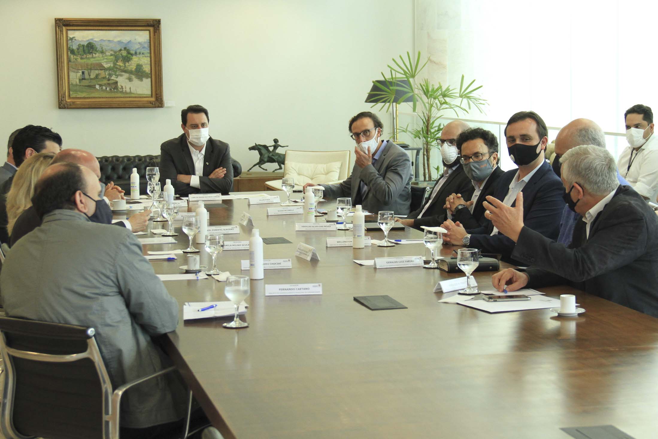 Participaram da reunião com o governador, além do secretário Ortega e da diretora Camila, o CEO do Green Building Council Brasil, Felipe Faria; o superintendente executivo do Paranacidade, Álvaro Cabrini; o diretor de Administração e Finanças do Paranacidade, José Elizeu Chociai; o presidente da Copel, Daniel Pimentel Slaviero; o diretor presidente da Fomento Paraná, Heraldo Alves das Neves; o diretor de Operações do Setor Público da Fomento Paraná, Wellington Dalmaz; o representante da Petinelli Consultoria Empresarial, Guido Petinelli; o assessor Parlamentar e Empresarial do Conselho Regional de Engenharia e Agronomia do Paraná (CREA-PR), Euclésio Finatti; e os analistas de Desenvolvimento Municipal do Paranacidade Fernando Caetano e Geraldo Luiz Farias.