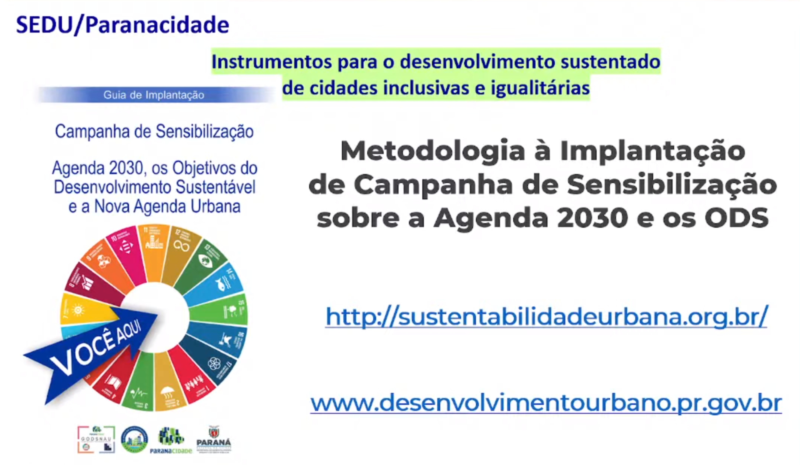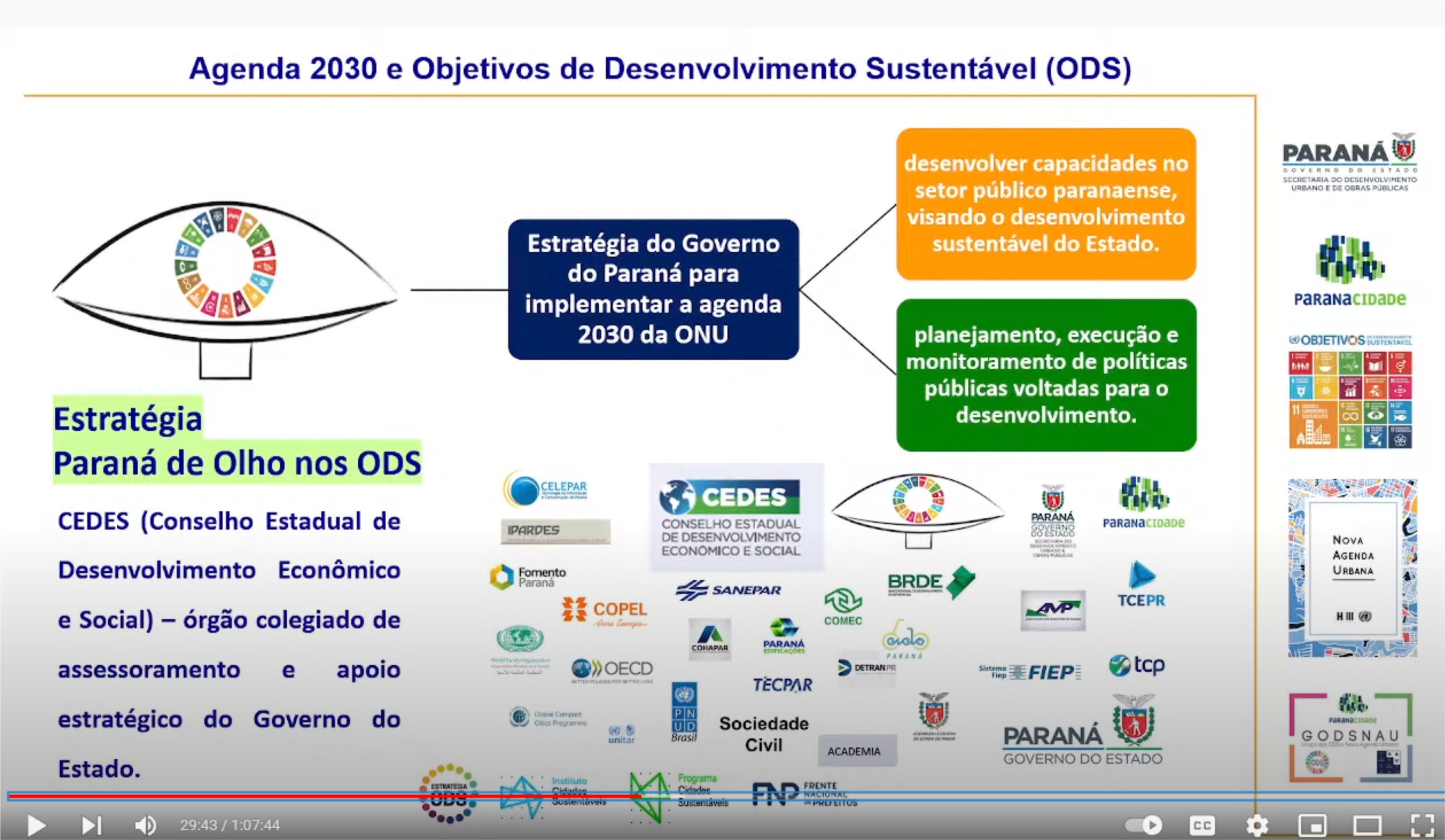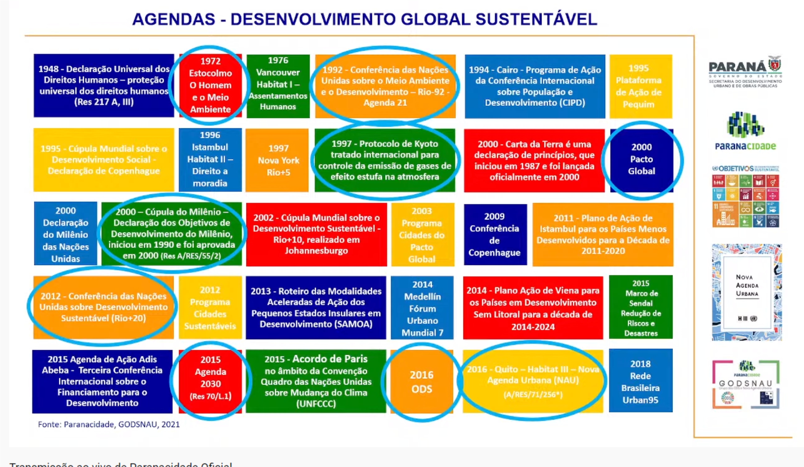 O Grupo dos Objetivos do Desenvolvimento Sustentável e Nova Agenda Urbana (GODSNAU) do Serviço Social Autônomo Paranacidade, vinculado à Secretaria do Desenvolvimento Urbano e de Obras Públicas (SEDU), desenvolve, neste mês de outubro, uma série de Rodas de Conversas sobre a Agenda 2030 e a Nova Agenda Urbana. Ambas propostas pela Organização das Nações Unidas (ONU) e adotadas pelo Governo do Paraná na implantação das suas políticas públicas. Participam do encontro os técnicos do Paranacidade e das Prefeituras atendidas pelos Escritórios Regionais. No entanto, os debates estão disponíveis, à população em geral, no canal do YouTube da empresa.