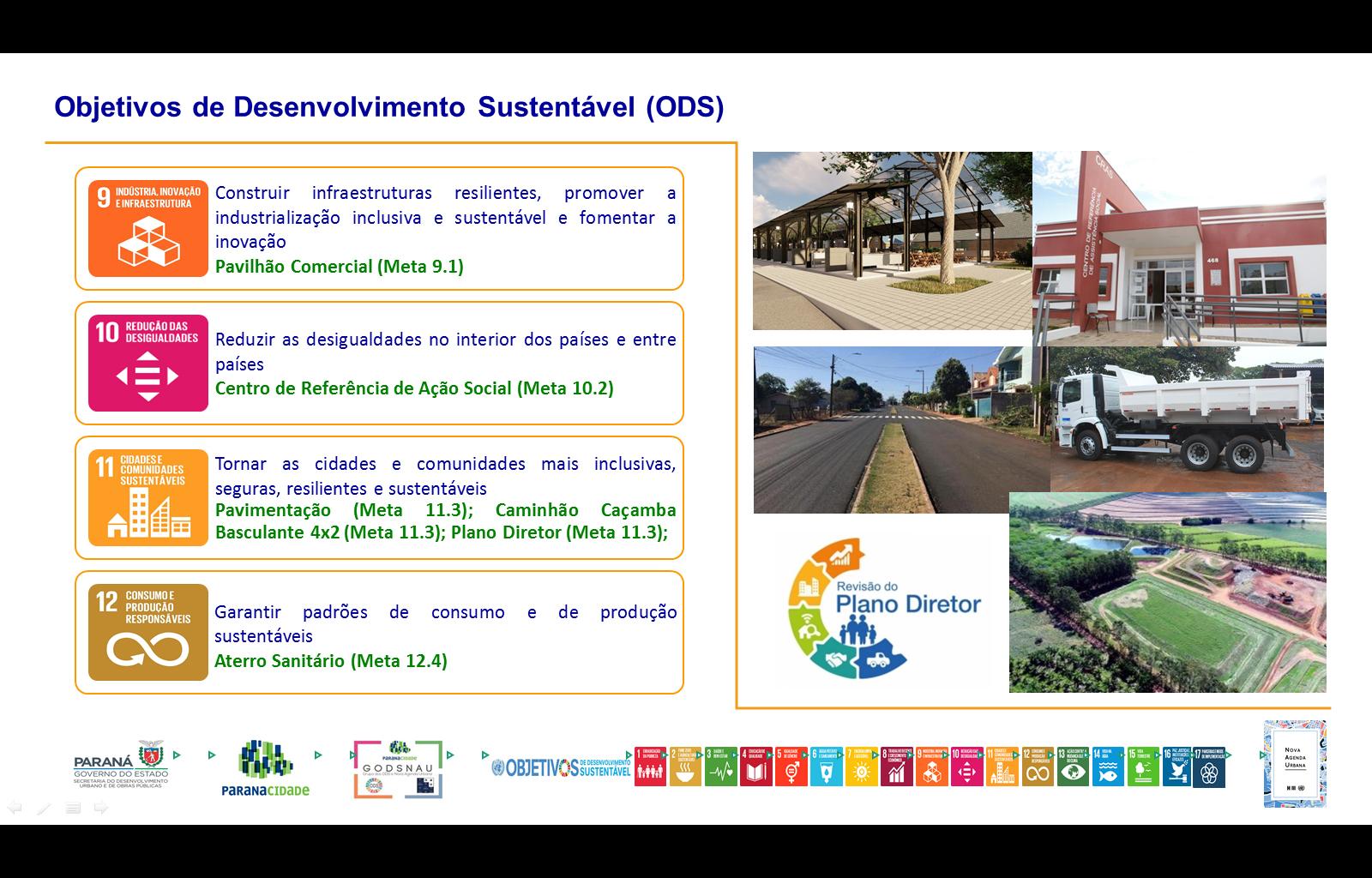Entre os exemplos de vínculo das ações realizadas no Paranacidade com os ODSs estão os projetos de pavimentação de vias urbanas, a construção de Ginásios de Esportes, o estímulo à formação e à manutenção dos Conselhos Municipais, a implantação de Parques Infantis e Parques Urbanos (que respondem ao ODS 11, sobre Cidades e Comunidades Sustentáveis).