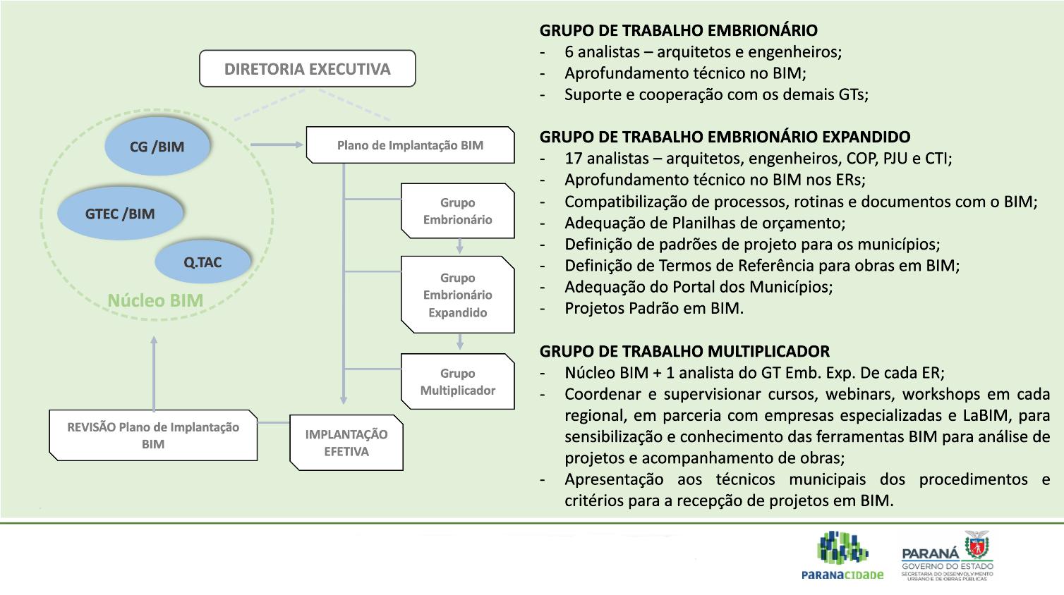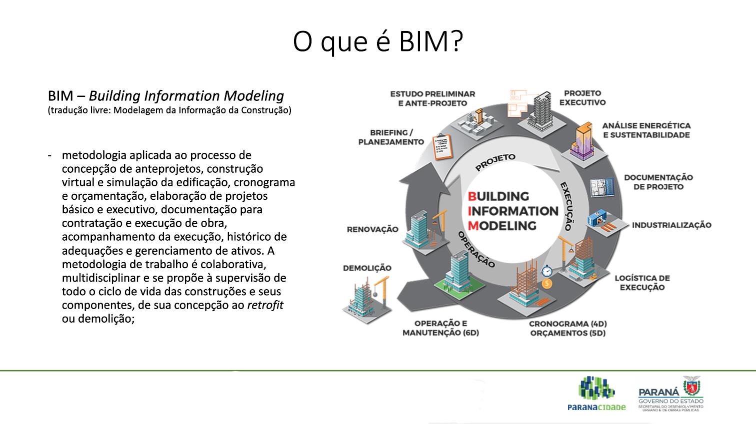 O Serviço Social Autônomo (Paranacidade) deu mais um passo, na tarde desta quinta-feira, 1º, no fortalecimento do uso da metodologia BIM nos projetos que analisa e faz o acompanhamento de execução das obras autorizadas pela Secretaria do Desenvolvimento Urbano e de Obras Públicas (SEDU). Todas realizadas com a liberação de recursos do Tesouro do Estado ou do Sistema de Financiamento aos Municípios (SFM). Em reunião técnica, foi apresentado o Plano de Implantação que inclui a internalização dos processos e posterior multiplicação das informações e sensibilização das equipes técnicas das Prefeituras do Paraná.