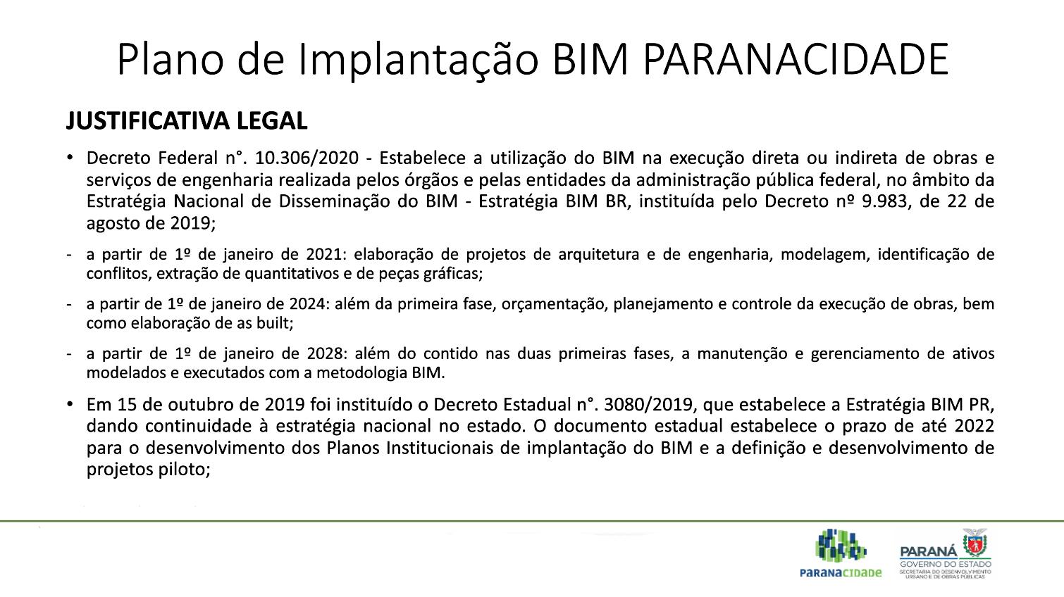 PRAZOS – A metodologia será adotada a partir de 1º de janeiro de 2021 nos projetos executados com recursos do Governo Federal, por força dos Decretos Federais 10.306/2020 e 9983/2019. Em 15 de outubro de 2019, o governador Carlos Massa Ratinho Junior assinou o Decreto Estadual que estabelece o prazo de até 2022 para o desenvolvimento de Planos Institucionais para a implantação dos procedimentos BIM em obras públicas, além da definição e o desenvolvimento de projetos piloto.