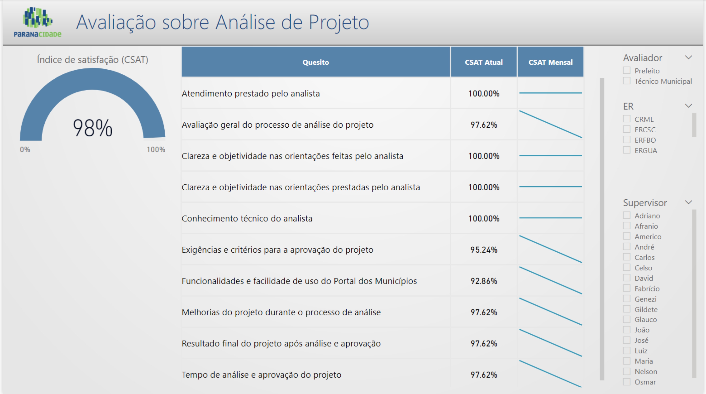 AVALIAÇÕES - A consulta oferece resultados gerais sobre a atuação da Empresa, mas também viabiliza avaliações de desempenho por Escritório Regional e dos técnicos do Paranacidade que supervisionaram as análises.