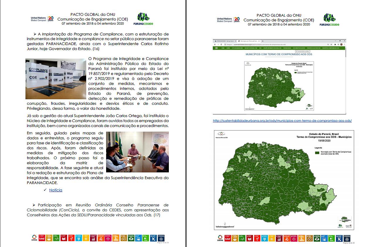 A adesão ao Pacto Global aconteceu quando o atual governador Carlos Massa Ratinho Junior respondia pela Secretaria do Desenvolvimento Urbano (SEDU) e pela superintendência do Paranacidade, no mesmo período em que teve início a implantação do Programa de Compliance na Instituição. Desde o mês de janeiro de 2019, a iniciativa, que garante a gestão pública de acordo com as boas práticas, passou a ser implantada também em toda Administração Pública Estadual e é um dos destaques entre as ações relatadas, além do registro da orientação das atividades de acordo com a Agenda 2030 e os seus Objetivos do Desenvolvimento Sustentável (ODSs), também da ONU.