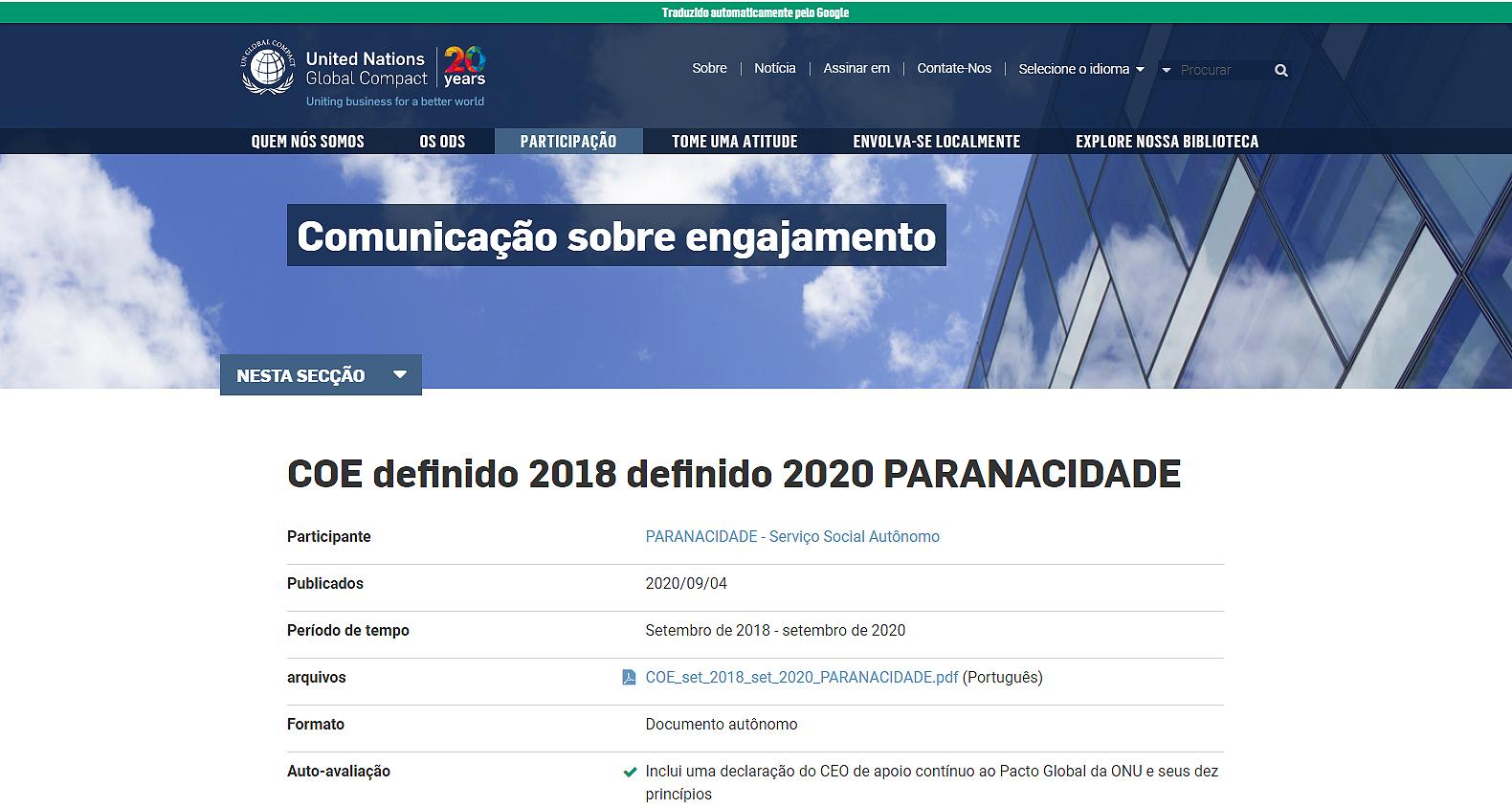 O COE do Paranacidade pode ser acessado no site do Pacto Global, no endereço https://www.unglobalcompact.org/participation/report/cop/create-and-submit/detail/442675