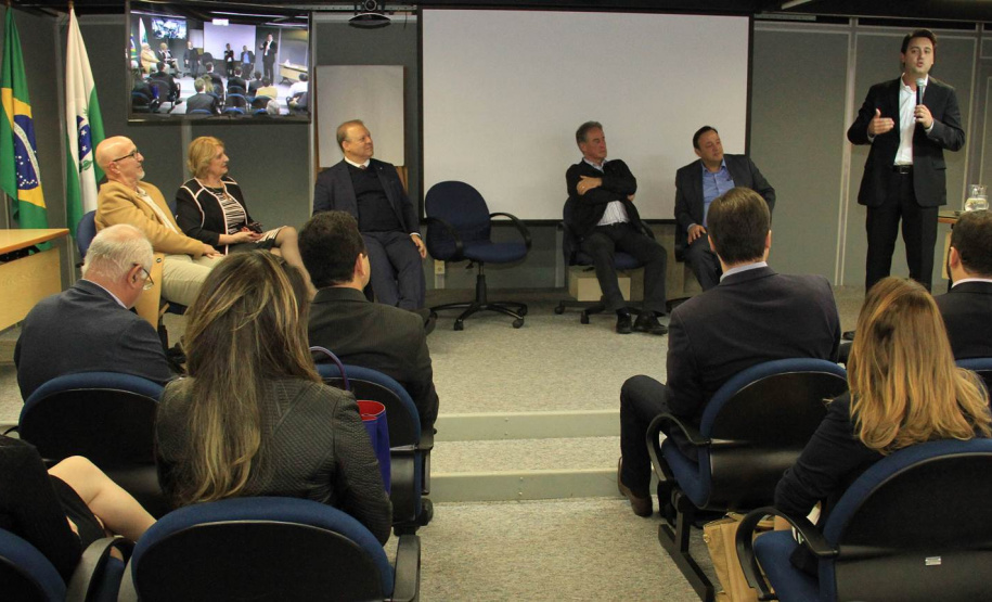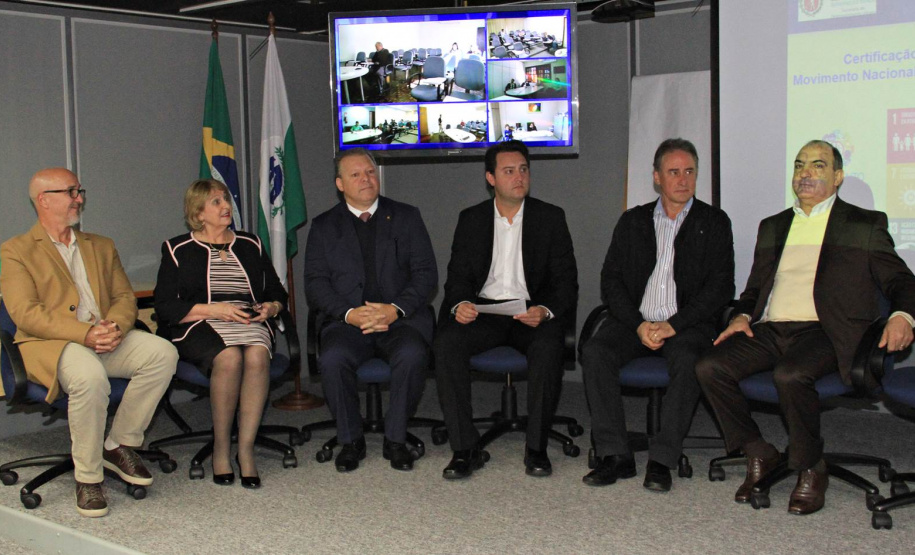 Mais o secretário executivo Adjunto do Movimento ODS, Maurício Degelmann; representante do Programa Cidades do Pacto Global da ONU, Rosana de Souza; do Conselho Estadual do Desenvolvimento Econômico e Social do Paraná, Keli Guimarães; do gabinete da vice-governadoria e secretária executiva adjunta do Movimento ‘Nós Podemos Paraná’, Nemécio Müller; e o analista de Desenvolvimento Municipal do Paranacidade, Geraldo Farias, que apresentou o evento.