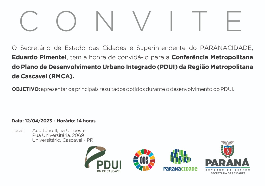 O Relatório Final com as Propostas Consolidadas para o Plano de Desenvolvimento Urbano Integrado da Região Metropolitana de Cascavel, o PDUI da RMCA, será apresentado no próximo dia 12, quarta-feira, às 14 horas, no Auditório II, na UNIOESTE, na Rua Universitária, 2.069, em Cascavel. O secretário de Estado das Cidades e superintendente do Serviço Social Autônomo Paranacidade, Eduardo Pimentel, estará presente e convida aos prefeitos, autoridades, lideranças e a população daquela Região. “Todas as pessoas interessadas no desenvolvimento harmônico e estratégico, com políticas públicas adequadas e transparentes para o fortalecimento das cidades e da cultura de suas populações, devem comparecer e participar desse momento histórico”, convoca Pimentel.