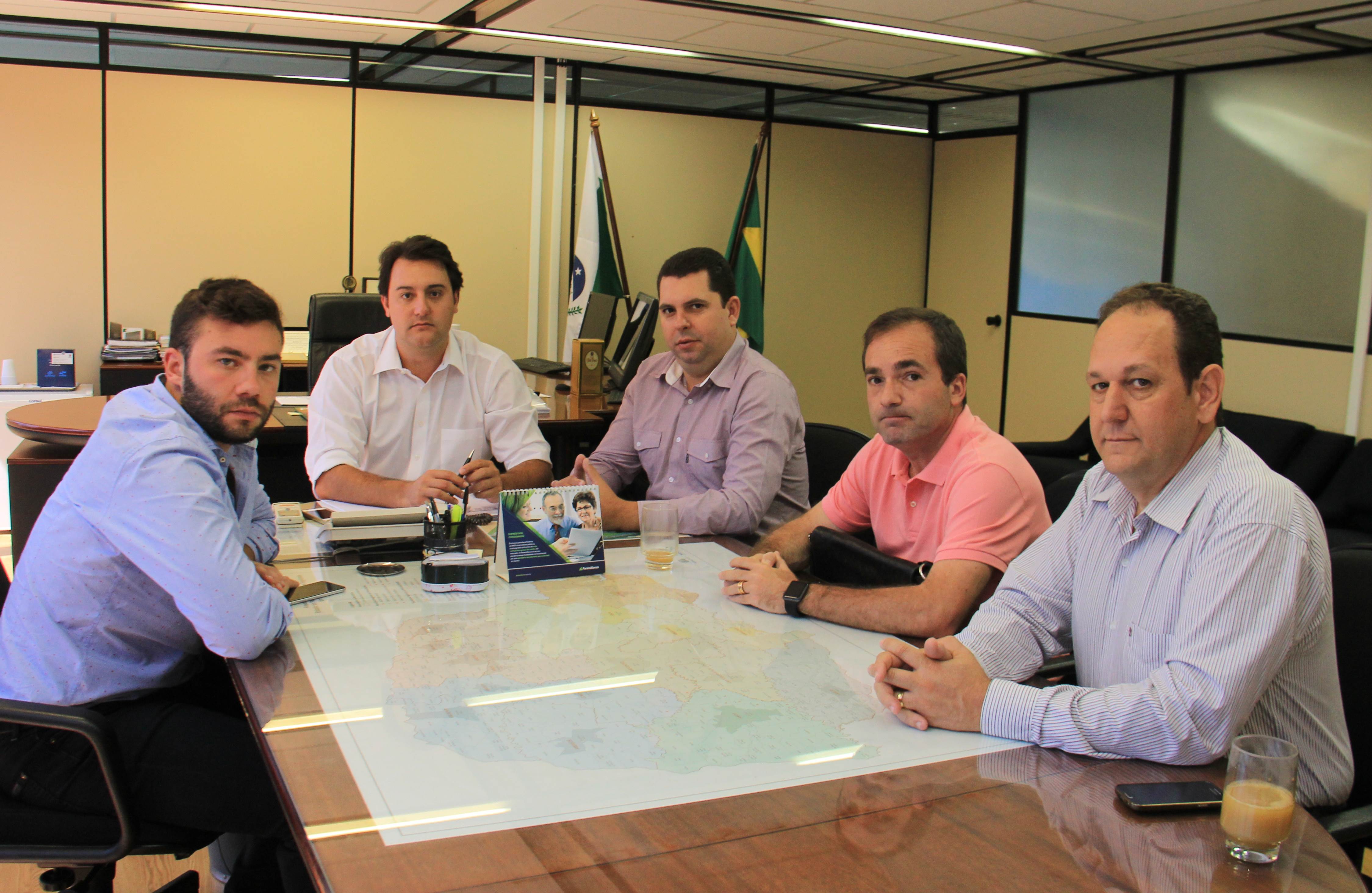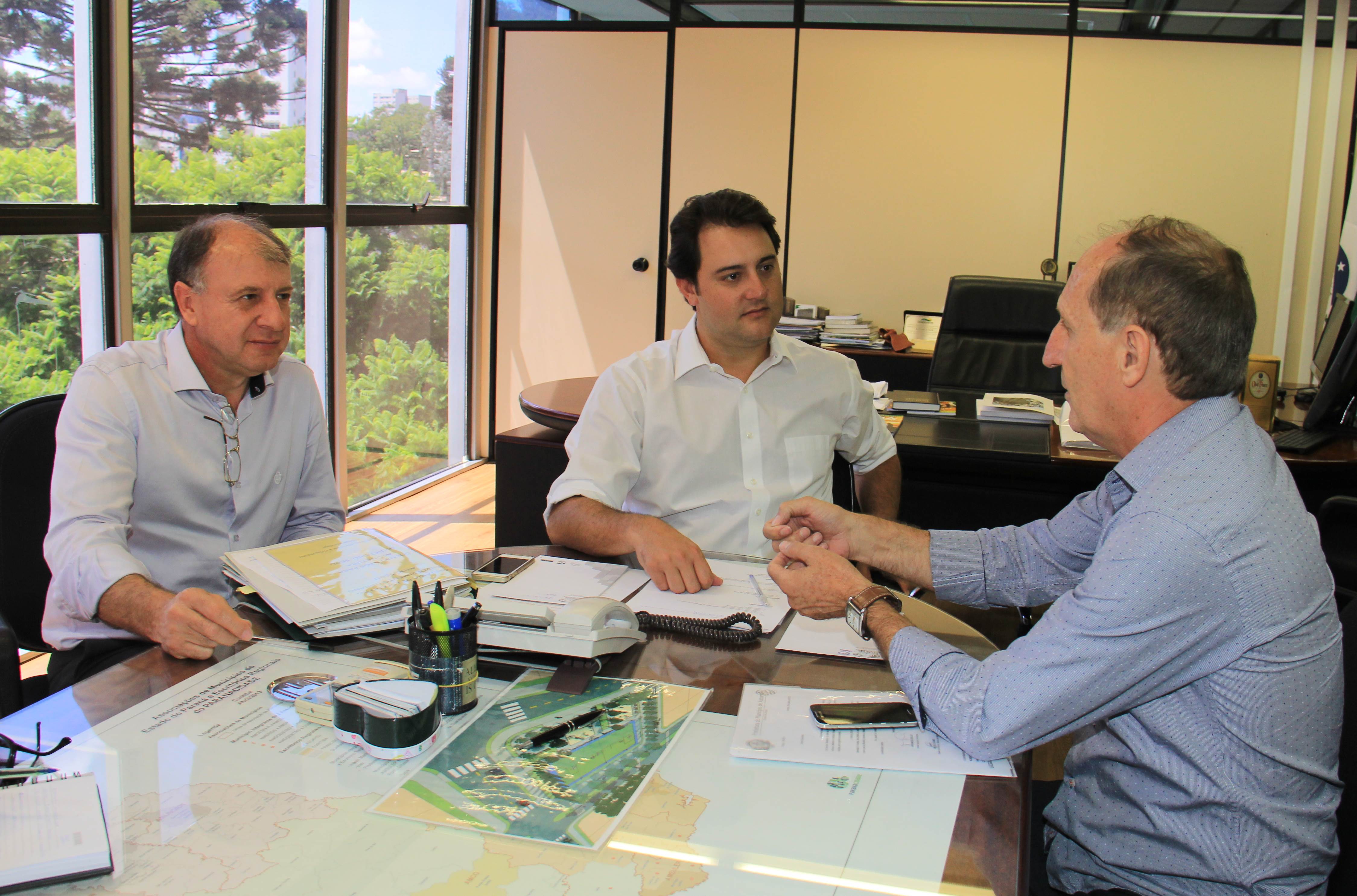 MAIS PAVIMENTAÇÃO - O prefeito de Pinhalão, Claudinei Benetti, mais o vice, Nilson Carneiro, foram recebidos por Ratinho Junior. Junto com o deputado estadual Alexandre Guimarães, eles pleitearam recursos pelo Sistema de Financiamento aos Municípios (SFM), no valor de pouco mais de R$ 2,4 milhões para a execução de recape asfáltico e mais benfeitorias que acompanham este serviço.