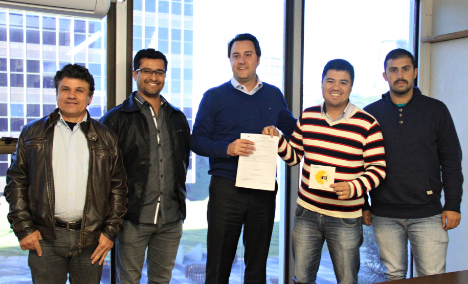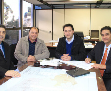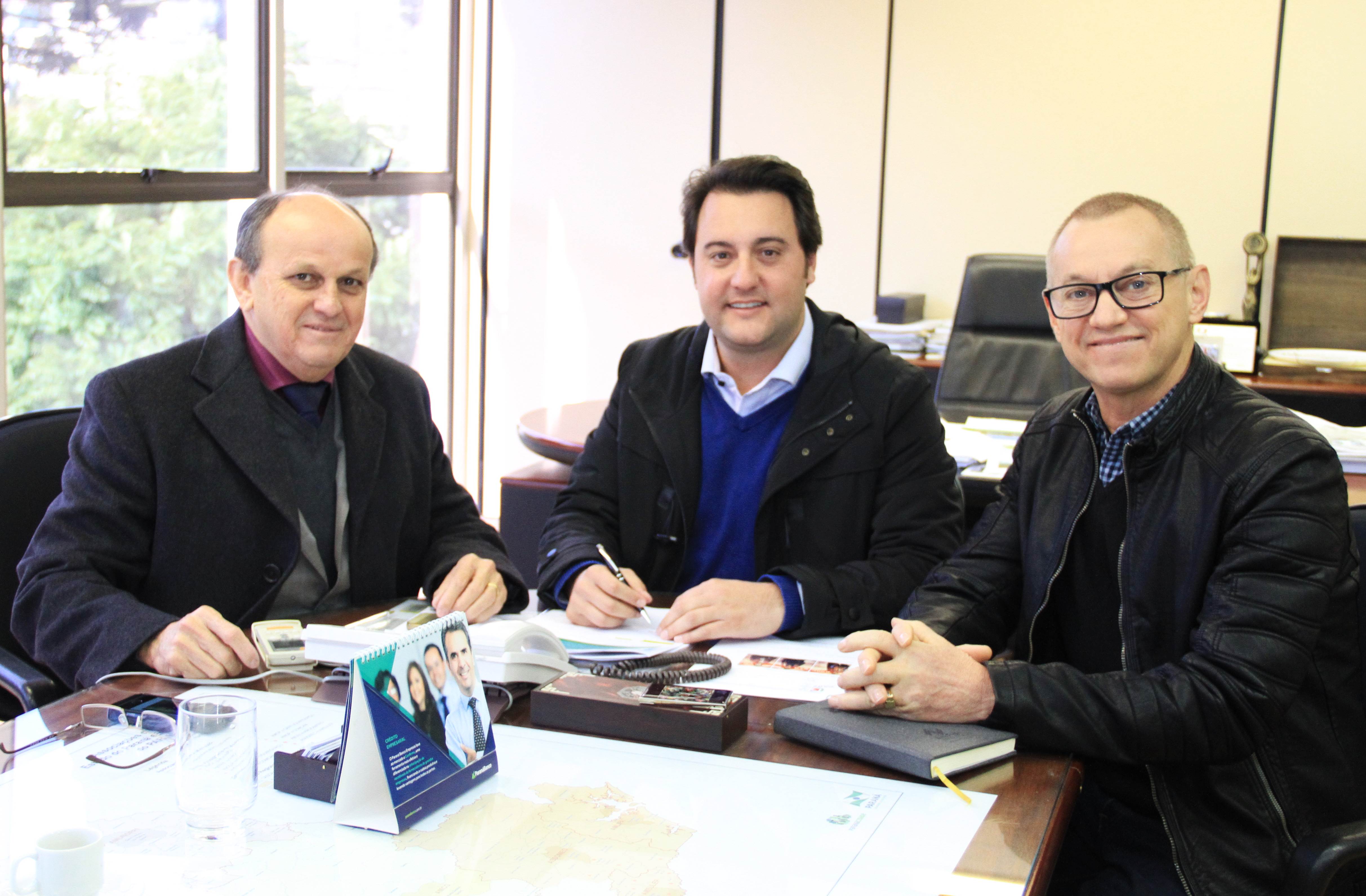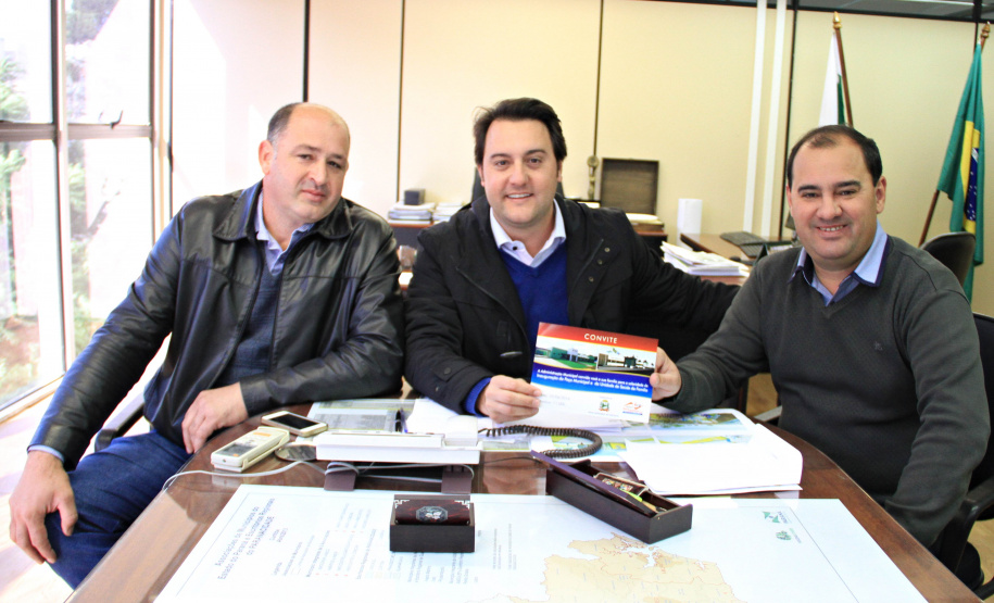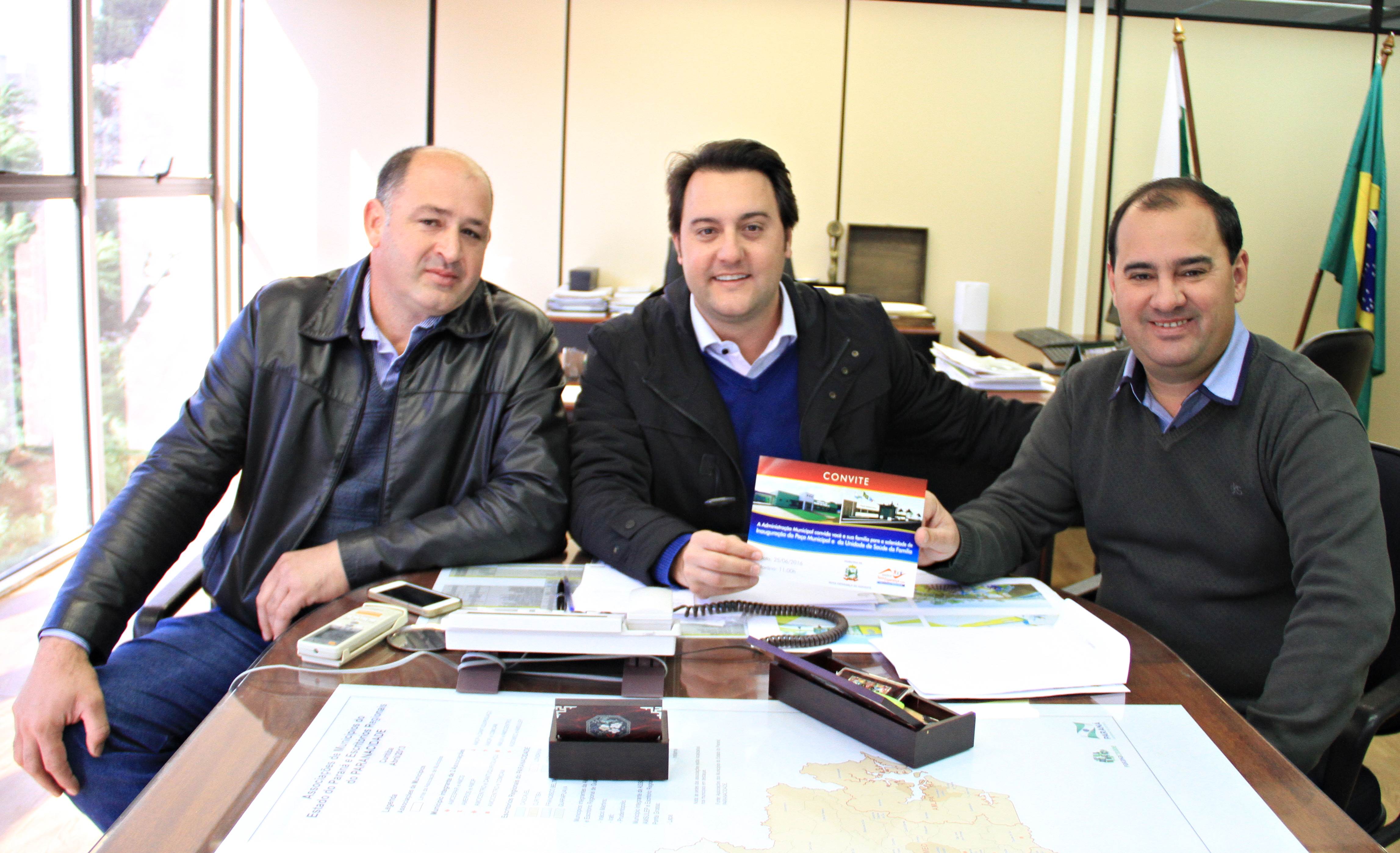 Ainda, nesta terça-feira, o secretário Ratinho Junior recebeu um convite do prefeito de Nova Esperança do Sudoeste, Jair Stange, acompanhado do líder daquela Região do Paraná, Cirineu Bonetti. O convite é para Ratinho Junior estar presente na inauguração do Paço Municipal, construído com recursos do Programa de Sistema de Financiamento aso Municípios (SFM), da SEDU, no valor de R$ 780 mil. “Estamos iniciando o nosso Centro Cívico”, disse o prefeito mostrando a foto do prédio.