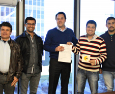 FAZER CAMPEÕES - O prefeito de São João do Ivaí, Fábio Miura, acompanhado do seu diretor municipal de Esportes, Mateus Capel; do secretário de Governo Municipal, Herinton Paulista; do vereador do Distrito de Santa Luzia da Alvorada, Ronaldo André; e do conselheiro tutelar, Valdir Jolo; esteve na SEDU em busca do CD que mostra toda a Programação de “Meu Campinho”. Ratinho Junior entregou o CD e fez uma sugestão ao prefeito. “Esta ideia nós trouxemos da Alemanha. Lá, os ‘campinhos’ são entregues às crianças das escolas para que tenham a noção de patrimônio coletivo e todas passem a cuidar como donas. Em toda a Alemanha há 1.600 campinhos, que fazem a alegria da criançada e, ainda, formam campeões”, explicou.