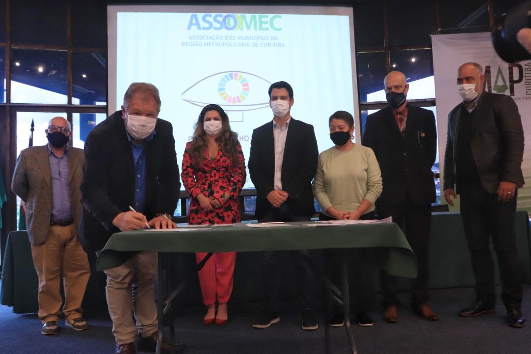 Prefeitos dos Municípios que compõem a Associação dos Municípios da Região Metropolitana de Curitiba (ASSOMEC) se reuniram nesta sexta-feira, 12, no Salão de Atos do Parque Barigui, na Alameda Ecológica Burle Marx, onde firmaram compromisso com o Desenvolvimento Sustentável, das Cidades Inclusivas e Igualitárias, vinculado aos ODS e suas Metas. Dentro desses objetivos o governador do Paraná, Carlos Massa Ratinho Junior, já definiu estratégias e soluções em apoio aos Municípios para a implementação da Agenda 2030, da ONU, quando, em 28 de setembro de 2021, assinou Termo de Cooperação. Este é o segundo encontro de prefeitos de Associações, o primeiro foi com a AMUSEP, em Maringá. Todas as 19 Associações de Municípios estão agendadas para esse compromisso com os ODS.