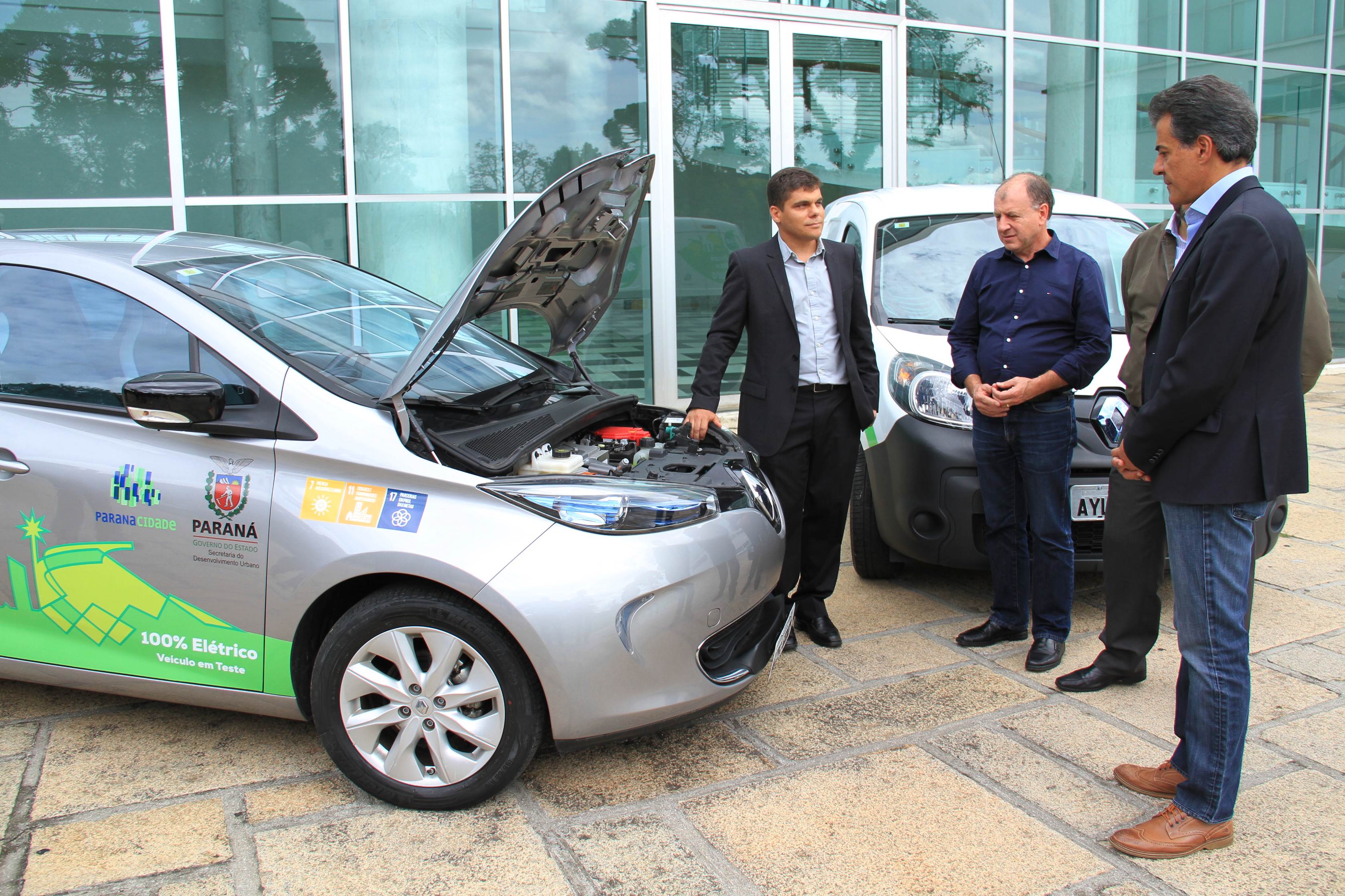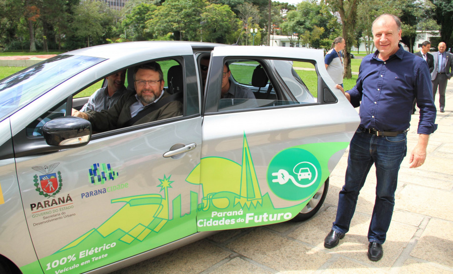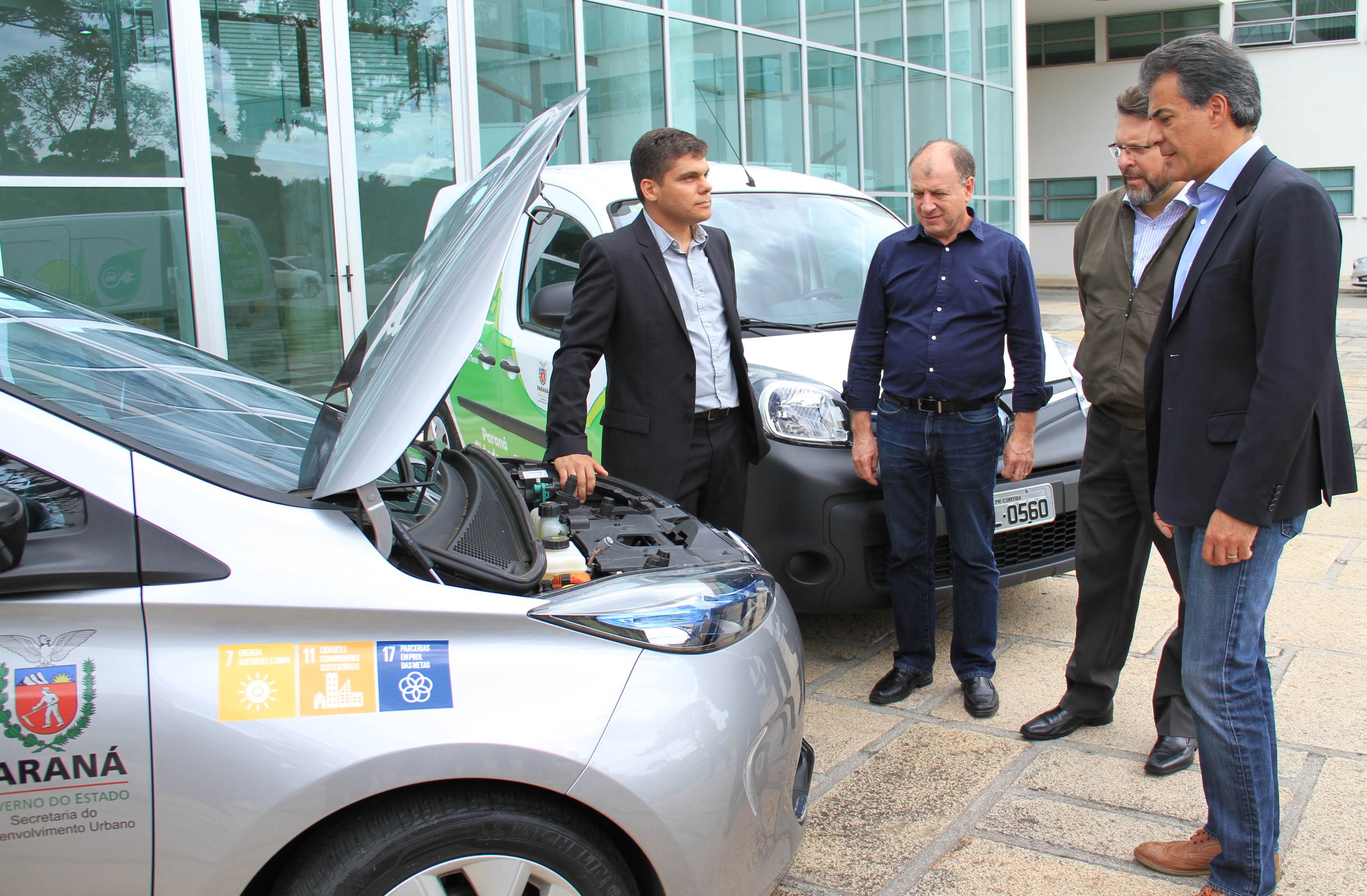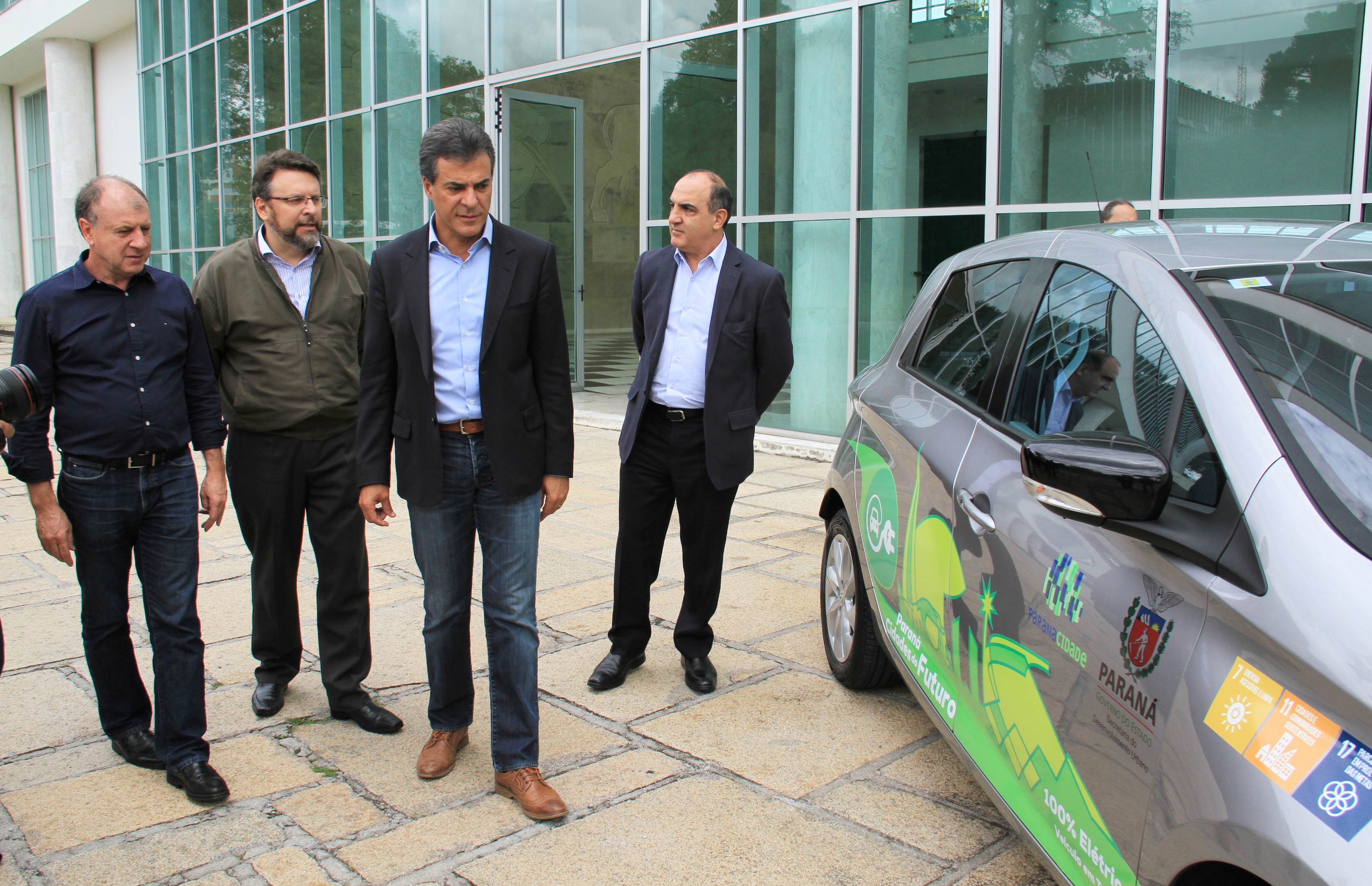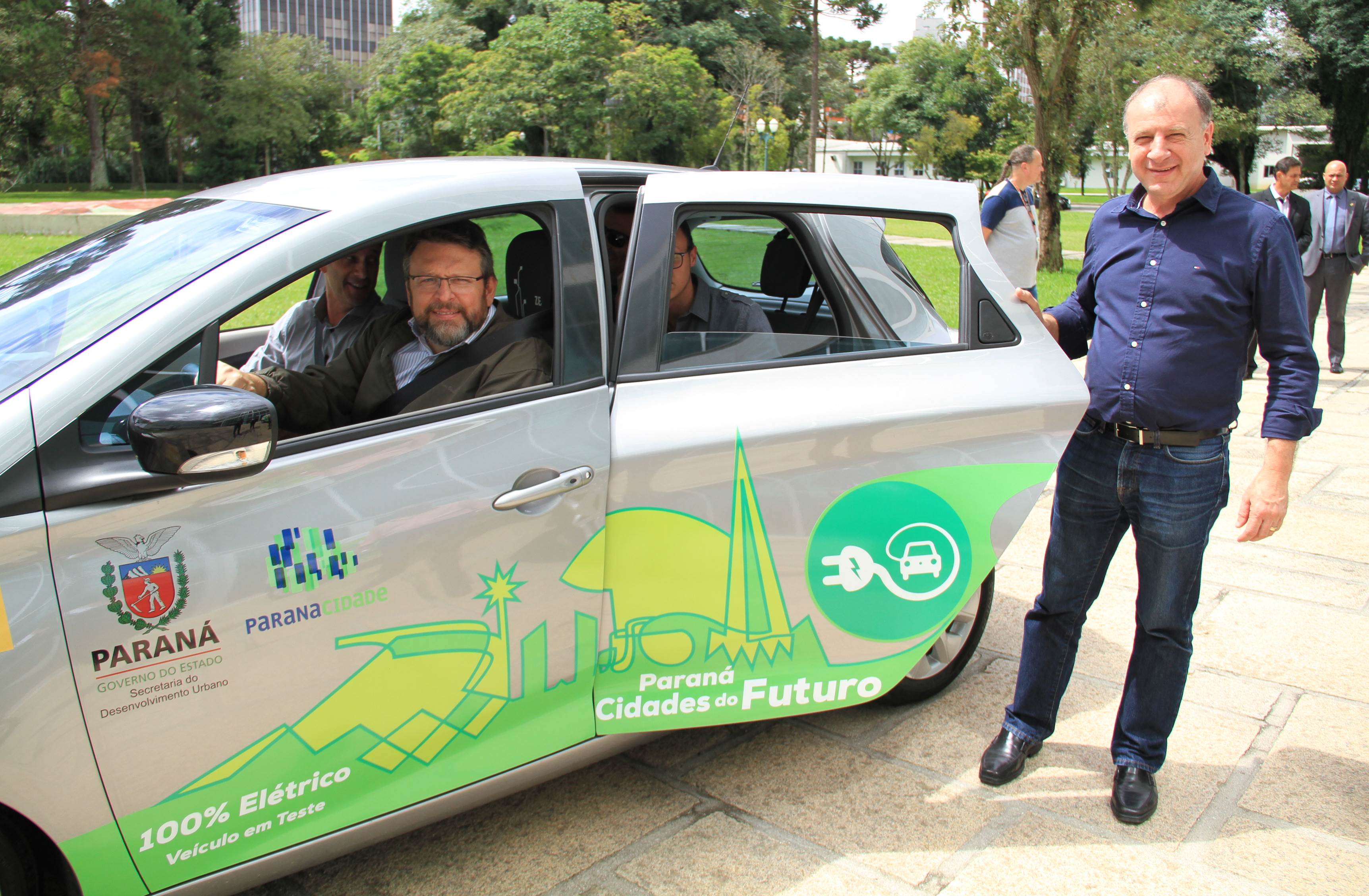 Em sintonia com a Agenda 2030 para o Desenvolvimento Sustentável e frente aos desafios da mobilidade urbana, o secretário de Estado da Secretaria do Desenvolvimento Urbano e superintendente executivo do Serviço Social Autônomo (SEDU/Paranacidade), respectivamente, João Carlos Ortega e Wilson Lipski apresentaram ao governador Beto Richa, dentro do programa “Paraná Cidades do Futuro”, mais uma iniciativa inovadora na administração pública do Paraná: dois carros 100% movidos à eletricidade. A apresentação se deu na tarde desta quarta-feira, 28, no pátio do Palácio Iguaçu. “Esses dois carros pilotos serão usados, pelos nossos técnicos, no dia a dia das atividades e para as visitas em obras. Vamos avaliar o potencial dos carros e as melhorias que podem trazer também aos prefeitos do Paraná, em eletro mobilidade e em economia para todos”, disse Ortega.