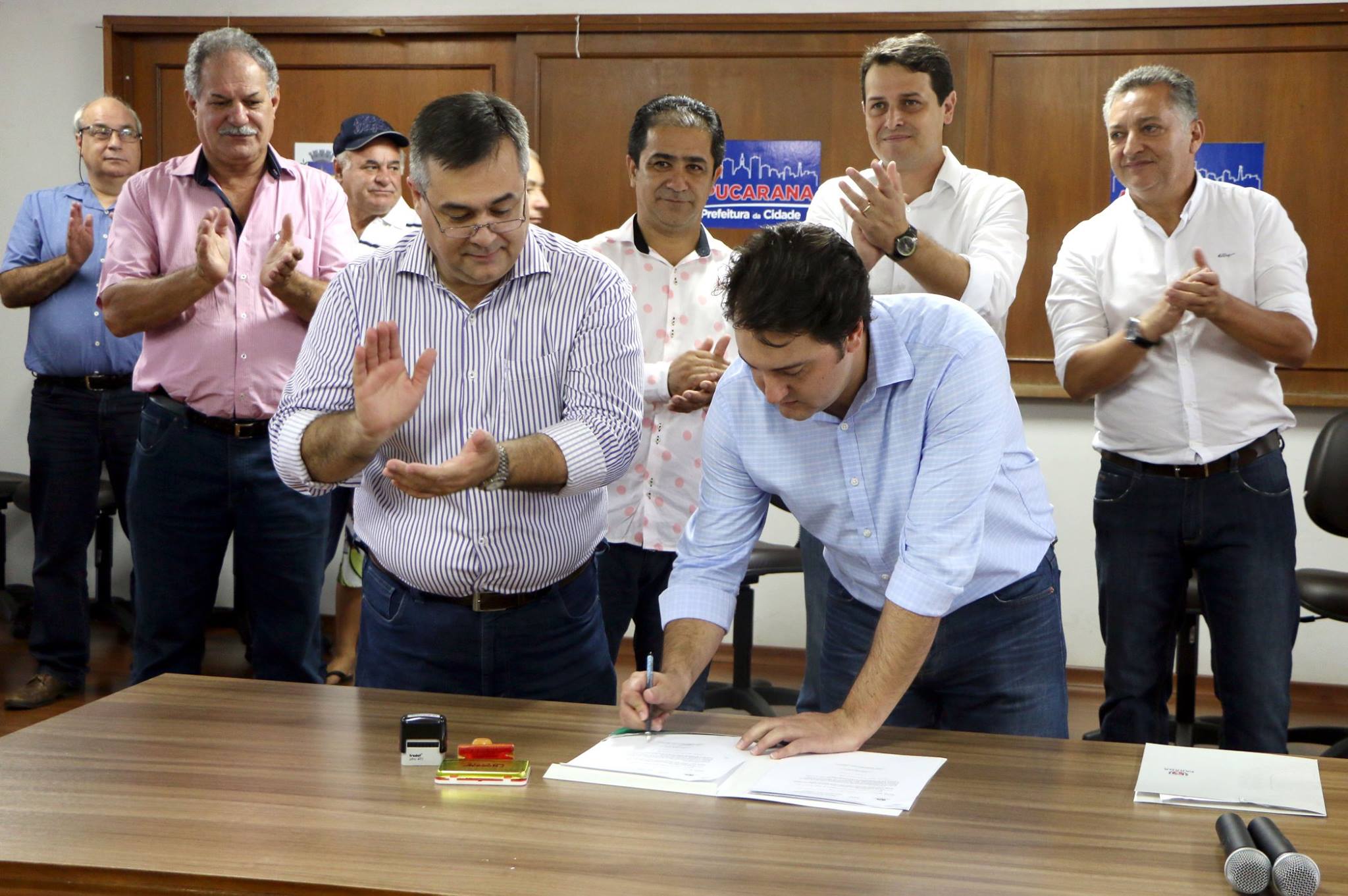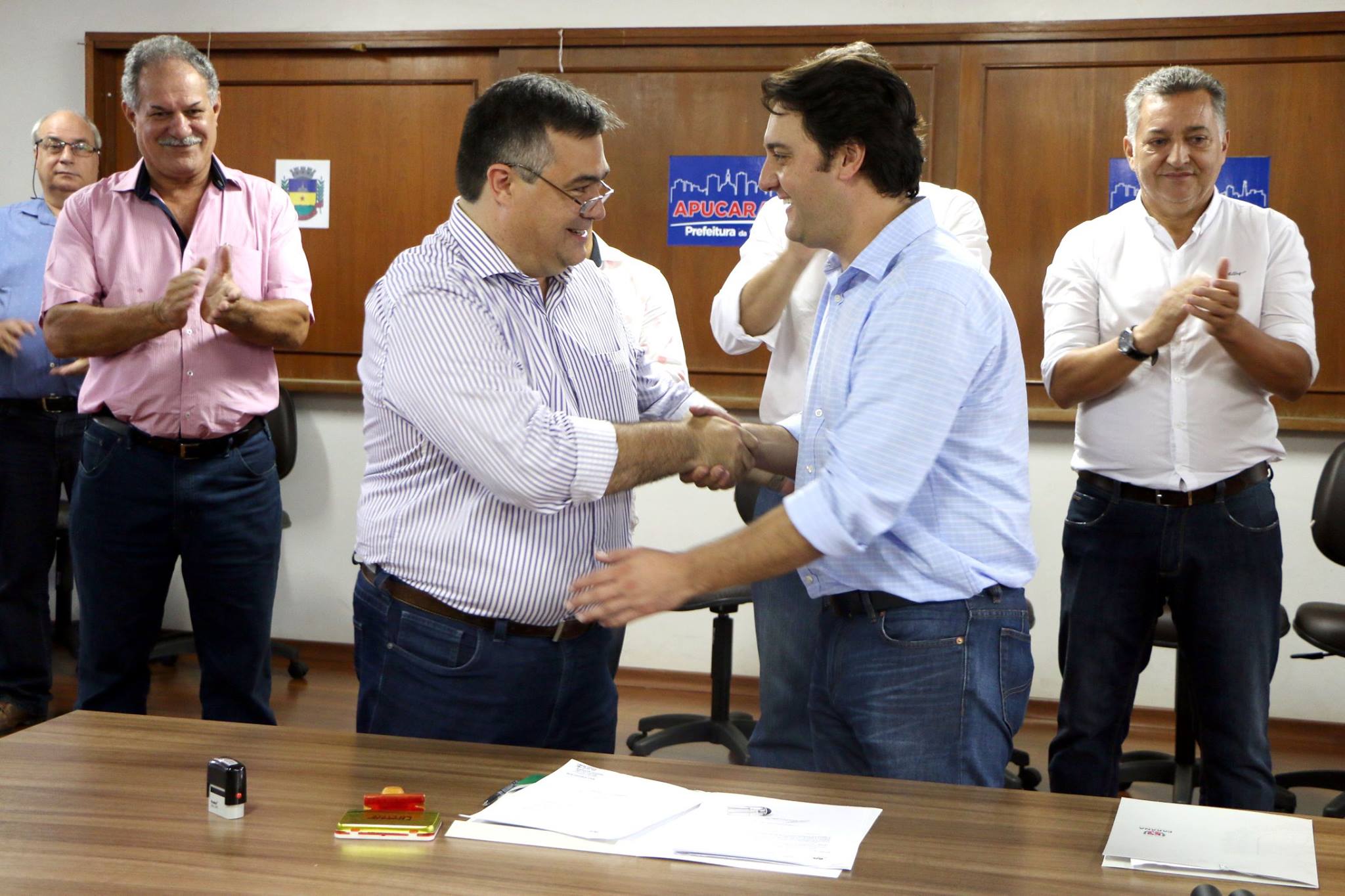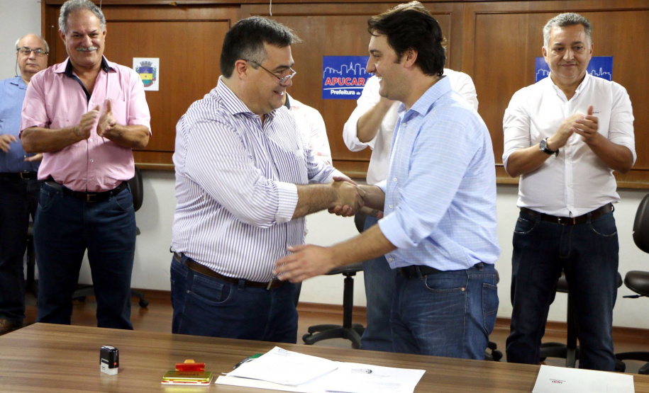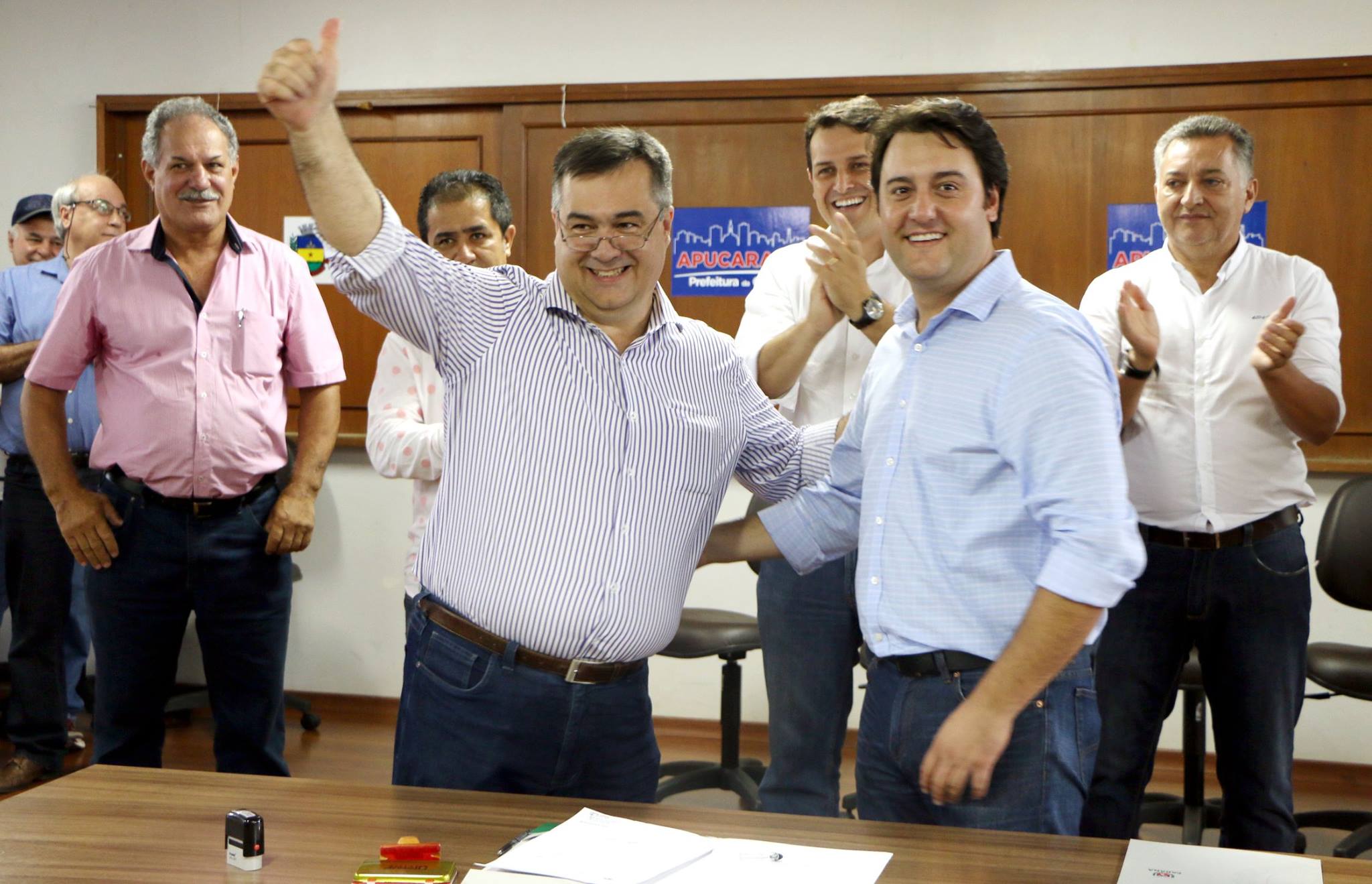 O secretário estadual do Desenvolvimento Urbano, Ratinho Junior, esteve em Apucarana nesta quarta-feira, 23, para entregar ao prefeito Beto Preto, edital de licitação no valor de mais de R$ 2,3 milhões para a compra de nove equipamentos rodoviários ao município. Na ocasião, Ratinho Junior também entregou edital de homologação de R$ mais de R$ 1,18 milhão para obras de pavimentação em Borrazópolis. Diante de autoridades e lideranças que lotaram o Salão Nobre da Prefeitura de Apucarana, Ratinho Junior liberou mais de R$ 3,5 milhões para os dois municípios da Região do Vale do Ivaí. Acompanhava o secretário Ratinho Junior o seu assessor especial Lúcio Tasso. Juntos, ainda, vistoriaram obras naquela cidade.