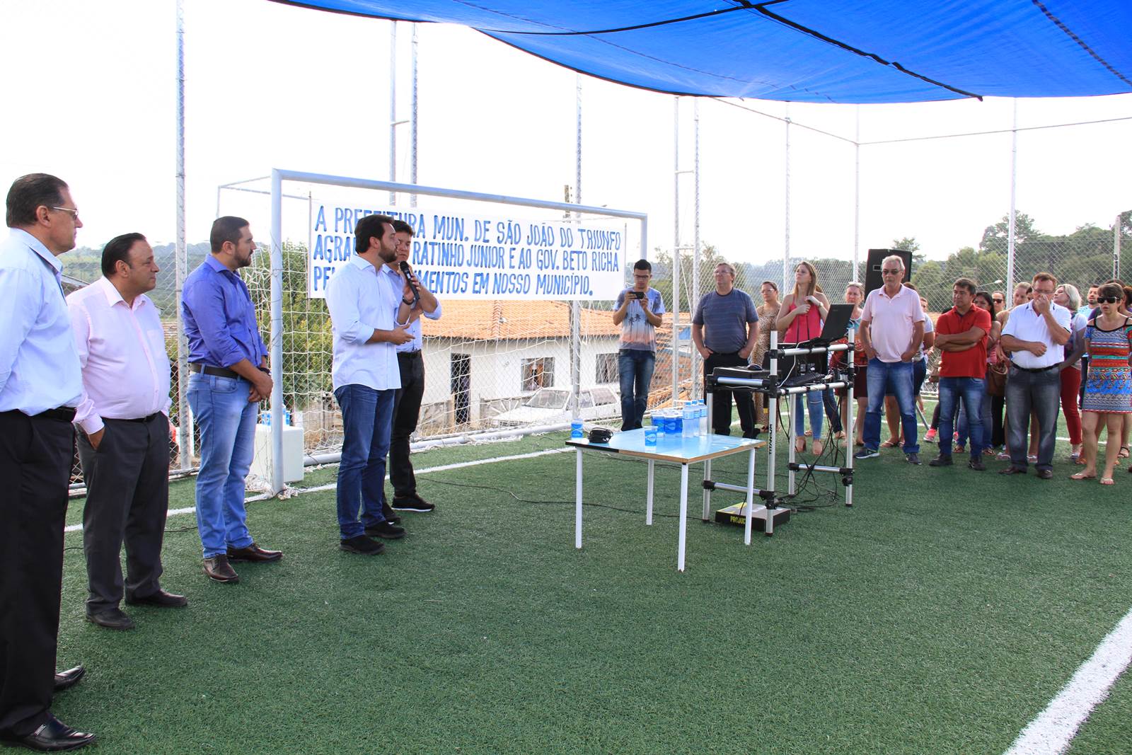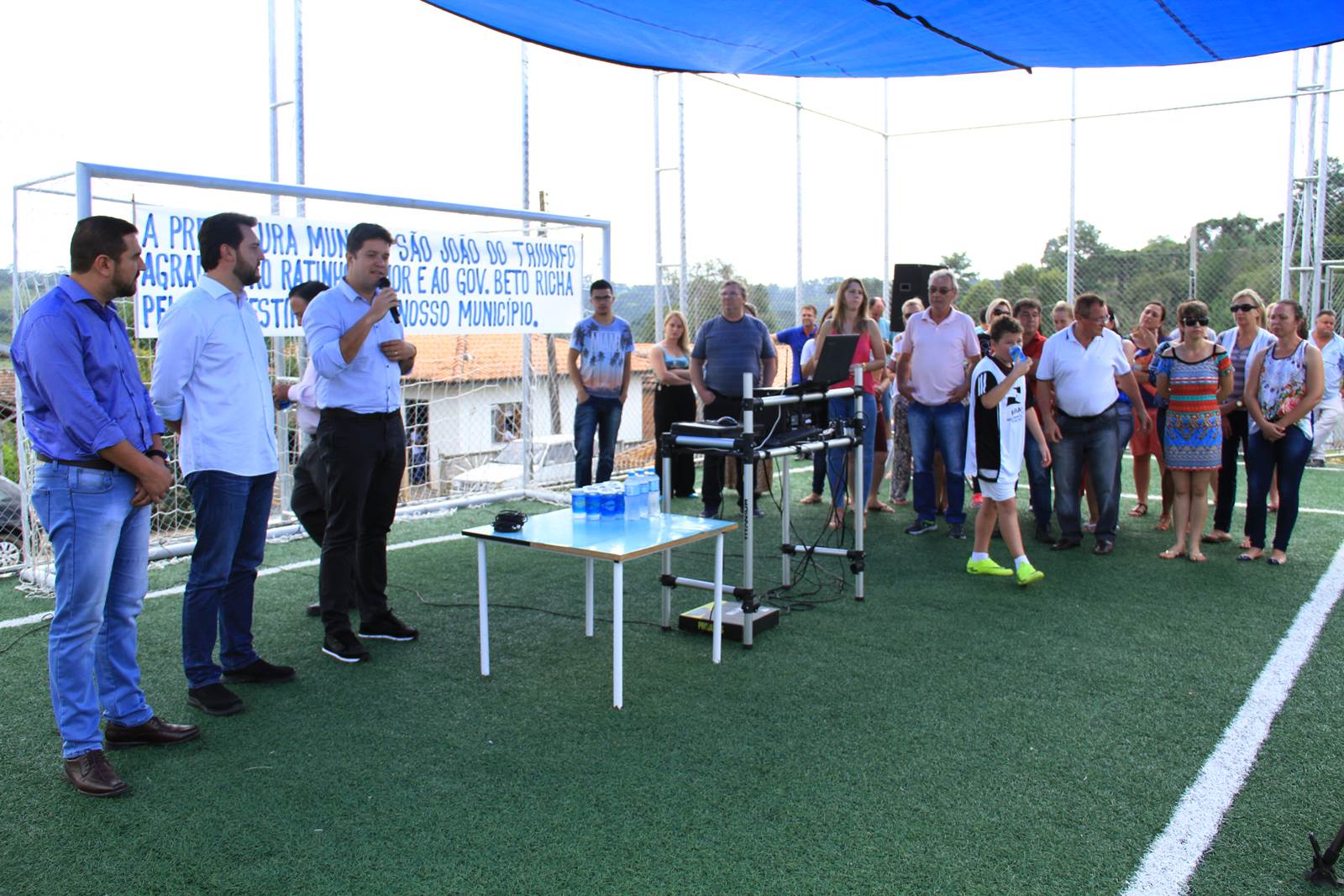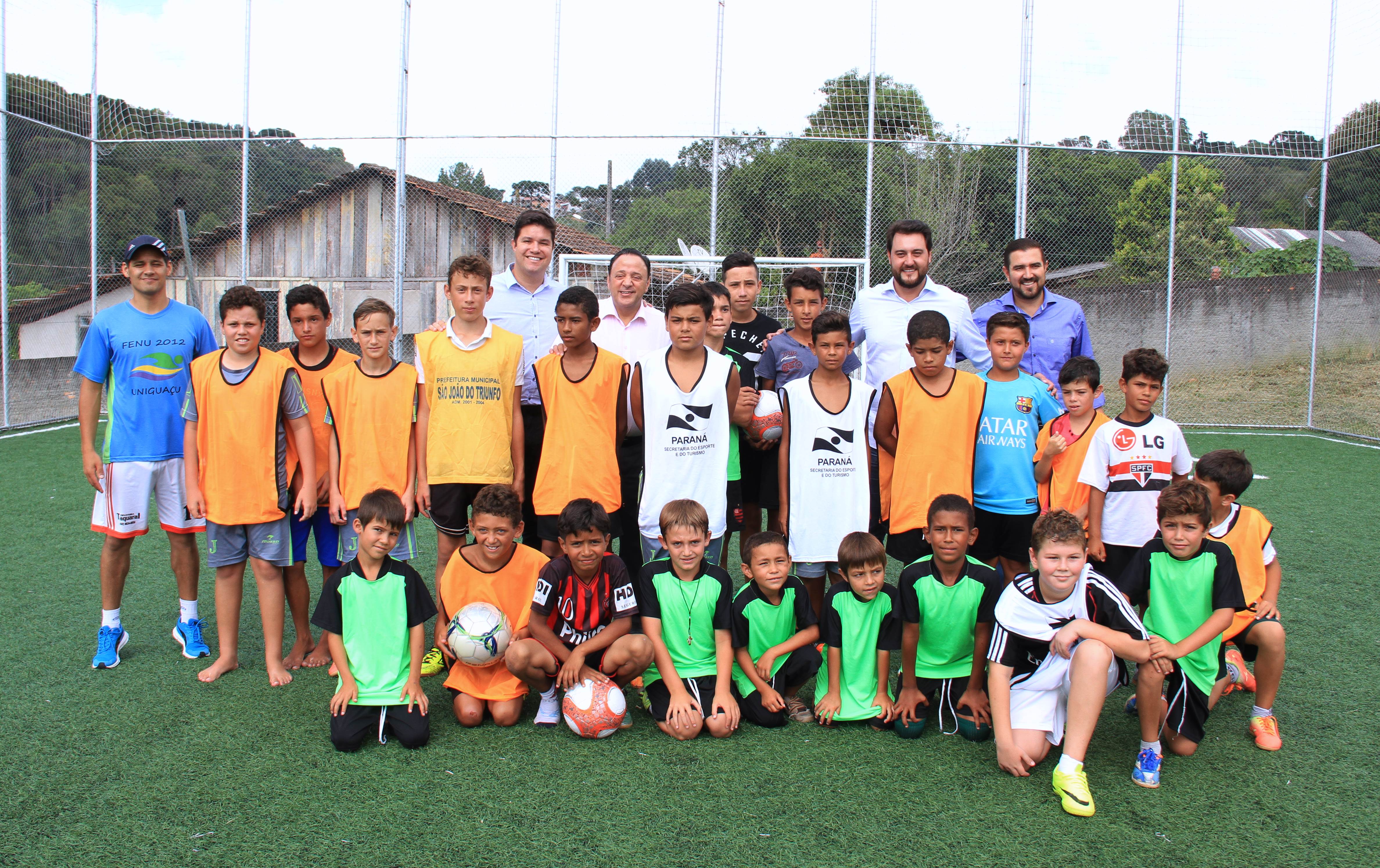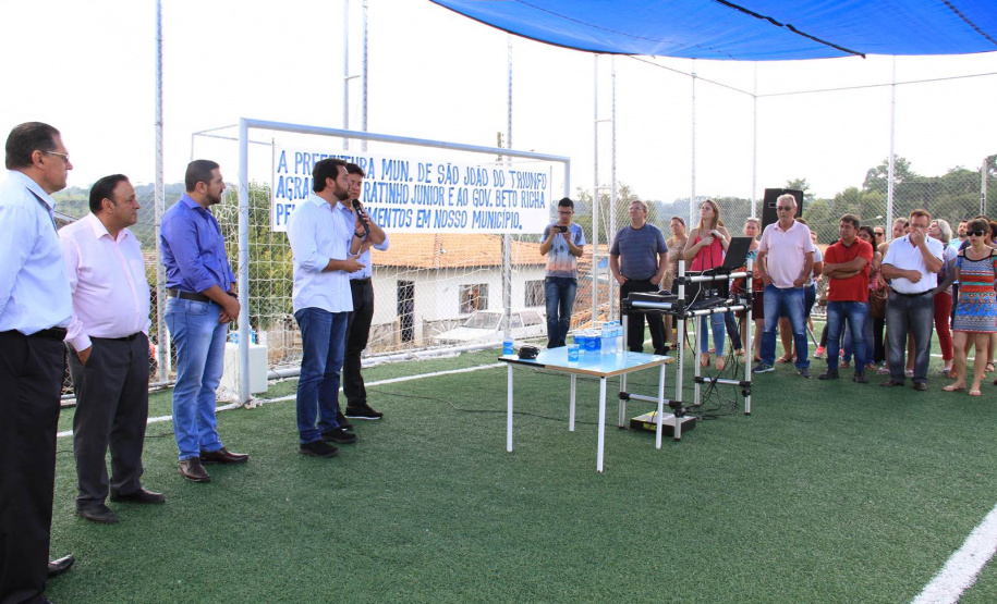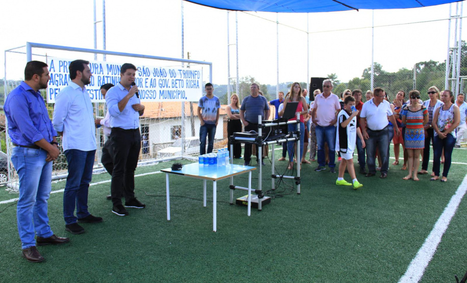 O secretário do Desenvolvimento Urbano (SEDU), Ratinho Junior, inaugurou às 10h30 desta terça-feira, 07, em São João do Triunfo, o primeiro conjunto completo do Programa “Meu Campinho”. Uma ideia trazida da Alemanha, por Ratinho Junior, para baratear o custo da obra e dar oportunidade de lazer e de um futuro melhor às crianças e adolescentes, retirando-os dos riscos das ruas. O conjunto ainda oferece espaços de lazer às pessoas da terceira idade, com uma Academia ao Ar Livre, e às crianças menores, com um Parque Infantil. “Aplicando grama sintética, crianças podem jogar futebol da mesma maneira que jogam as crianças de um País como a Alemanha, até descalças, e começar a mudar o rumo de suas vidas para um futuro melhor e com mais dignidade. Há também lazer para toda a família, dos vovôs até os netinhos, em um mesmo local”, atesta Ratinho Junior.