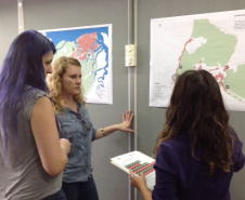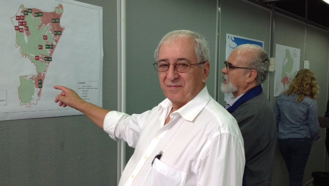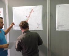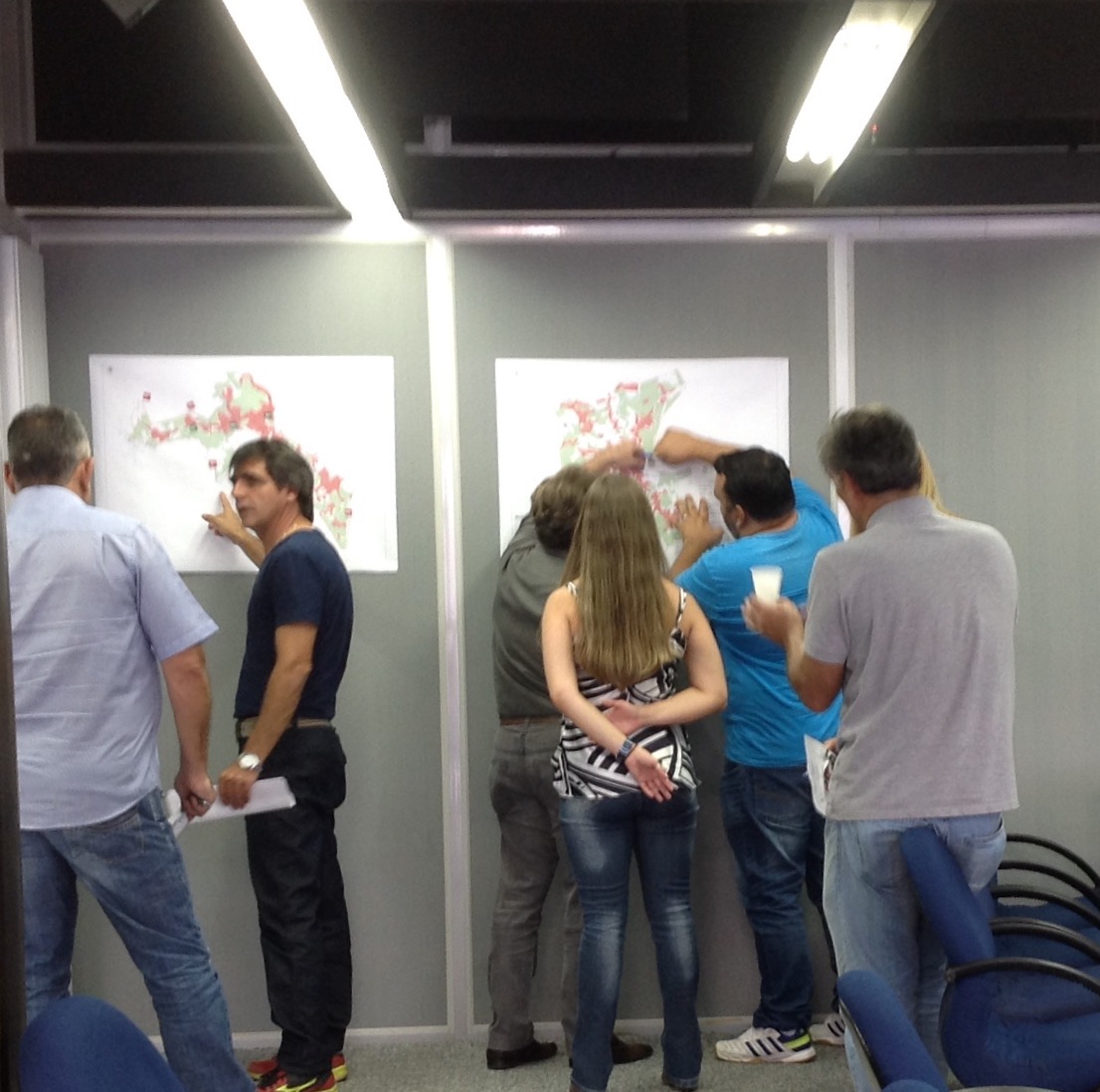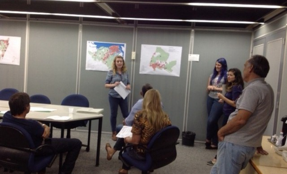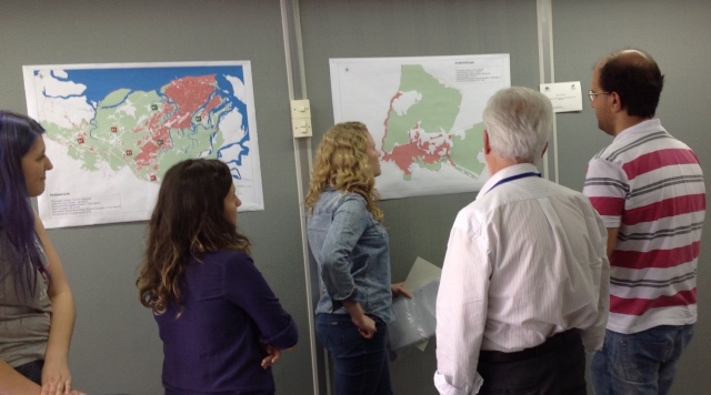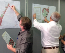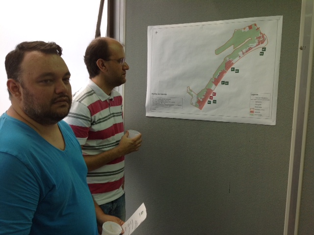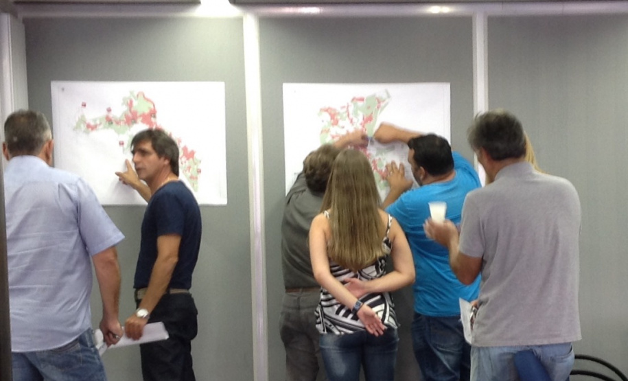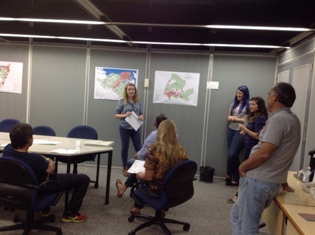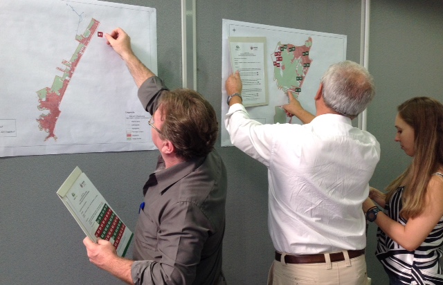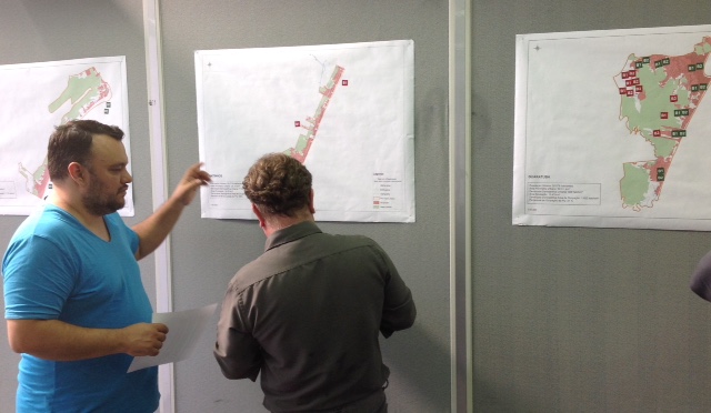 Ao final da reunião, todos participaram de uma oficina. Diante de mapas de seus respectivos municípios, eles foram convidados a colocar bandeirinhas coloridas – vermelhas e verdes - indicando neles as situações sustentáveis e as insustentáveis. E, após, eles explicaram os seus posicionamentos na colocação de áreas sustentáveis e insustentáveis.