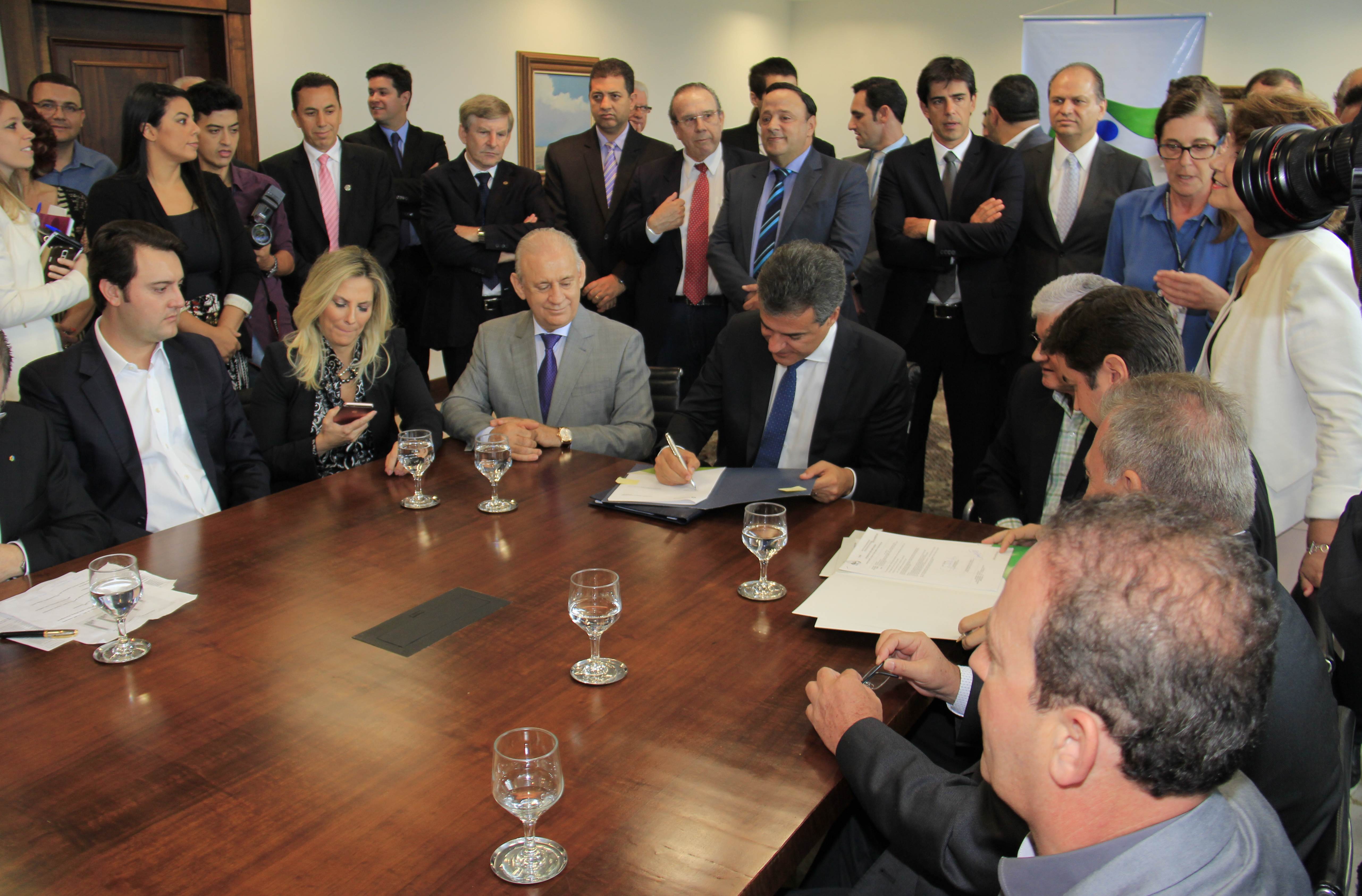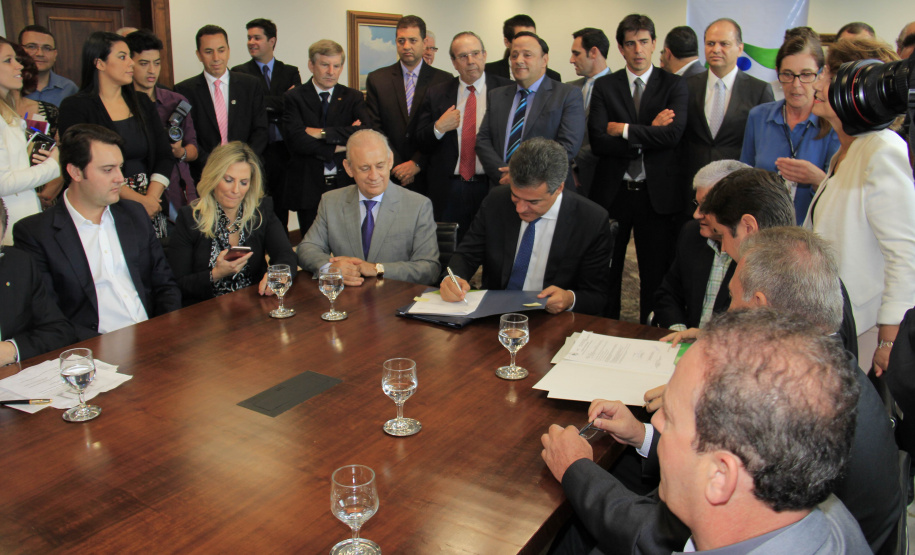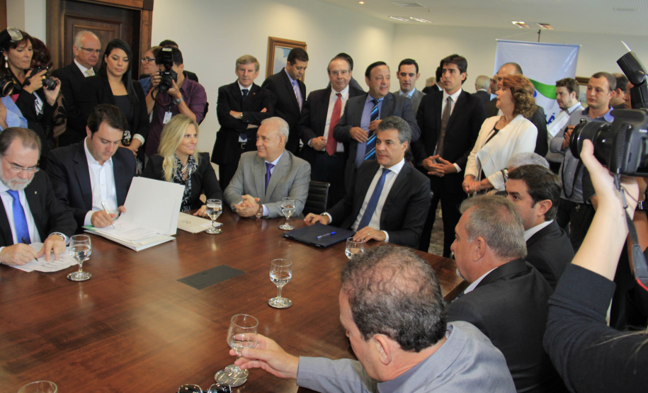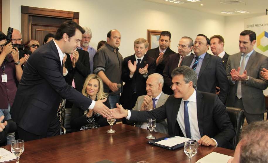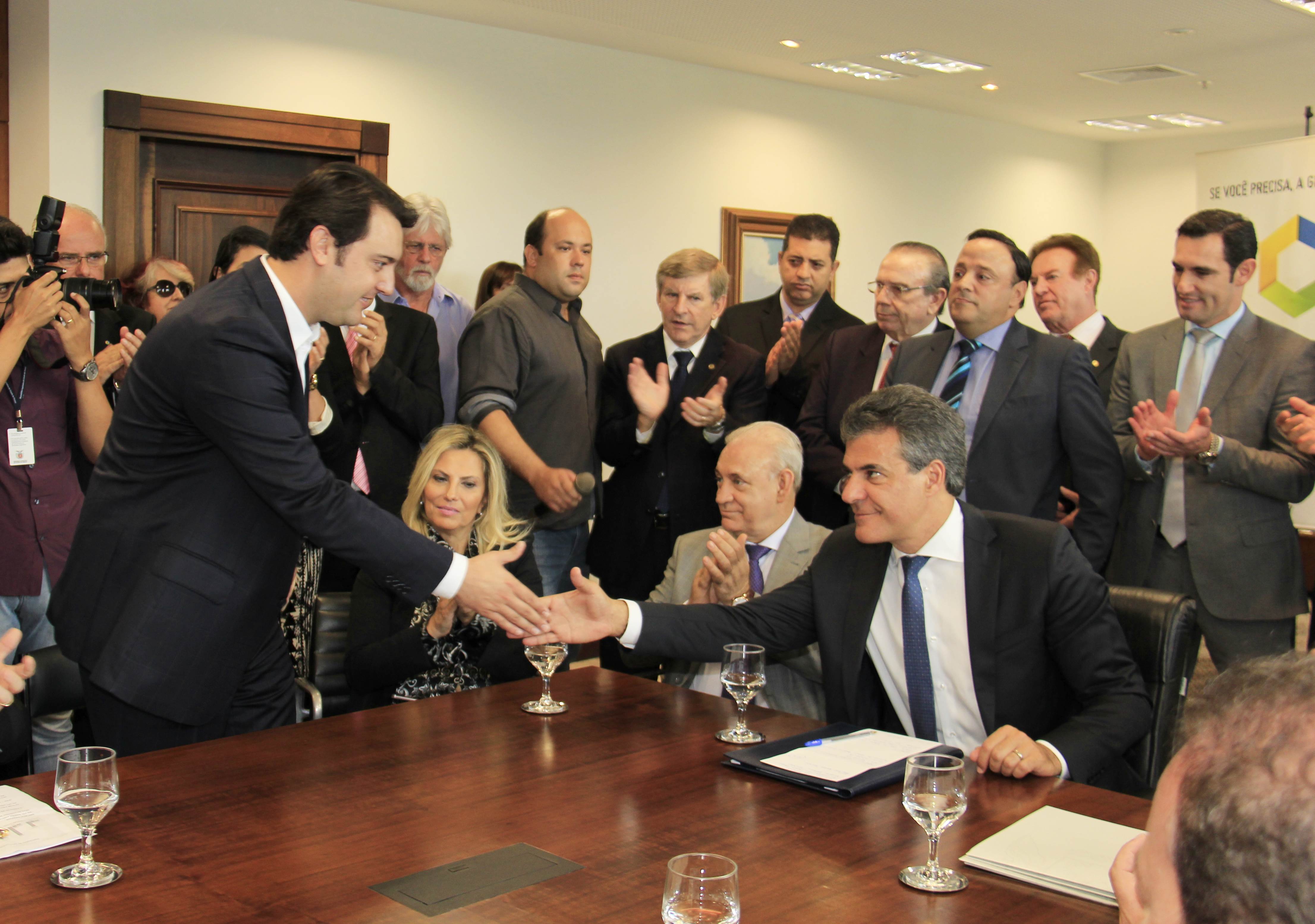 O governador Beto Richa e prefeitos de 19 cidades assinaram nesta segunda-feira, 11, no Palácio Iguaçu, em Curitiba, novos contratos de financiamento pela Fomento Paraná. São R$ 43,4 milhões para serem investidos em obras e aquisição de máquinas e equipamentos às prefeituras. Já, pela Secretaria do Desenvolvimento Urbano (SEDU), junto com o secretário da Pasta, Ratinho Junior, o governador assinou editais de licitação e homologação para 24 municípios, no valor total de mais de R$ 35,5 milhões, onde há uma contrapartida municipal de pouco mais de R$ 1,7 milhão. “Entendemos que, sozinhos, os municípios não têm condições de fazer todas as obras de infraestrutura necessárias para a população. A crise pela qual o Brasil passa também diminuiu a arrecadação das prefeituras. Então, com esses recursos há a alternativa de potencializar os investimentos nos municípios e gerar mais trabalho e renda”, destacou Ratinho Junior.