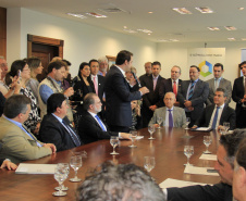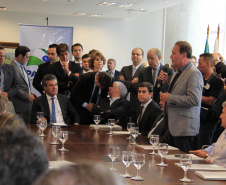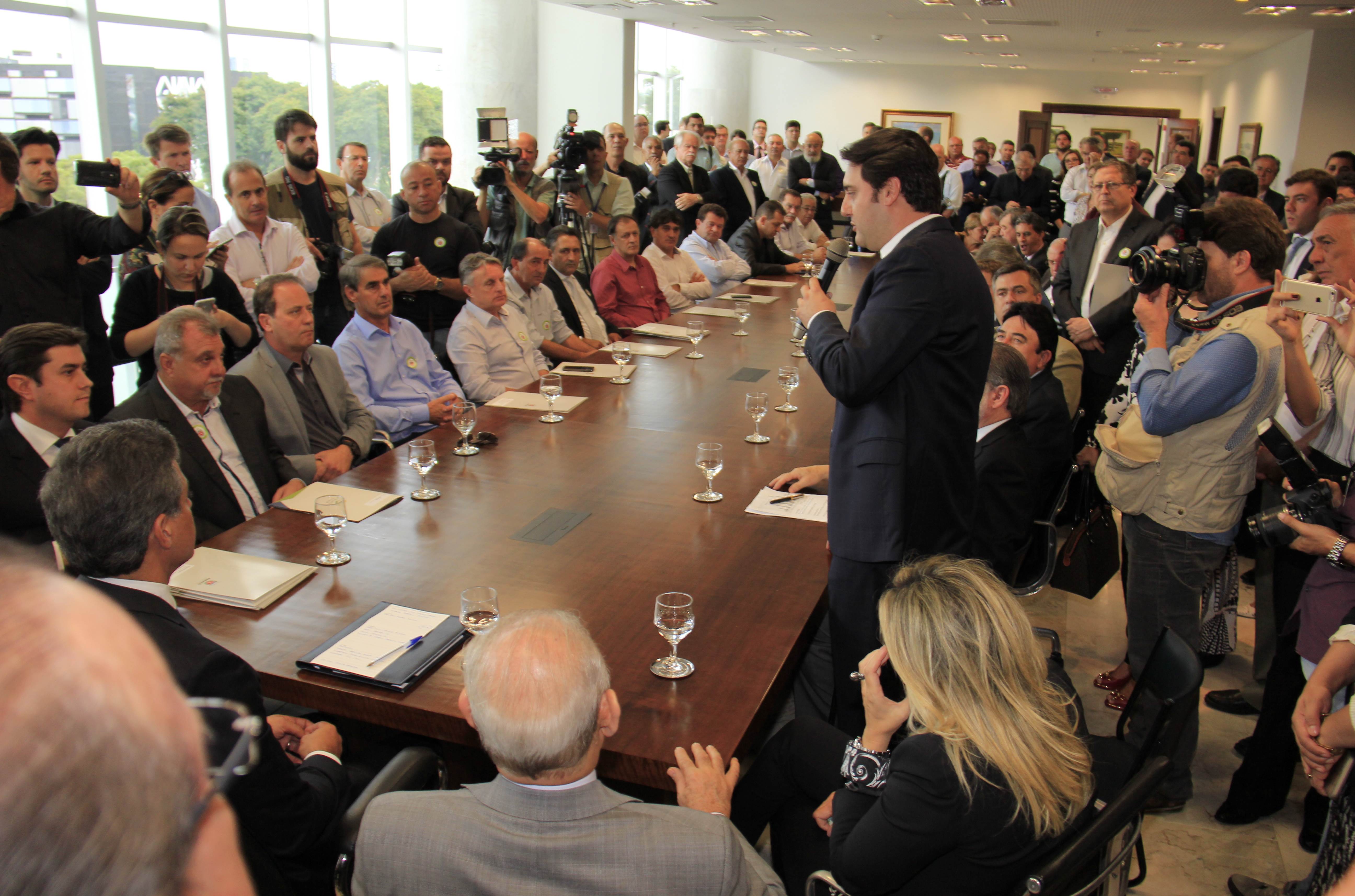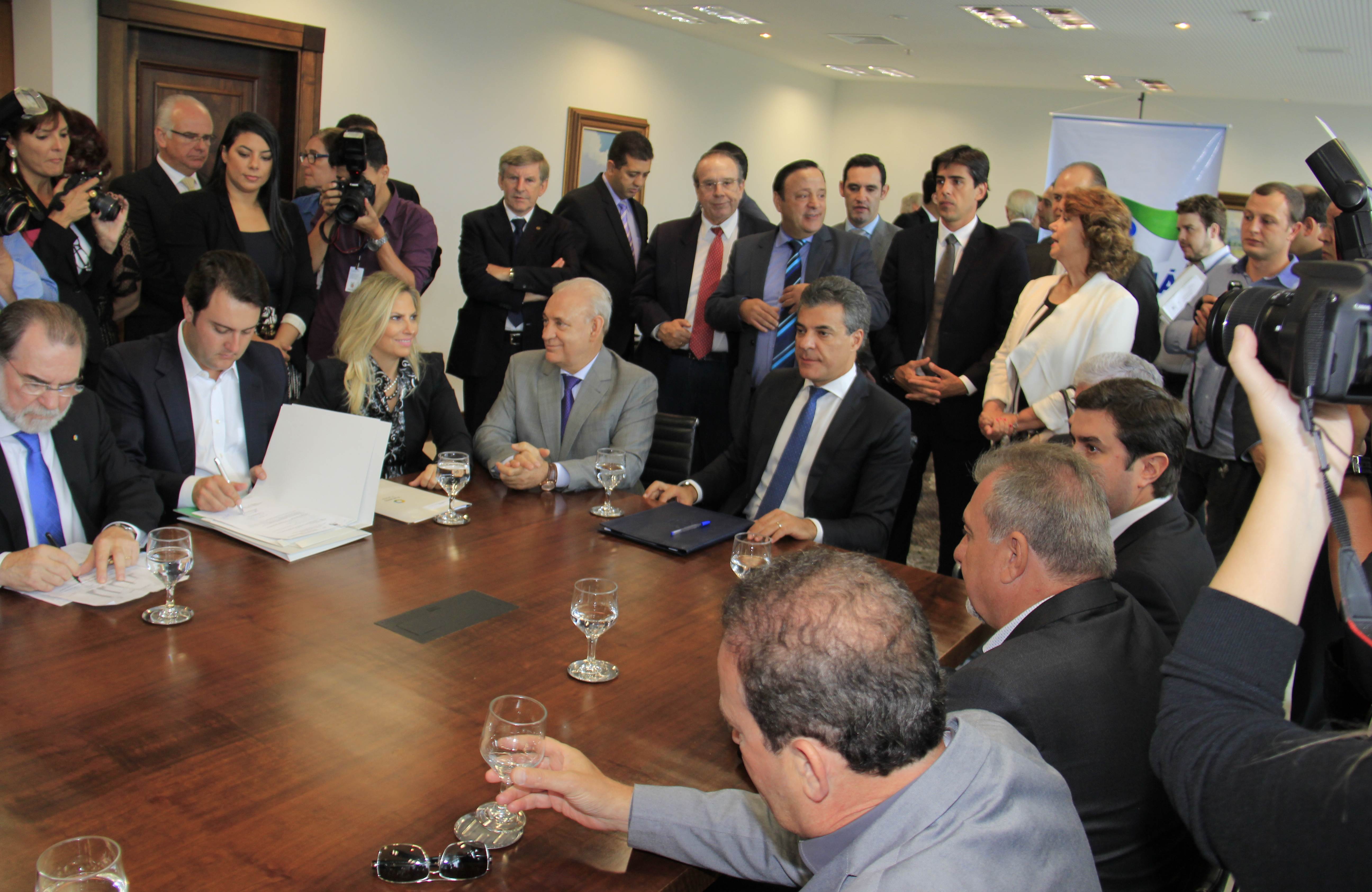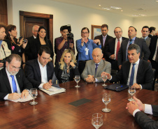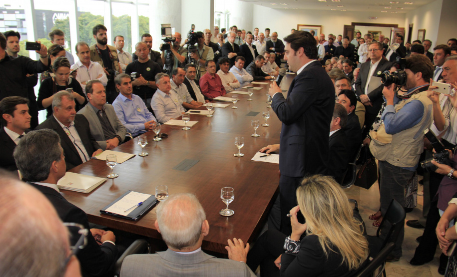 O governador Beto Richa e prefeitos de 19 cidades assinaram nesta segunda-feira, 11, no Palácio Iguaçu, em Curitiba, novos contratos de financiamento pela Fomento Paraná. São R$ 43,4 milhões para serem investidos em obras e aquisição de máquinas e equipamentos às prefeituras. Já, pela Secretaria do Desenvolvimento Urbano (SEDU), junto com o secretário da Pasta, Ratinho Junior, o governador assinou editais de licitação e homologação para 24 municípios, no valor total de mais de R$ 35,5 milhões, onde há uma contrapartida municipal de pouco mais de R$ 1,7 milhão. “Entendemos que, sozinhos, os municípios não têm condições de fazer todas as obras de infraestrutura necessárias para a população. A crise pela qual o Brasil passa também diminuiu a arrecadação das prefeituras. Então, com esses recursos há a alternativa de potencializar os investimentos nos municípios e gerar mais trabalho e renda”, destacou Ratinho Junior.